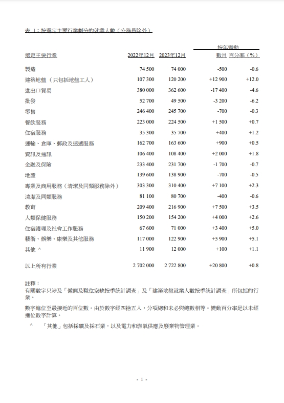 與上年同期比較,多個選定行業的就業人數有所增加。增加主要見於建築地盤(只包括地盤工人)(12.0%或12900人)、藝術、娛樂、康樂及其他服務業(5.1%或5900人)、住宿護理及社會工作服務業(5.0%或3400人)和教育業(3.5%或7500人)。另一方面,就業人數減少的行業主要有批發業(-6.2%或-3200人)和進出口貿易業(-4.6%或-17400人)。表1載列有關選定主要行業的就業人數。