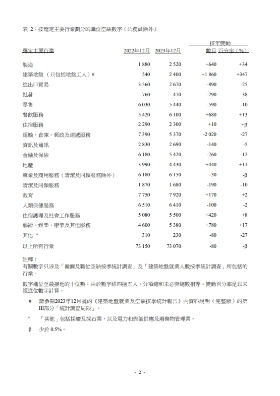 在2023年12月的73070個私營機構職位空缺當中,教育業佔7920個,人類保健服務業佔6410個,專業及商用服務業(清潔及同類服務業除外)佔6150個,餐飲服務業佔6100個,而住宿護理及社會工作服務業佔5500個。