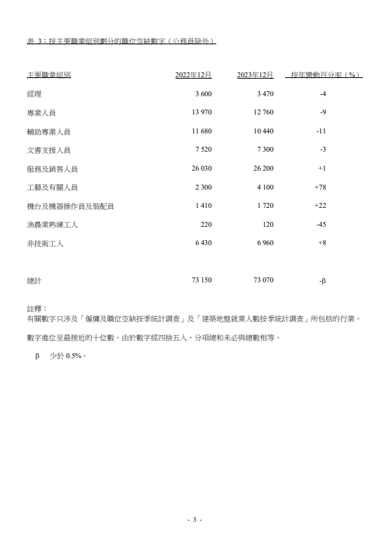 按主要職業組別分析,私營機構的職位空缺主要為服務及銷售人員(26200個)、專業人員(12760個)和輔助專業人員(10440個)。表3載列按主要職業組別劃分的職位空缺數字。