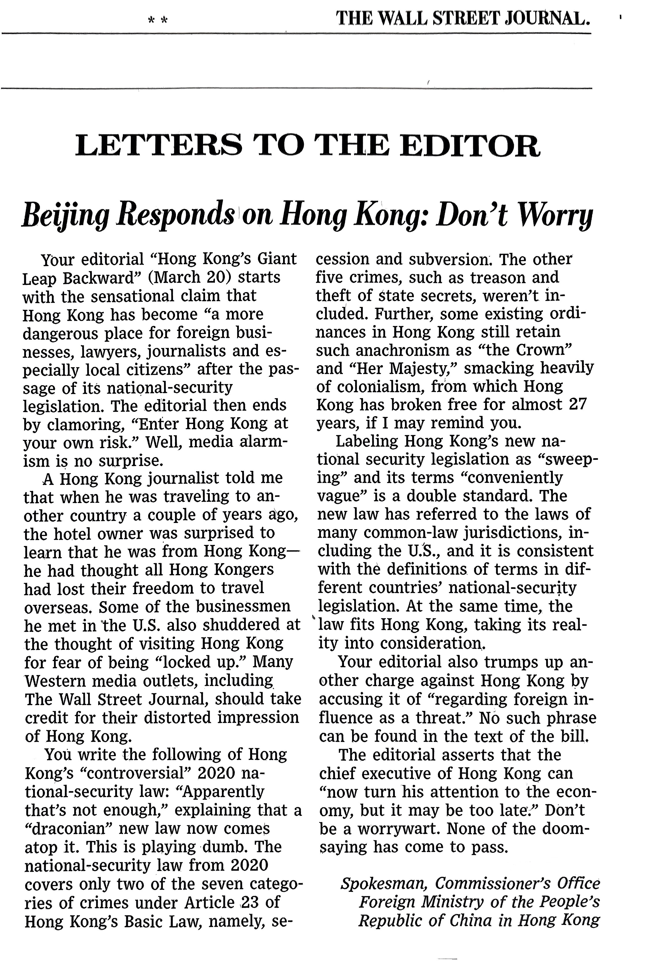 據外交部駐港公署官網29日消息,《華爾街日報》昨日(28日)刊登外交部駐港公署發言人致該報信函。信函駁斥《華爾街日報》社論日前抹黑香港《維護國家安全條例》、唱衰香港發展前景的惡劣言論,闡明香港基本法第23條立法的必要性、重要性和正當性。