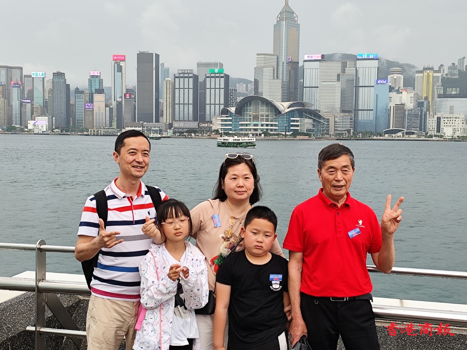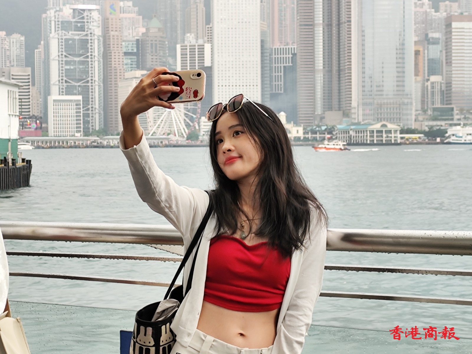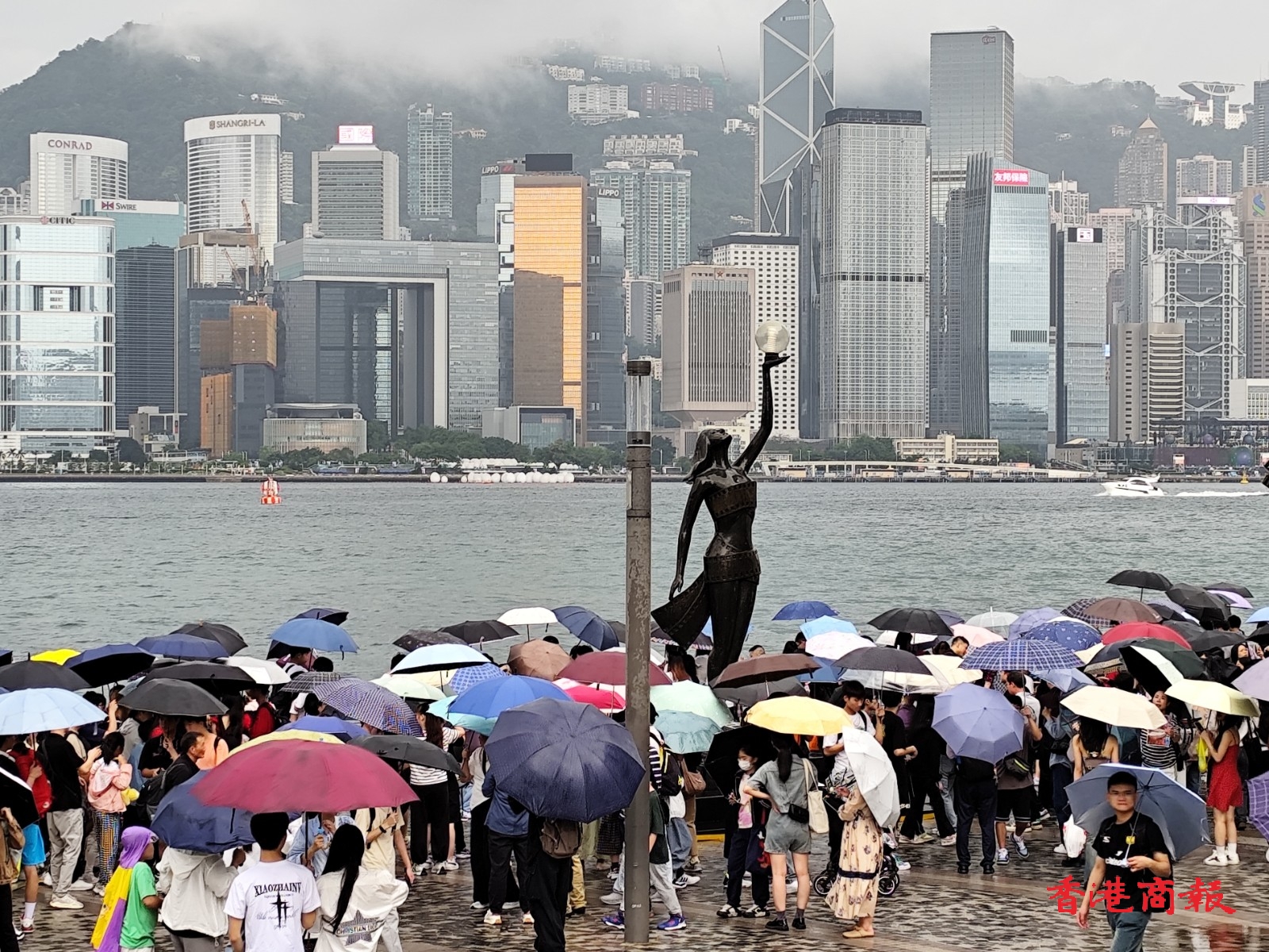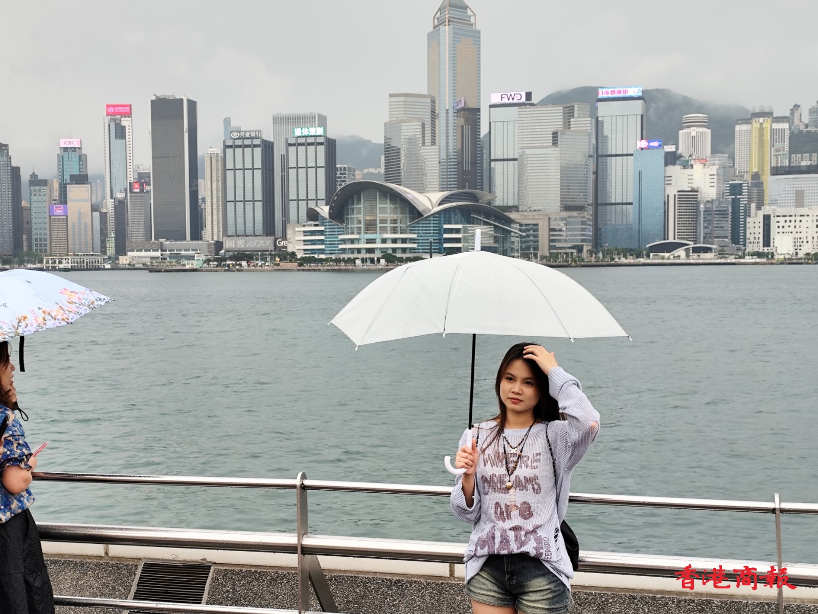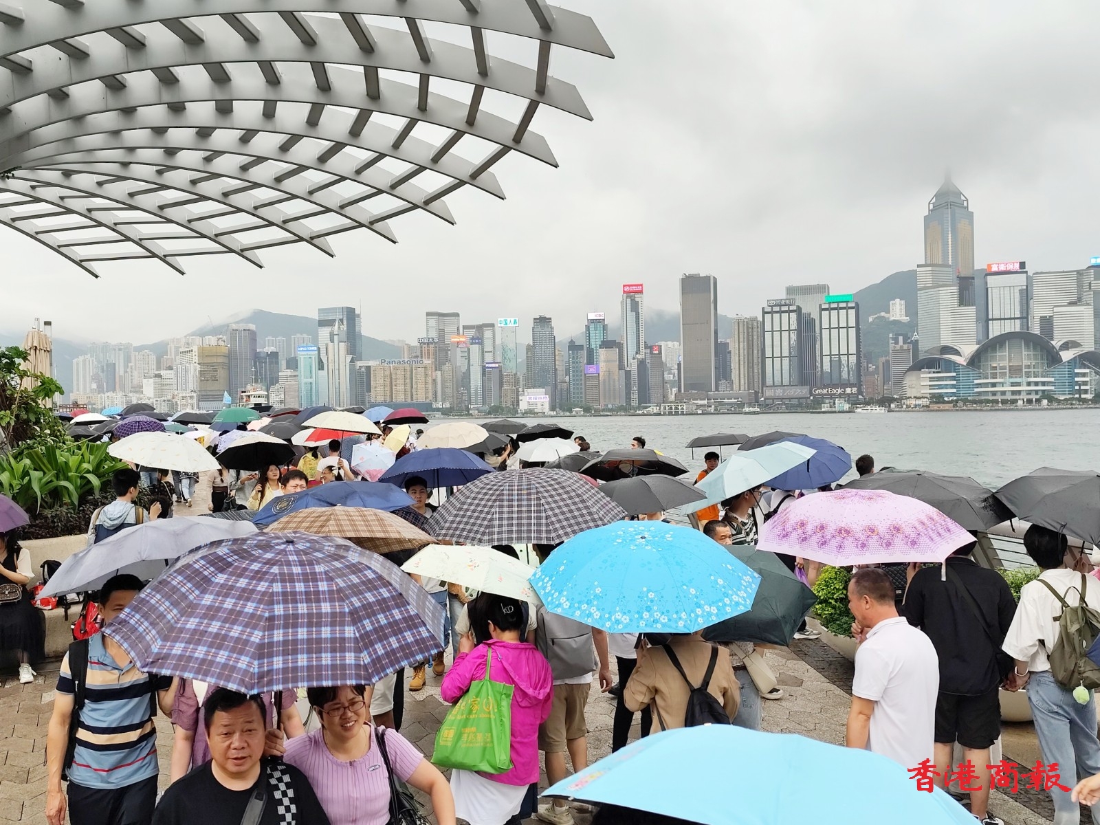 遊客在尖沙咀海傍冒雨打卡。記者 馮瀚文攝