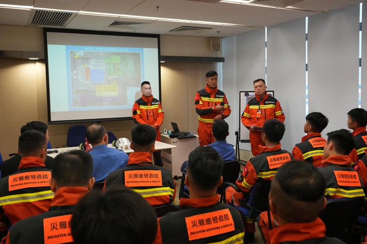 消防處災難應變救援隊隊員出發前於啟德消防局聽取簡報。(政府新聞處)