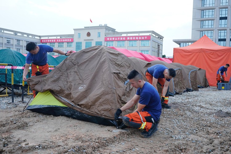 消防處災難應變救援隊隊員抵達演練場地後設立行動基地。(政府新聞處)