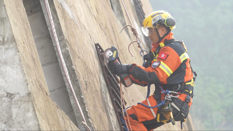 消防處災難應變救援隊隊員於傾斜的建築物拆破外牆架構以進行救援工作。(政府新聞處)