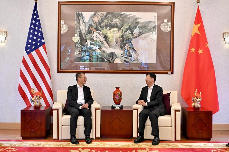 陳茂波(左)與中國駐三藩市總領事張建敏(右)會面。