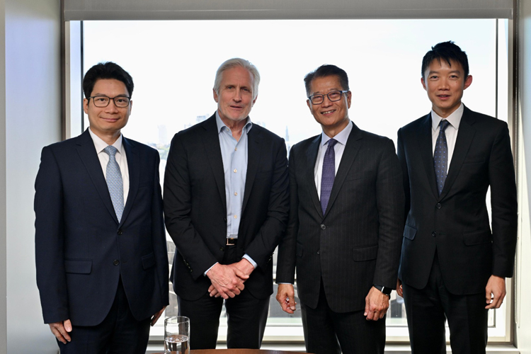 陳茂波(右二)在財經事務及庫務局副局長陳浩濂(左一)、香港金融管理局助理總裁許懷志(右一)和另類資產管理公司TPG創辦人兼行政主席Jim Coulter(左二)合照。