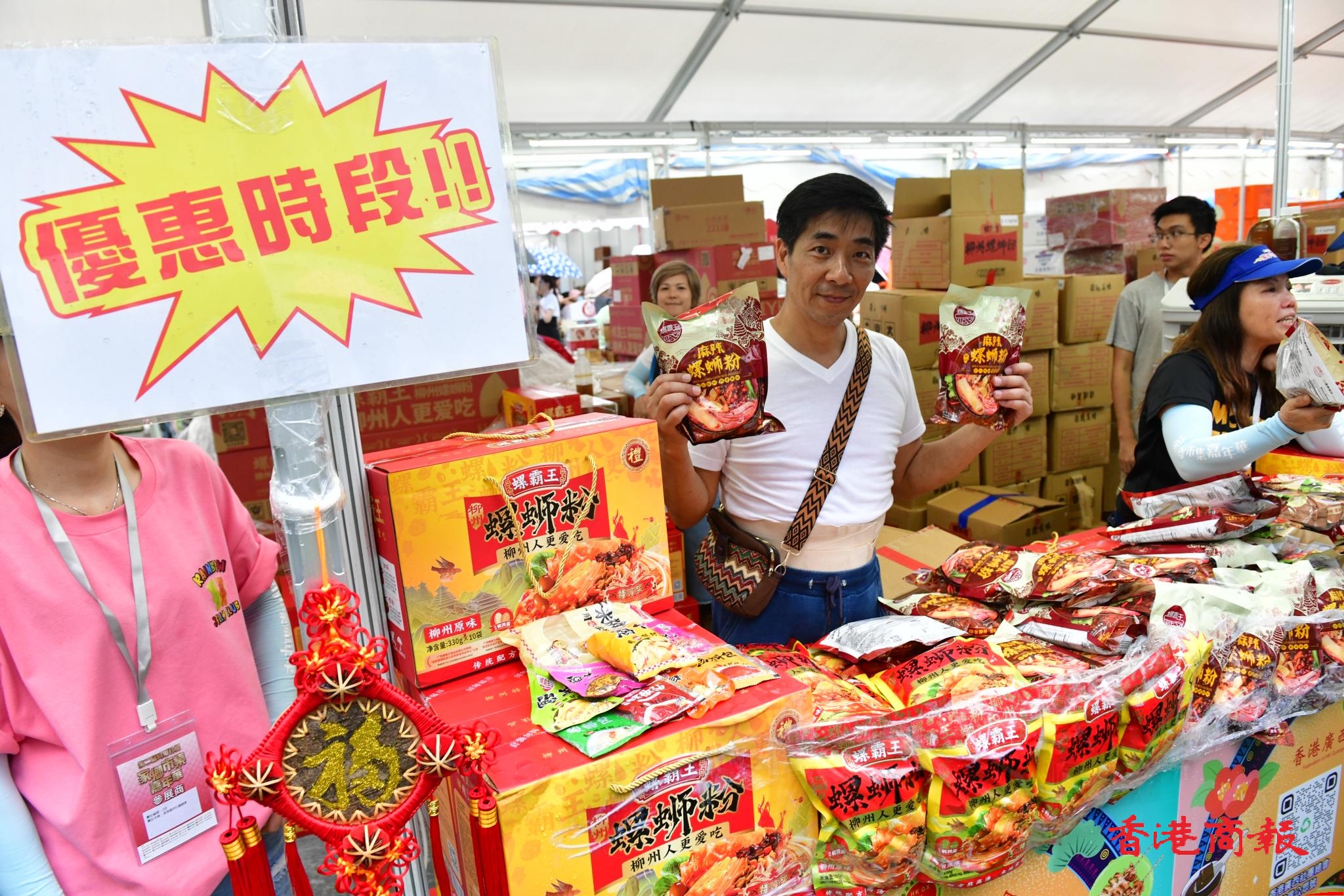 香港廣西社團總會的鄭先生表示,會方有參與兩屆家鄉市集,兩屆人流都很多,天雨絕對影響不到人們的氣氛。攤位內最受歡迎產品一定是螺獅粉,在最後一天展期會作少量減價,由120元降至100元,較展場外便宜至少三或四成,其次是龜苓膏,啫喱狀的在第一天已售罄,主要是易入口和方便攜帶,栗子同樣早已售罄。今年預備了數十板貨品,比去年多兩板貨。他認為今年的家鄉市集很理想,歡迎主辦單位再添任何新元素。