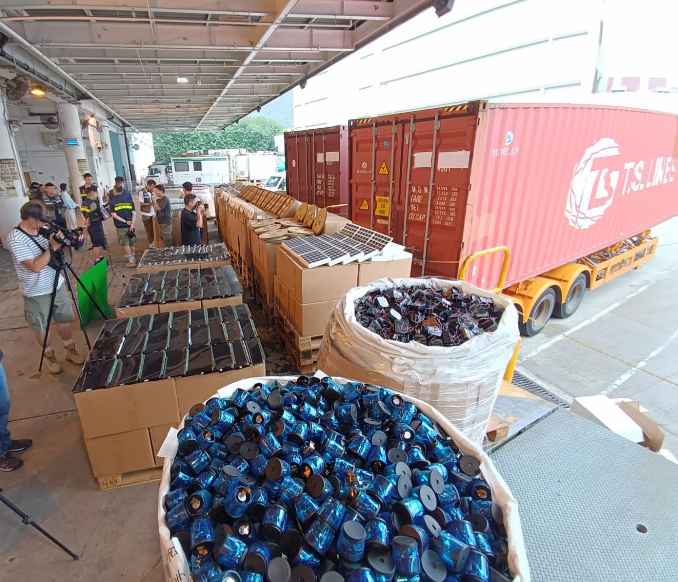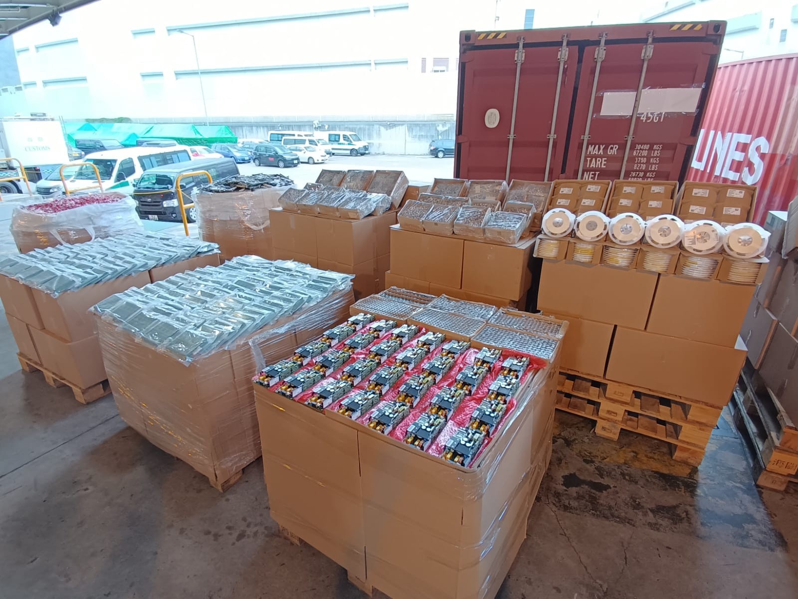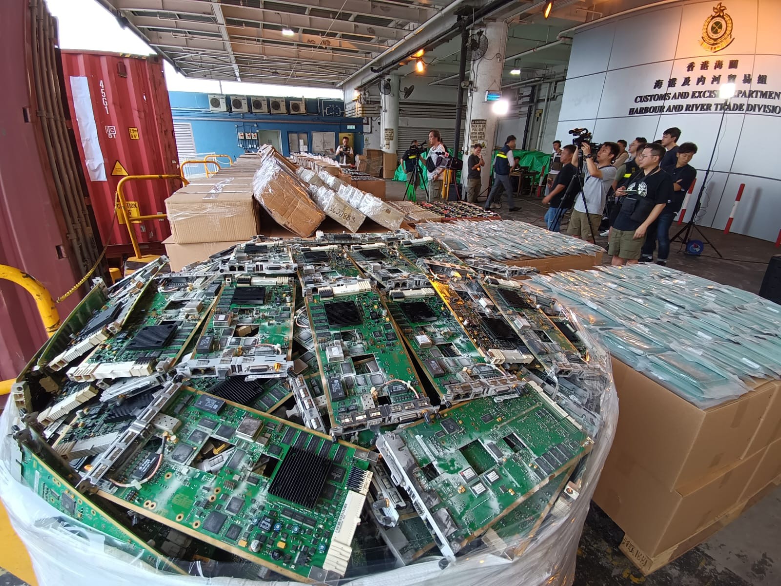 海關有組織罪案調查科特別調查第2組指揮官張文傑今日(7日)表示,4日透過情報分析及風險管理,鎖定兩個可疑出口貨櫃,原定經遠洋船運往馬來西亞,分別報稱載有鋁材和銅合金。人員詳細檢查後在貨櫃中發現大批未列倉單的不同類型電子零件和產品,包括簇新集成電路、電容器和LED燈飾等,另外有二手顯示屏、底板和電子廢料,總值約8000萬元,案件仍在調查中,不排除稍後有人被捕。