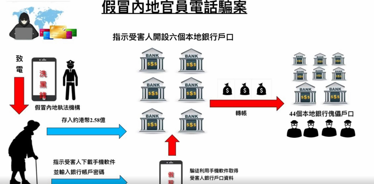 當中最高損失一宗達2.6億元,受害人是70歲的女商人,在2022年2月接獲騙徒電話,訛稱是內地執法機關人員,聲稱受害人涉及一宗洗黑錢案,需要接受調查,否則會遭到拘捕和檢控。受害人信以為真,為證明清白願意接受調查,騙徒首先指示受害人開設6個個人戶口,其後下載一個手機程式,輸入6個戶口號碼和密碼,聲稱可協助執法機關審查資金來源,結束後如受害人清白所有金錢會歸還。