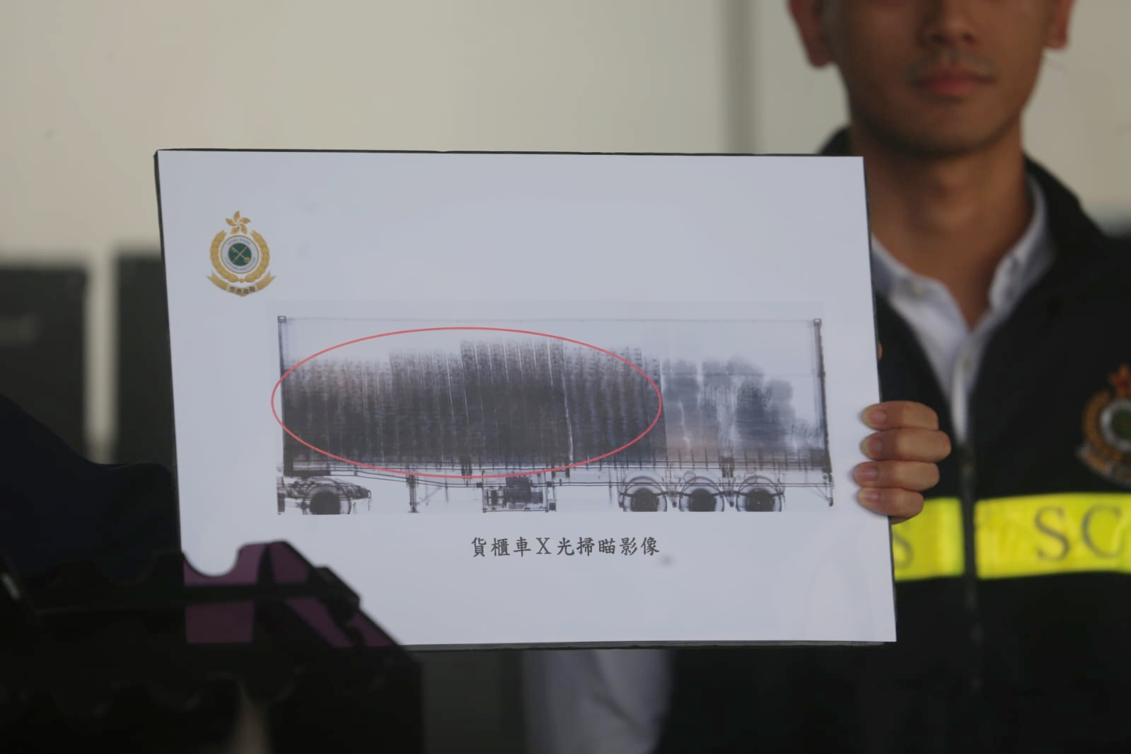 海關港口及海域科貨櫃貨物檢查組黎子康督察今日(4日)表示,6月28日透過風險管理和情報分析,鎖定一艘由香港出發到印度的遠洋船。根據資料顯示,船上一個40呎貨櫃報稱載有人造花,人員透過X光掃描發現有可疑影象,貨櫃中間和後半部分貨物的密度和形狀,與報稱的貨物並不脗合,相信載有兩種不同種類的貨物。