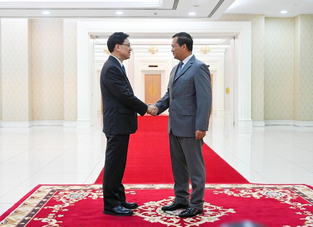 行政長官李家超(左)今日在柬埔寨與柬埔寨首相洪瑪奈(右)會面。圖:政府新聞處