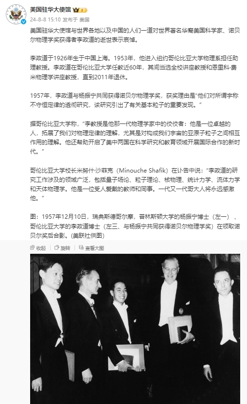 @美國駐華大使館 8月8日發文稱,與世界各地以及中國的人們一道對世界著名華裔美國科學家、諾貝爾物理學獎獲得者李政道的逝世表示哀悼,文中引述哥倫比亞大學的說法稱,他「幫助開啟了美中兩國在科學研究和教育領域開展國際合作的新時代」。