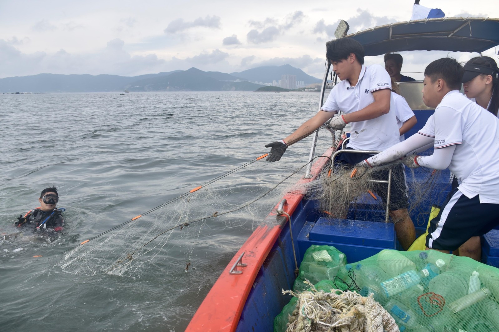 消防及救護青年團(FAST Connect)昨日(11日)參與由環境及自然保育基金資助、香港海洋公園保育基金主辦的「守護本地海洋資源公民教育計劃」,了解香港海洋生態、生物多樣性及保育現況。團員與亞洲潛水博覽會一同出海,收集俗稱「鬼網」的廢棄漁網,並將被「鬼網」纏繞的海洋生物解救,送回大海;其後更清理沙灘上垃圾,為保護海洋出力。(記者區天海)