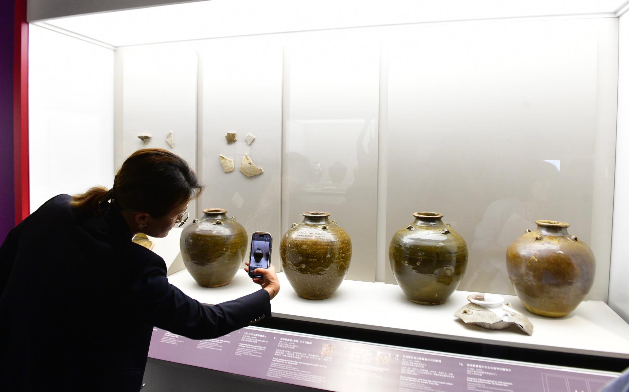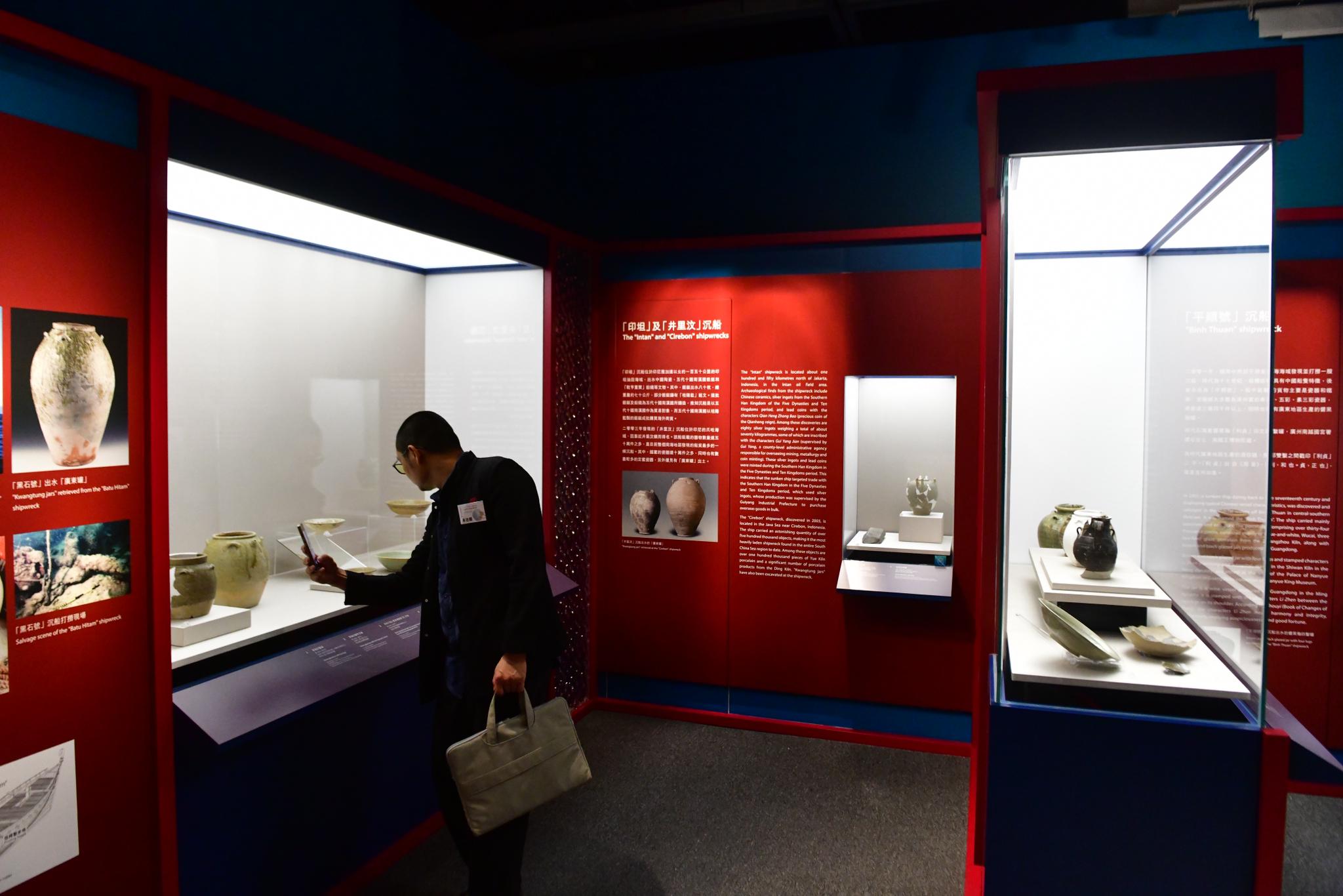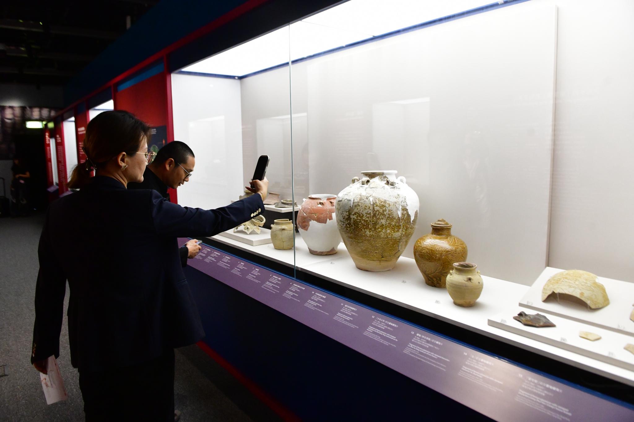 是次展出的255項展品中,有來自「南海I號」的南海窰醬釉「淳熙十年」印文四繫罐、景德鎮窰青白釉印花枝梅紋花口碗、龍泉窰青釉刻劃蓮紋折腰花口碟、金單頂鏈犀角形錐筒飾項鍊、鑲寶石空心金鐲等。來自粵港澳三地的展品則包括廣州南越國宮署遺址出土的宋代湖田窰青白釉墨書「公使」款碗底殘件、香港聖山遺址出土的宋代青黃釉龍紋六繫罐、澳門聖保祿學院遺址出土的明代景德鎮窰青花象首軍持等。(記者:李銘欣/攝影:崔俊良)