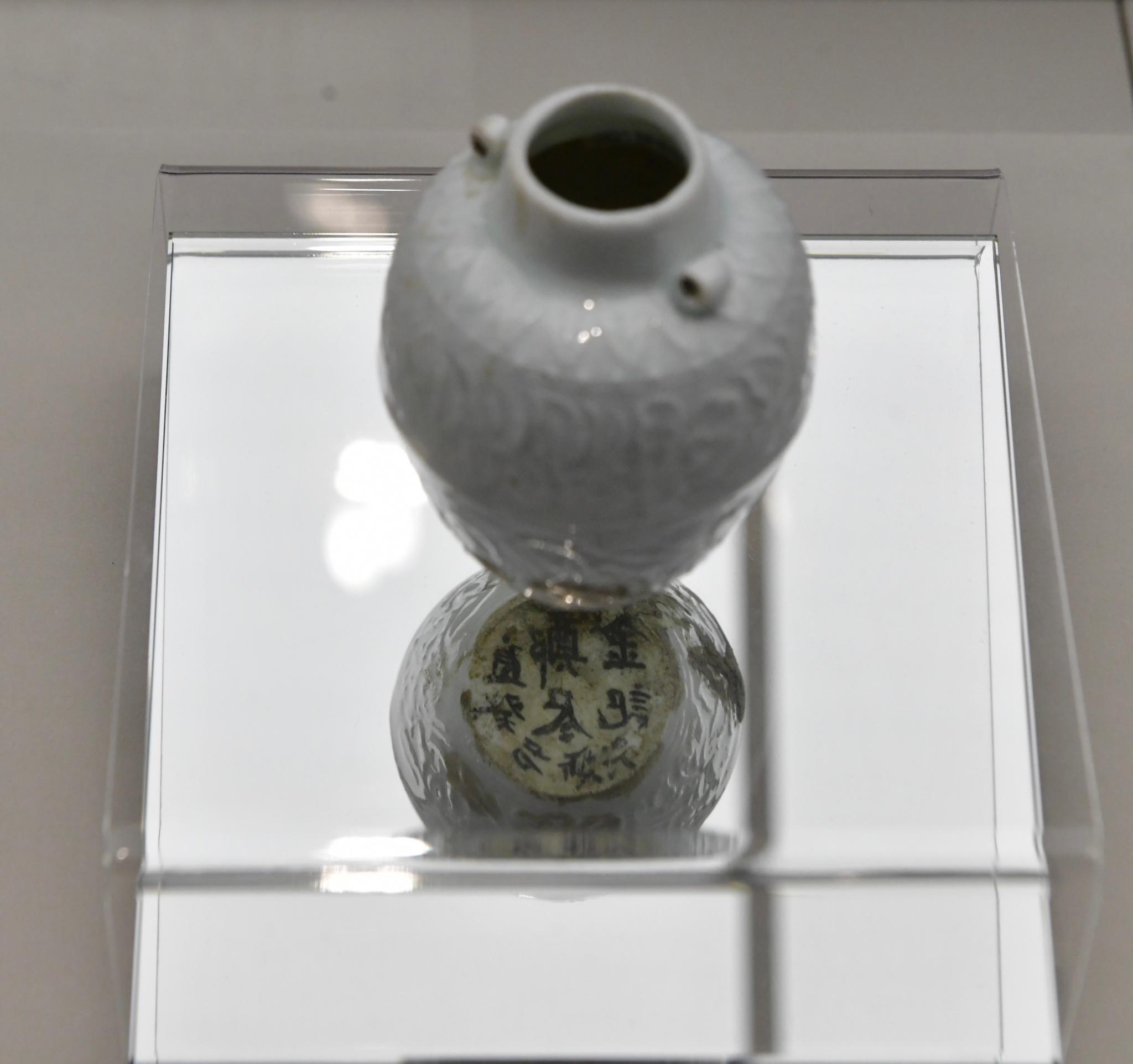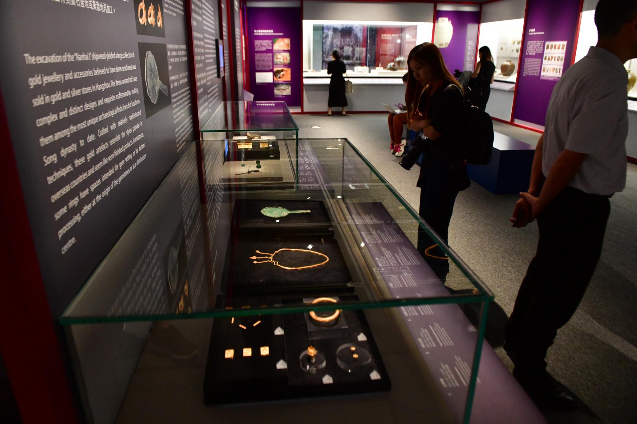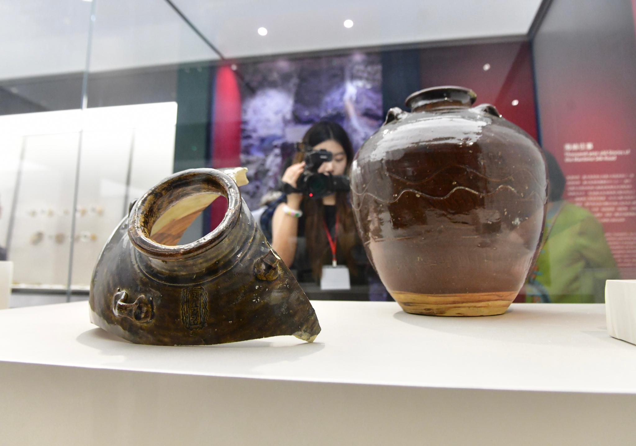 是次展出的255項展品中,有來自「南海I號」的南海窰醬釉「淳熙十年」印文四繫罐、景德鎮窰青白釉印花枝梅紋花口碗、龍泉窰青釉刻劃蓮紋折腰花口碟、金單頂鏈犀角形錐筒飾項鍊、鑲寶石空心金鐲等。來自粵港澳三地的展品則包括廣州南越國宮署遺址出土的宋代湖田窰青白釉墨書「公使」款碗底殘件、香港聖山遺址出土的宋代青黃釉龍紋六繫罐、澳門聖保祿學院遺址出土的明代景德鎮窰青花象首軍持等。(記者:李銘欣/攝影:崔俊良)