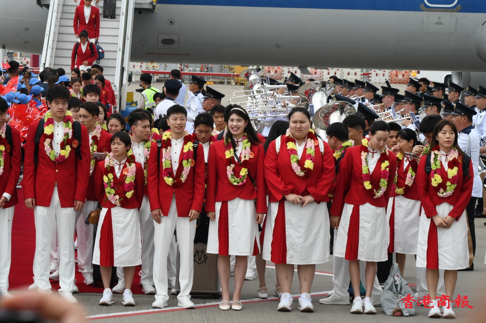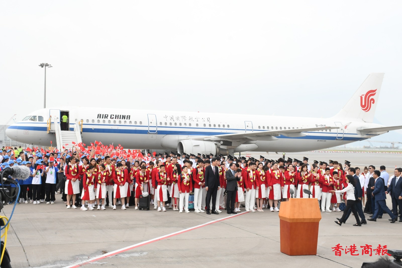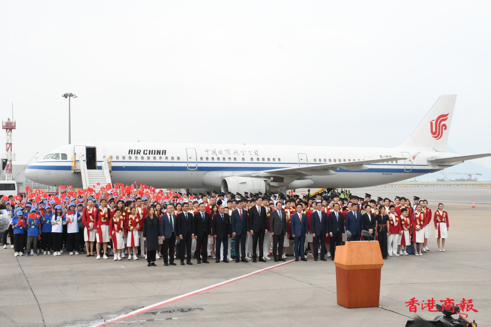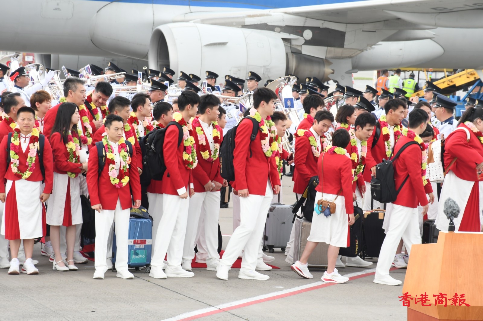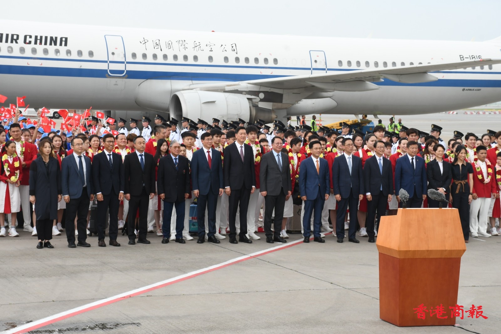 8月29日中午約12時,由馬龍、全紅嬋、潘展樂等65名在巴黎奧運會上取得佳績的運動員和8名教練員組成的內地奧運健兒代表團抵達香港國際機場,香港各界熱烈歡迎。特區政府在停機坪舉行熱烈的歡迎儀式,表達各界對奧運健兒的熱切期待。(記者 馮瀚文 攝)