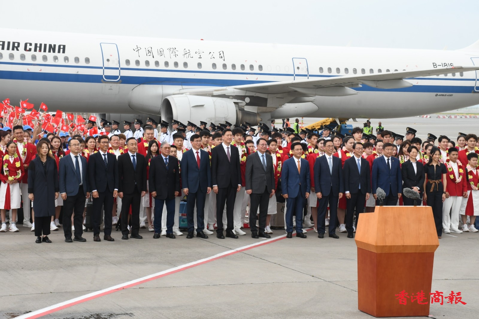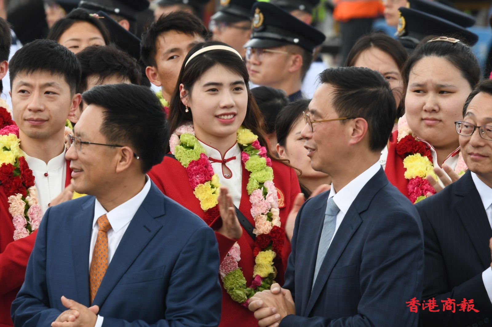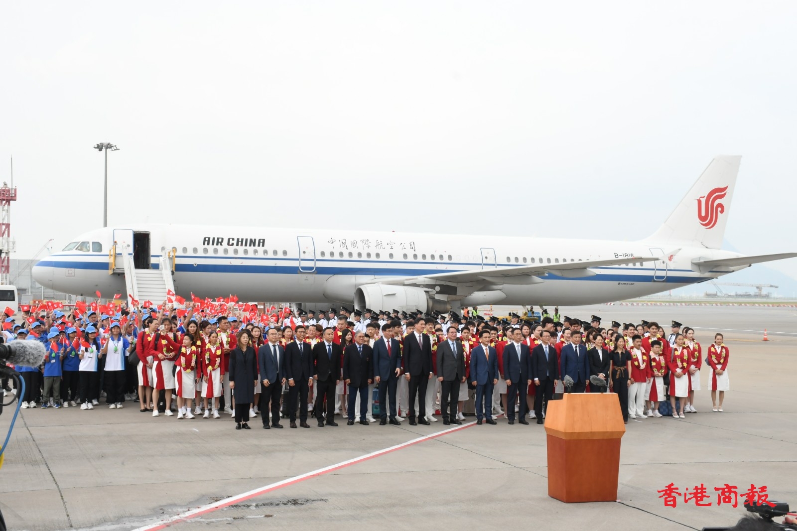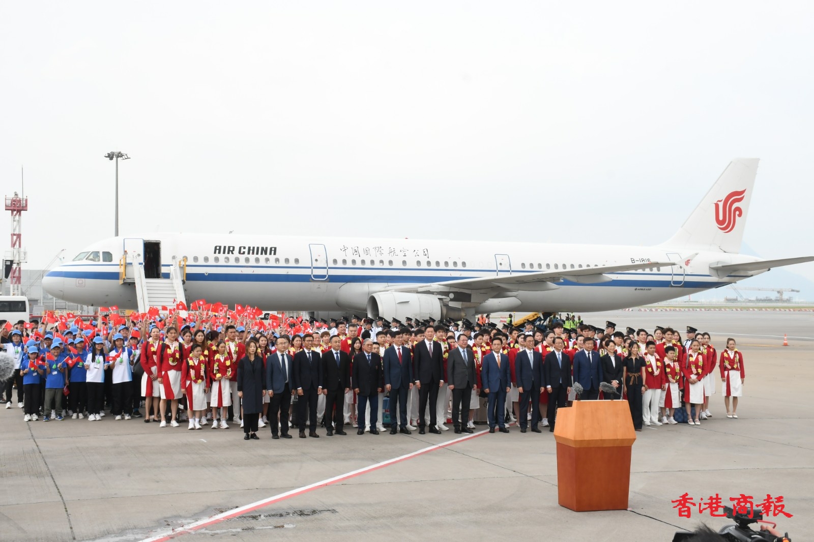 8月29日中午約12時,由馬龍、全紅嬋、潘展樂等65名在巴黎奧運會上取得佳績的運動員和8名教練員組成的內地奧運健兒代表團抵達香港國際機場,香港各界熱烈歡迎。特區政府在停機坪舉行熱烈的歡迎儀式,表達各界對奧運健兒的熱切期待。(記者 馮瀚文 攝)
