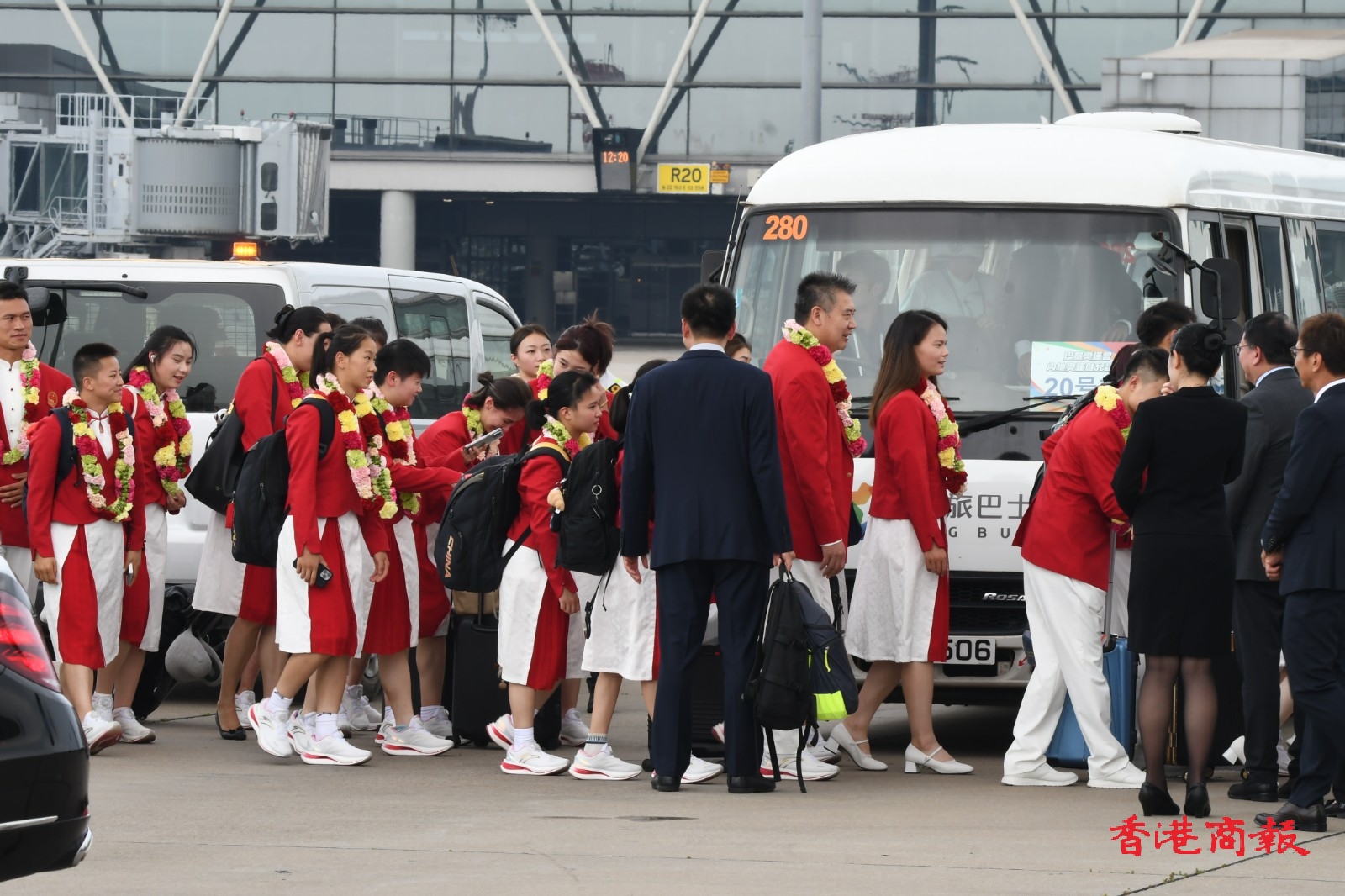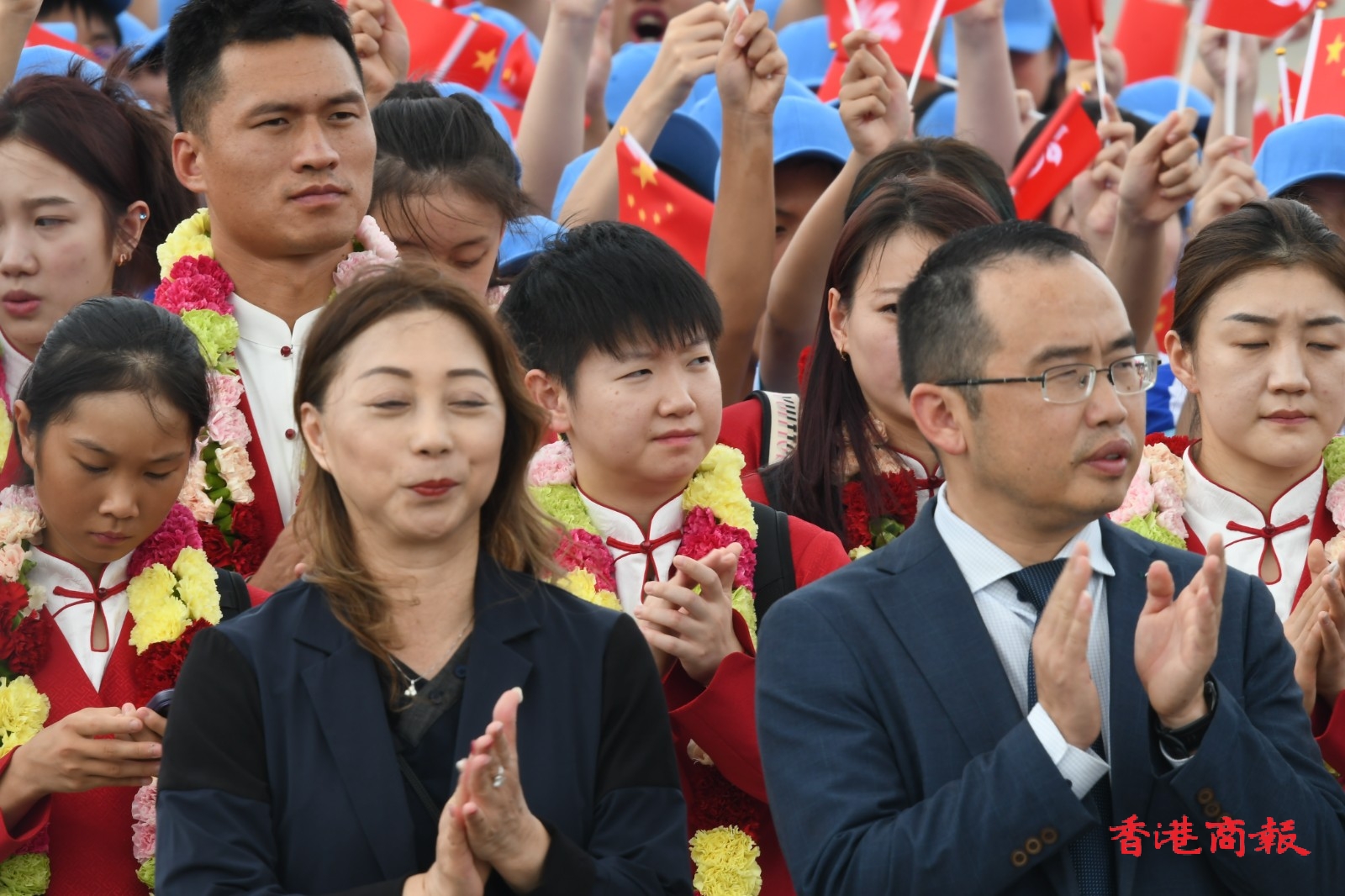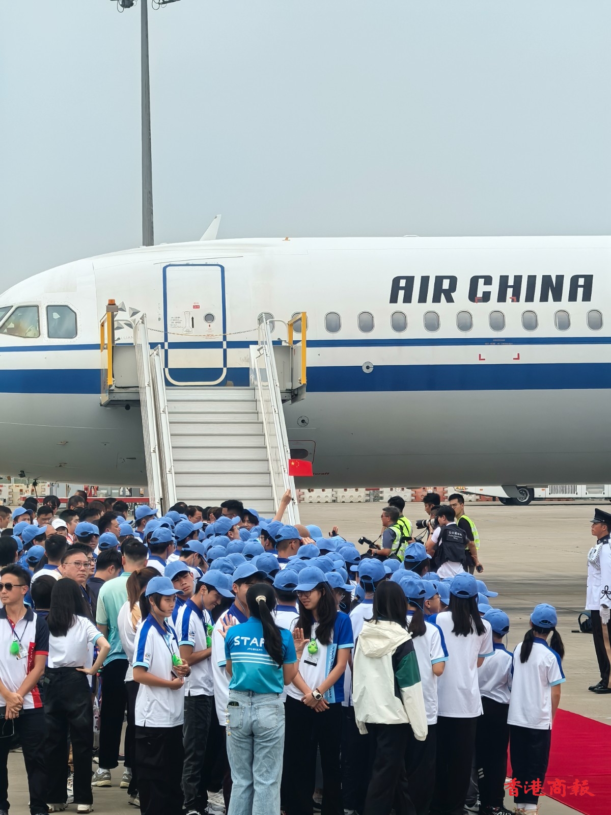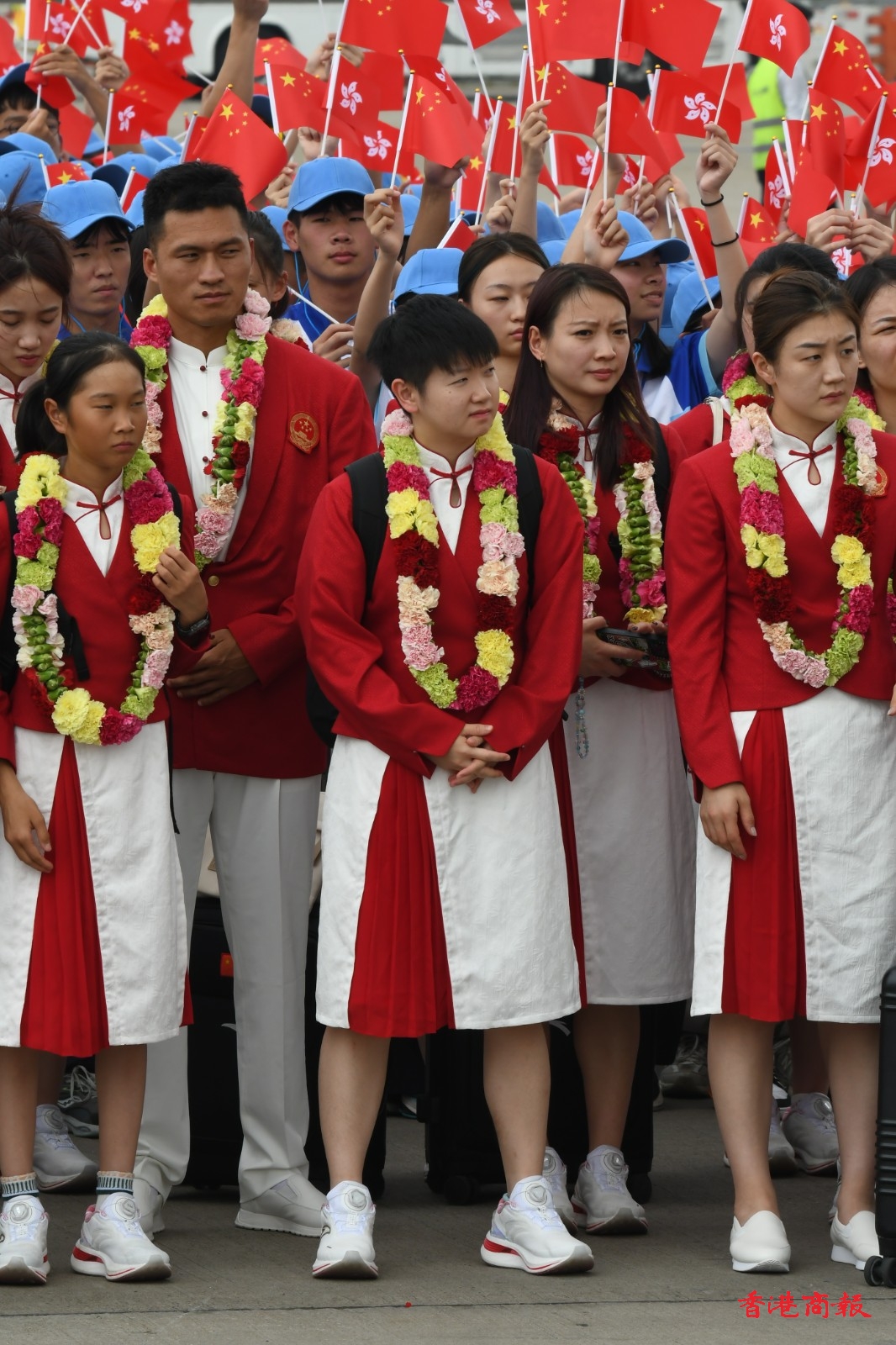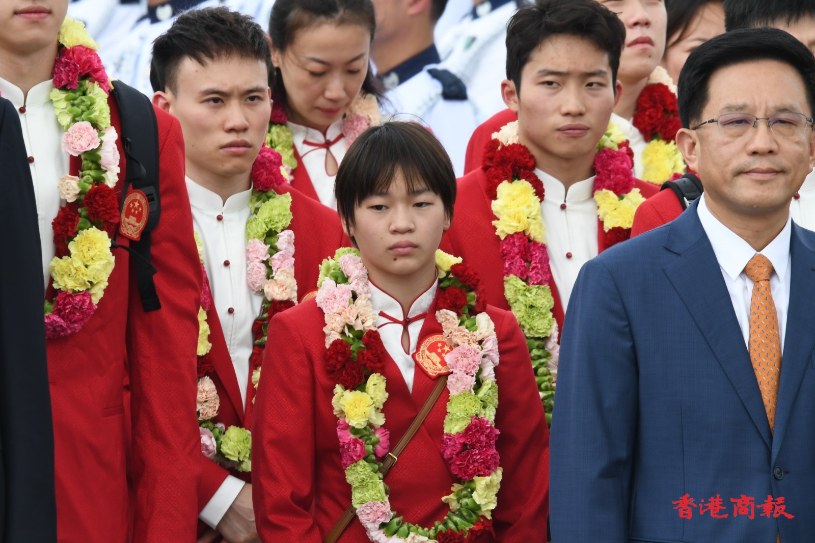 8月29日中午約12時,由馬龍、全紅嬋、潘展樂等65名在巴黎奧運會上取得佳績的運動員和8名教練員組成的內地奧運健兒代表團抵達香港國際機場,香港各界熱烈歡迎。特區政府在停機坪舉行熱烈的歡迎儀式,表達各界對奧運健兒的熱切期待。(記者 馮瀚文 攝)