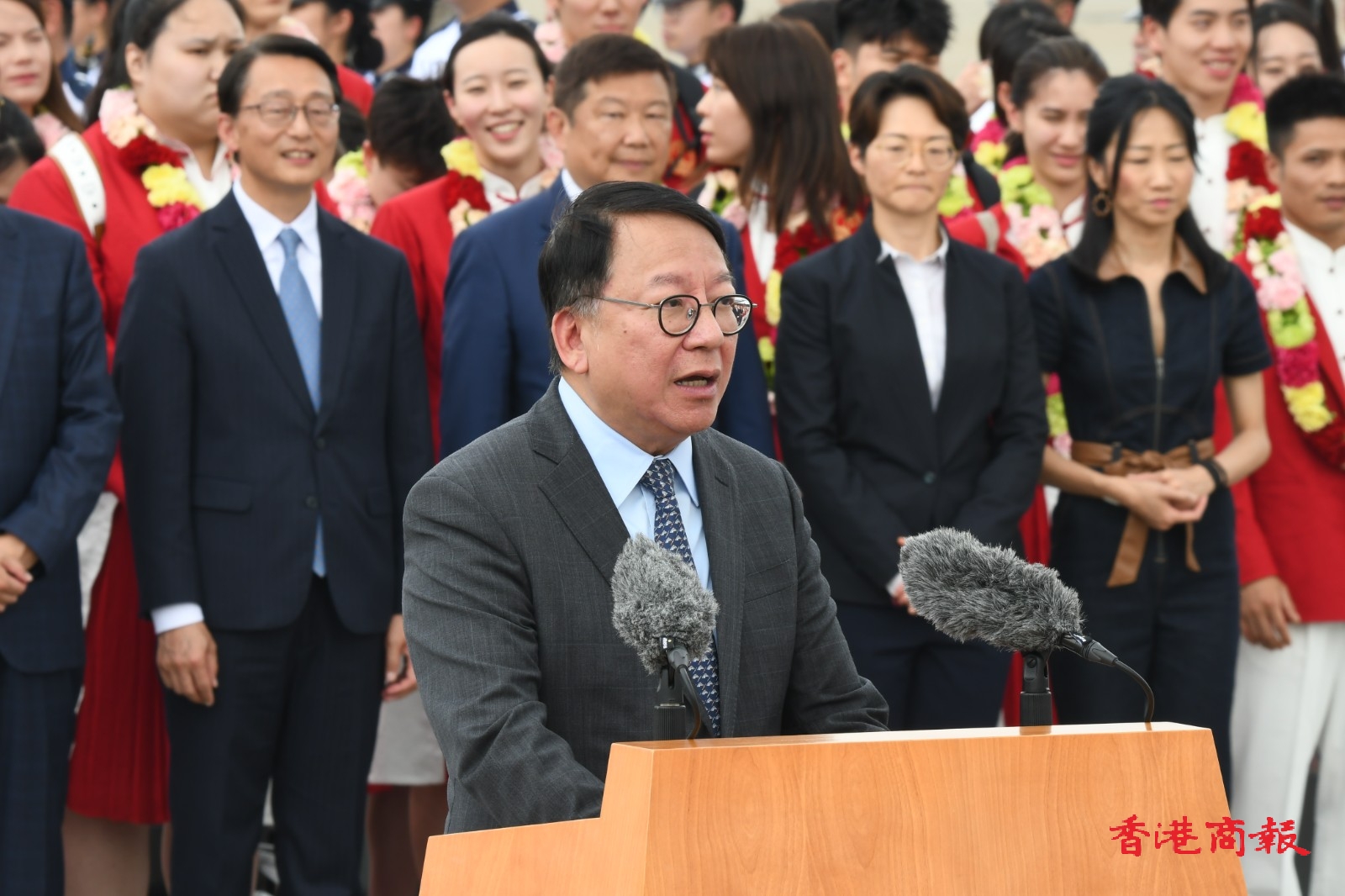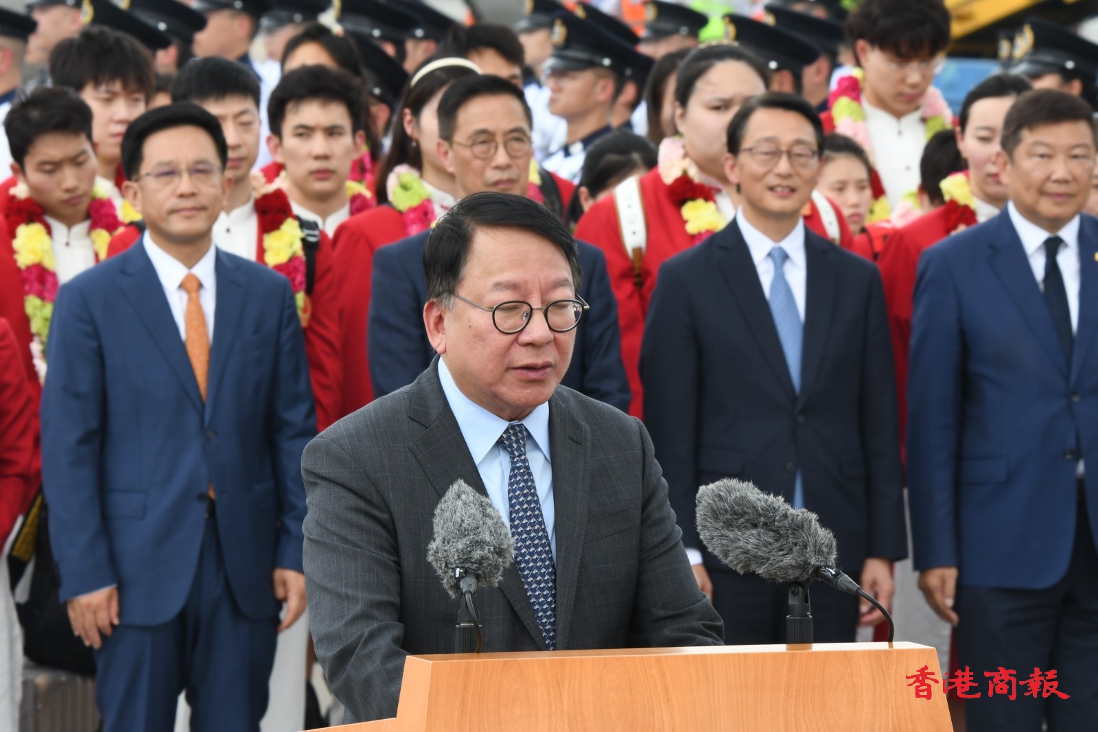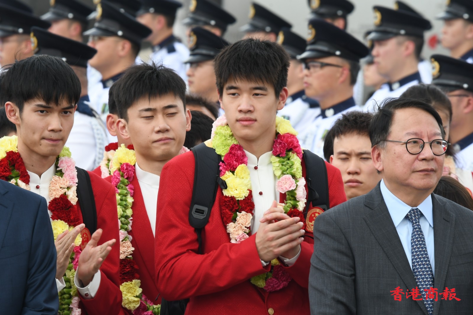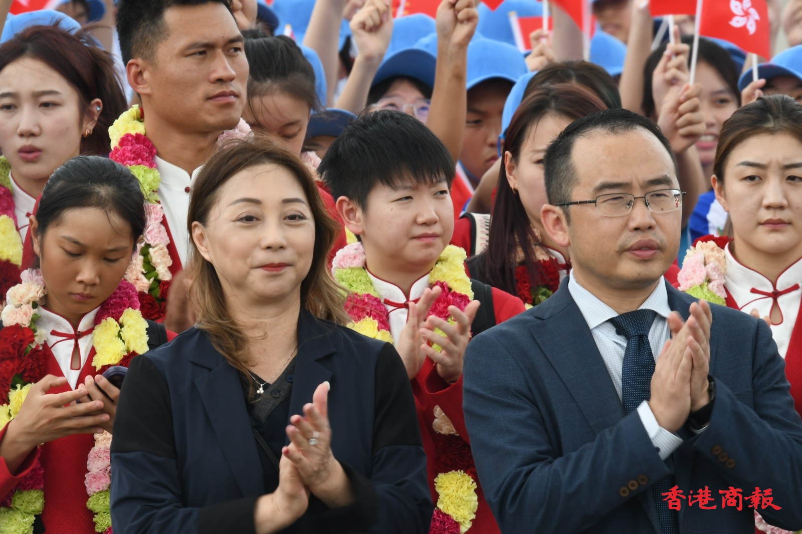 8月29日中午約12時,由馬龍、全紅嬋、潘展樂等65名在巴黎奧運會上取得佳績的運動員和8名教練員組成的內地奧運健兒代表團抵達香港國際機場,香港各界熱烈歡迎。特區政府在停機坪舉行熱烈的歡迎儀式,表達各界對奧運健兒的熱切期待。(記者 馮瀚文 攝)