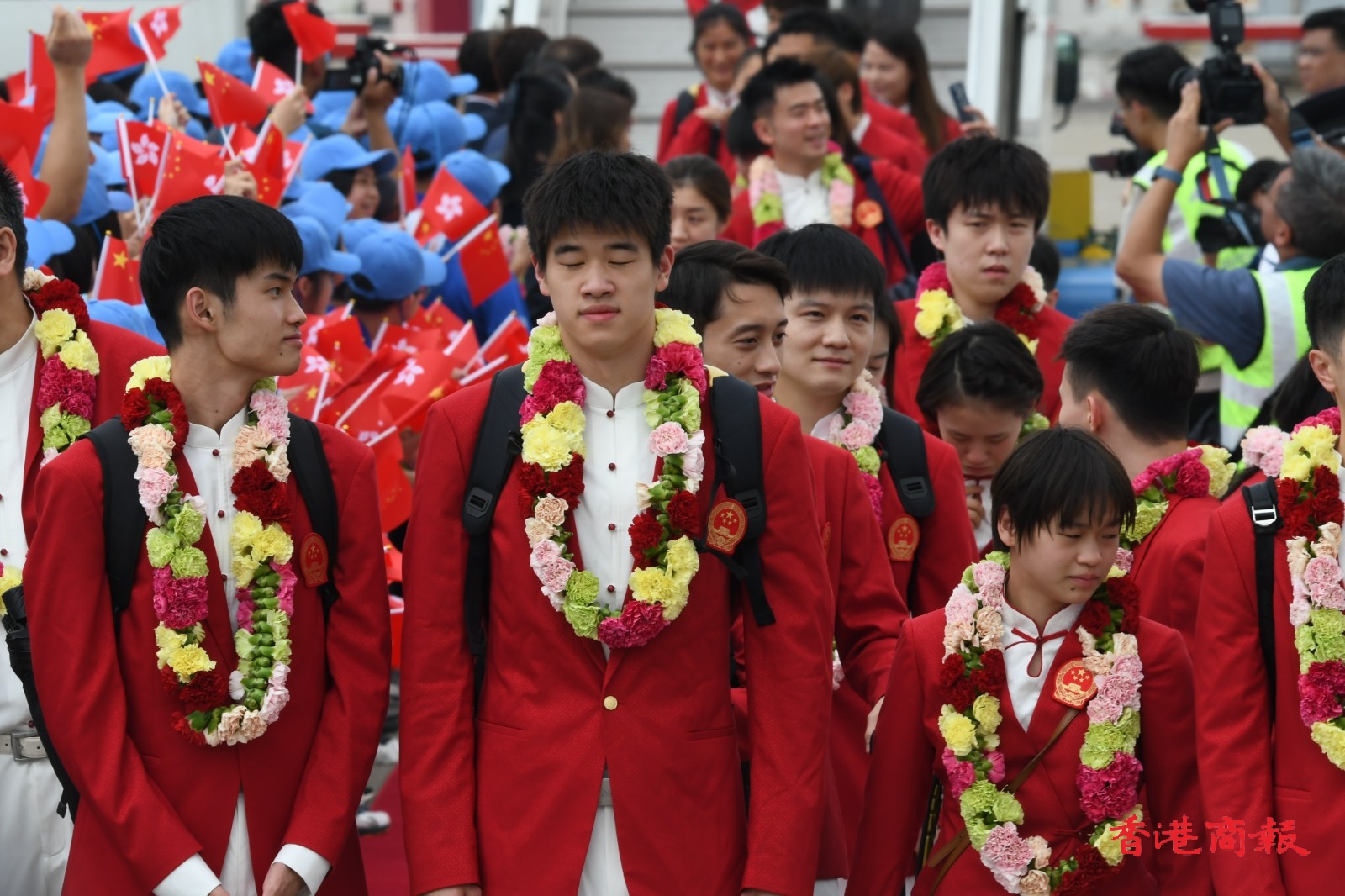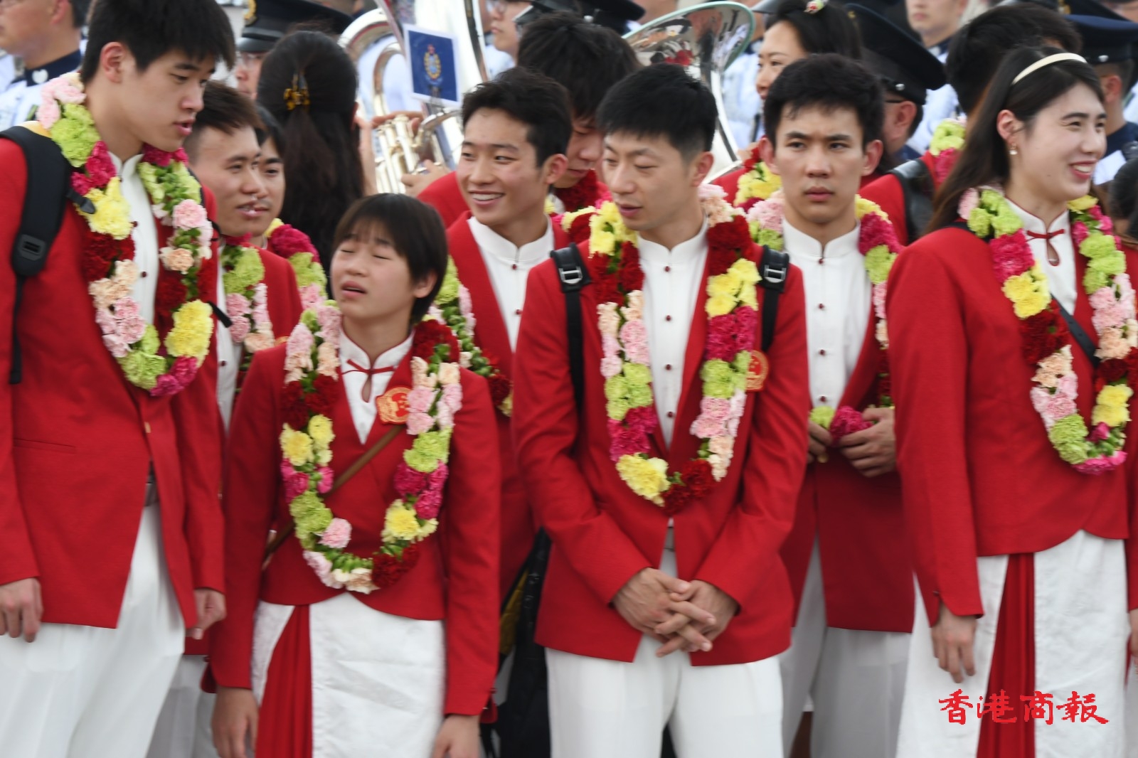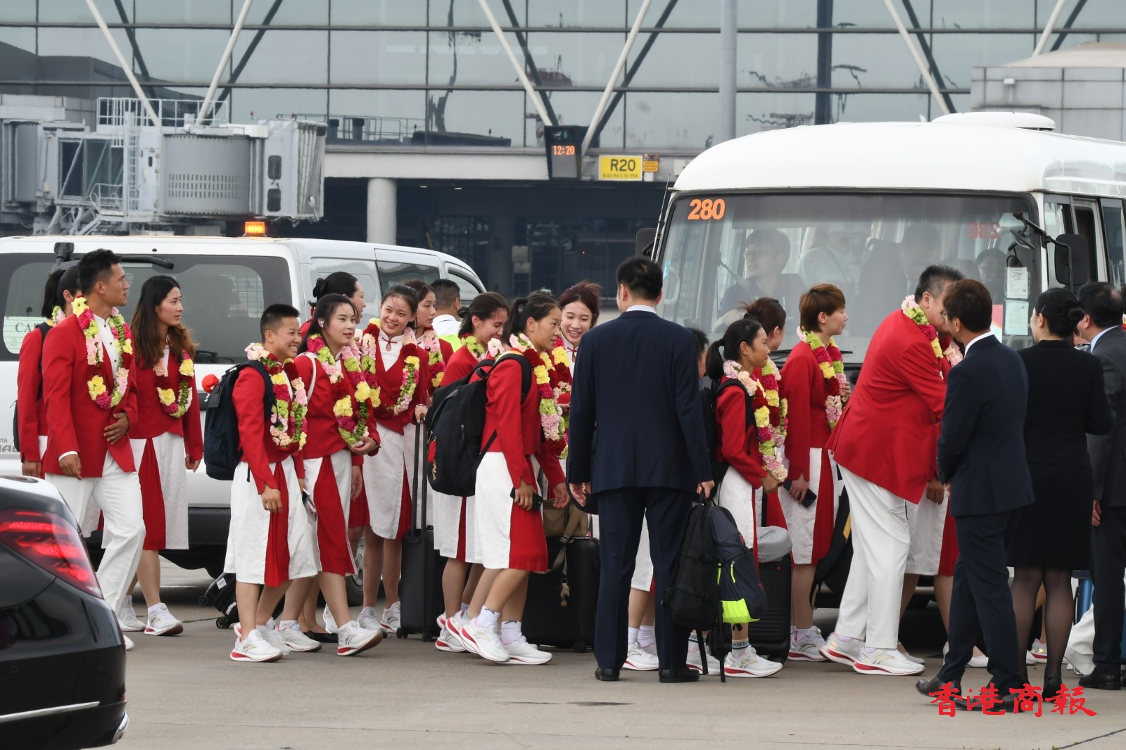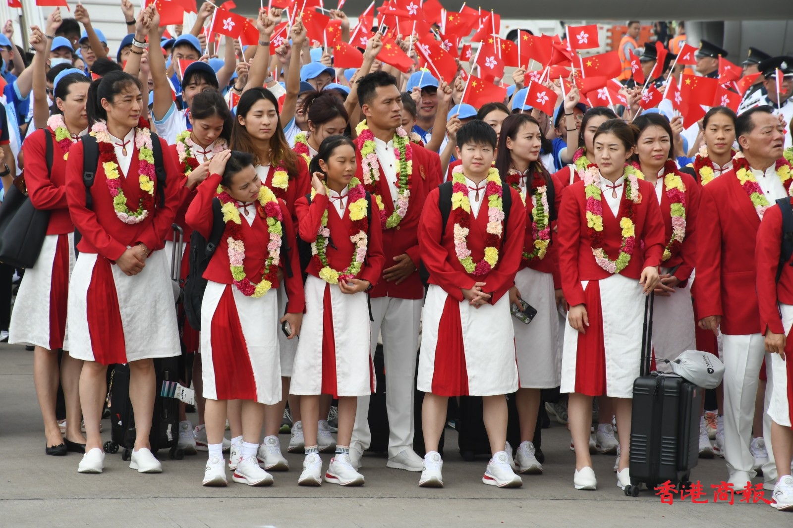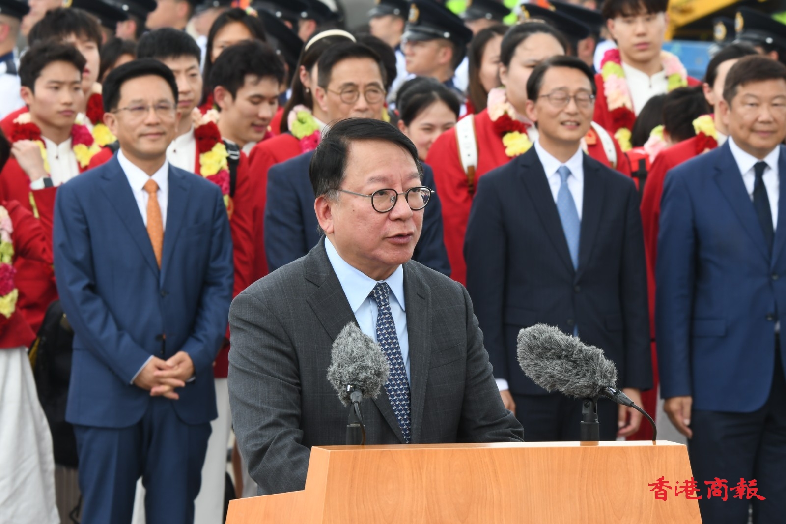 8月29日中午約12時,由馬龍、全紅嬋、潘展樂等65名在巴黎奧運會上取得佳績的運動員和8名教練員組成的內地奧運健兒代表團抵達香港國際機場,香港各界熱烈歡迎。特區政府在停機坪舉行熱烈的歡迎儀式,表達各界對奧運健兒的熱切期待。(記者 馮瀚文 攝)