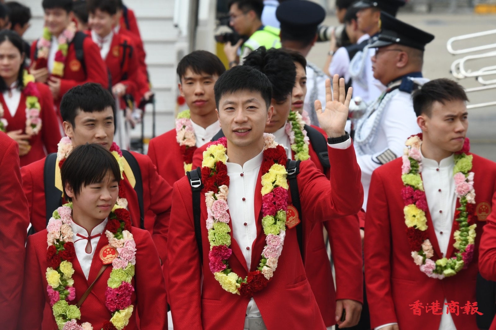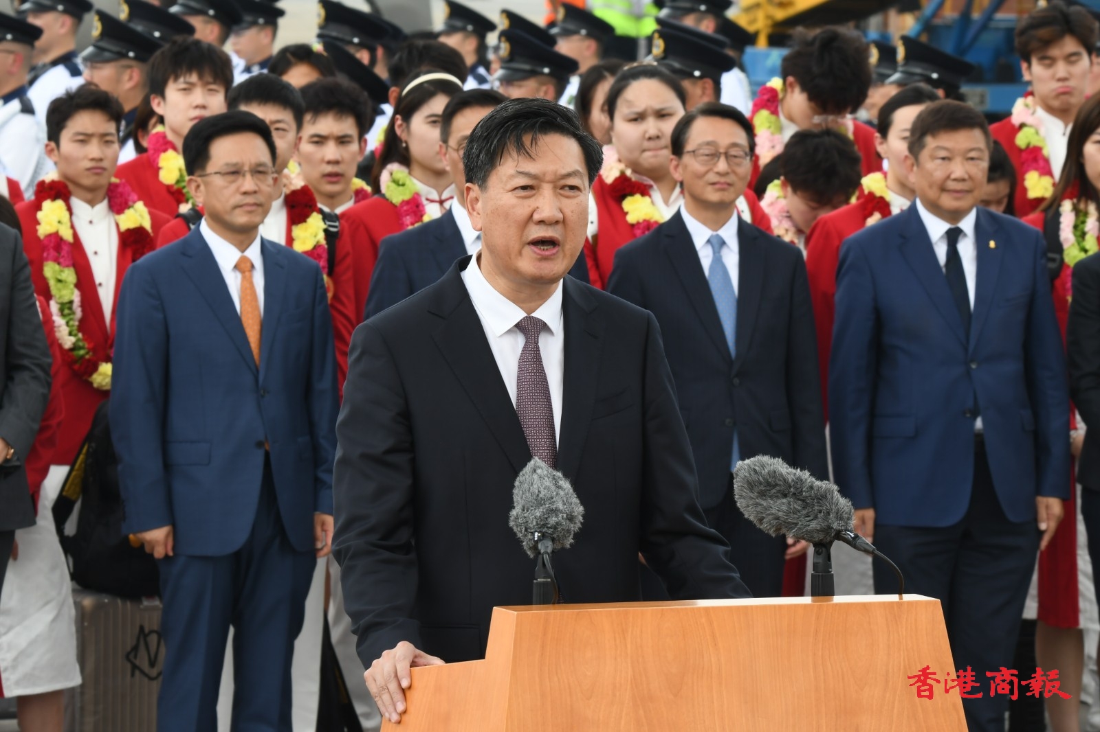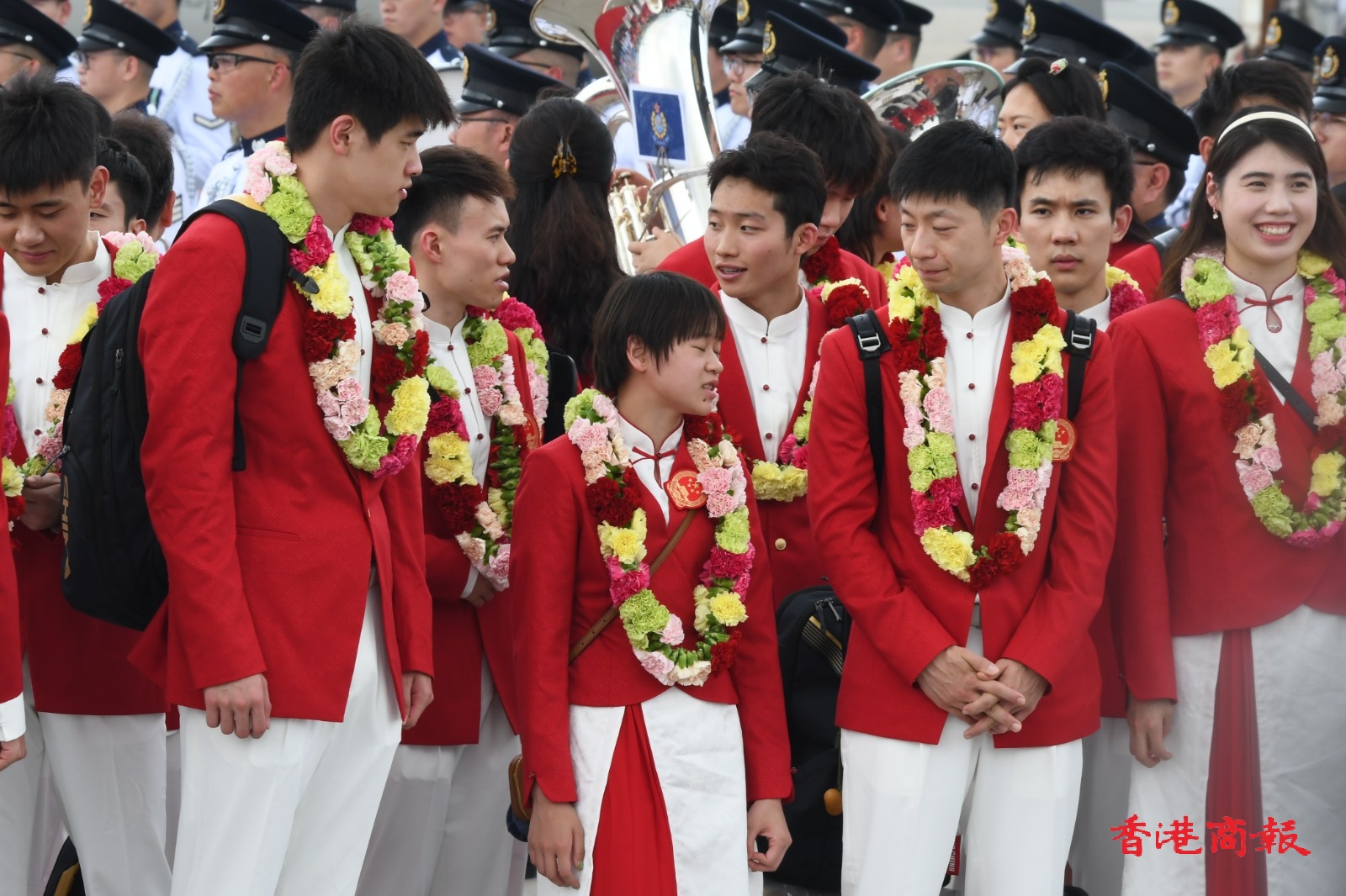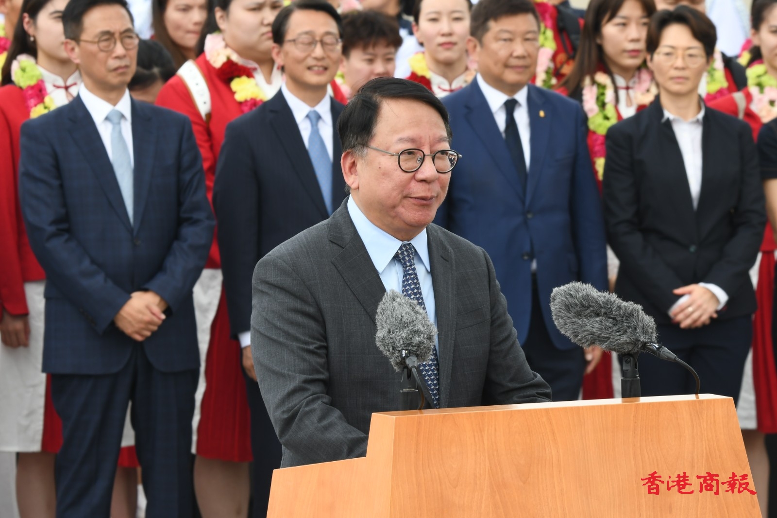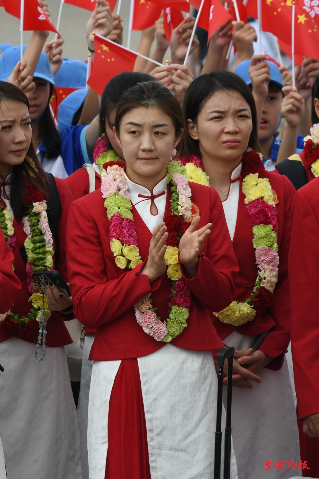 8月29日中午約12時,由馬龍、全紅嬋、潘展樂等65名在巴黎奧運會上取得佳績的運動員和8名教練員組成的內地奧運健兒代表團抵達香港國際機場,香港各界熱烈歡迎。特區政府在停機坪舉行熱烈的歡迎儀式,表達各界對奧運健兒的熱切期待。(記者 馮瀚文 攝)