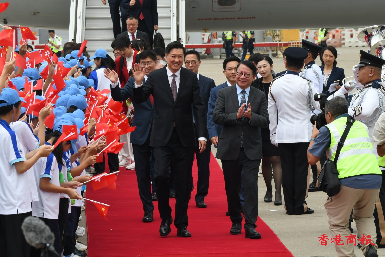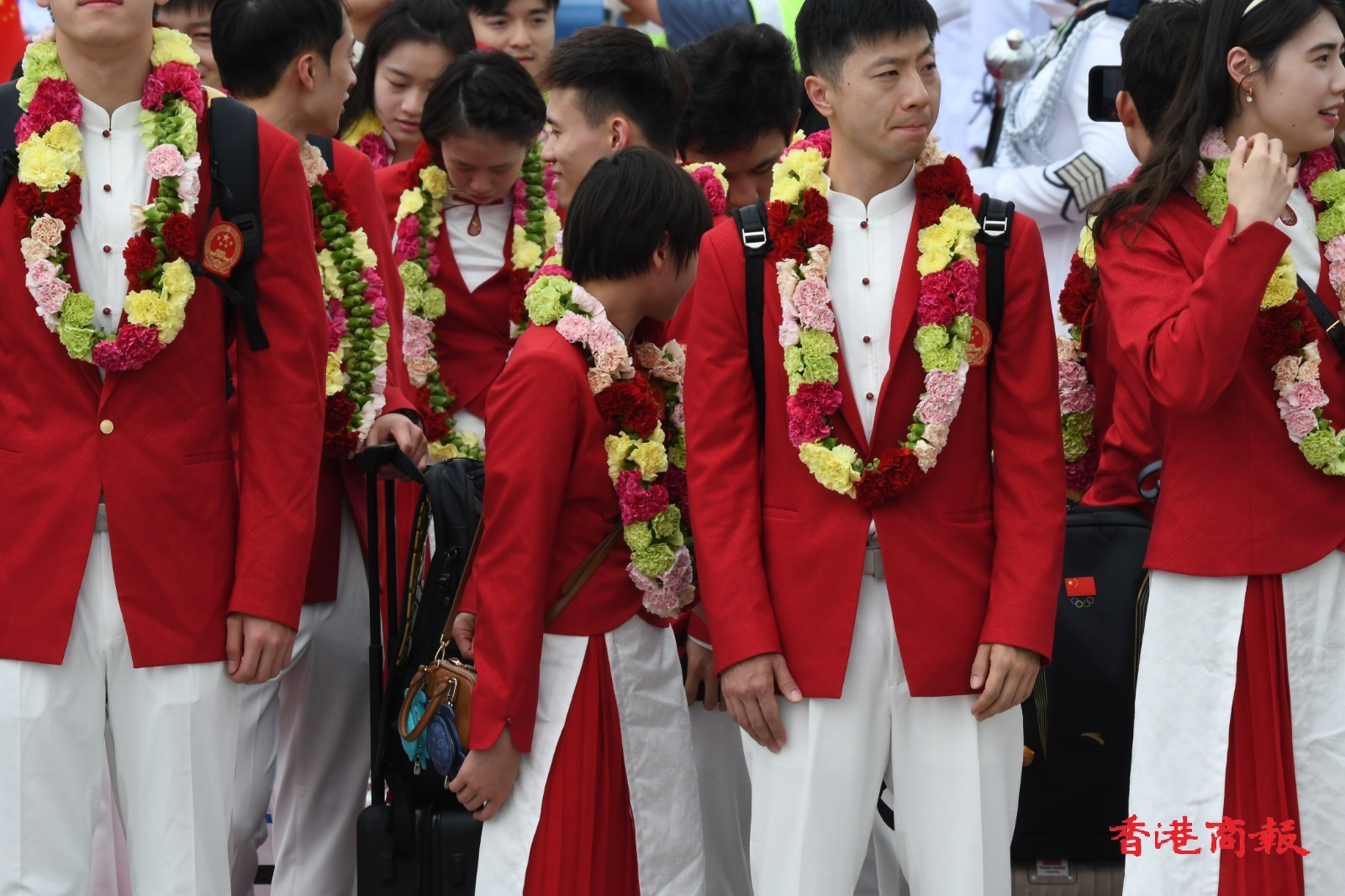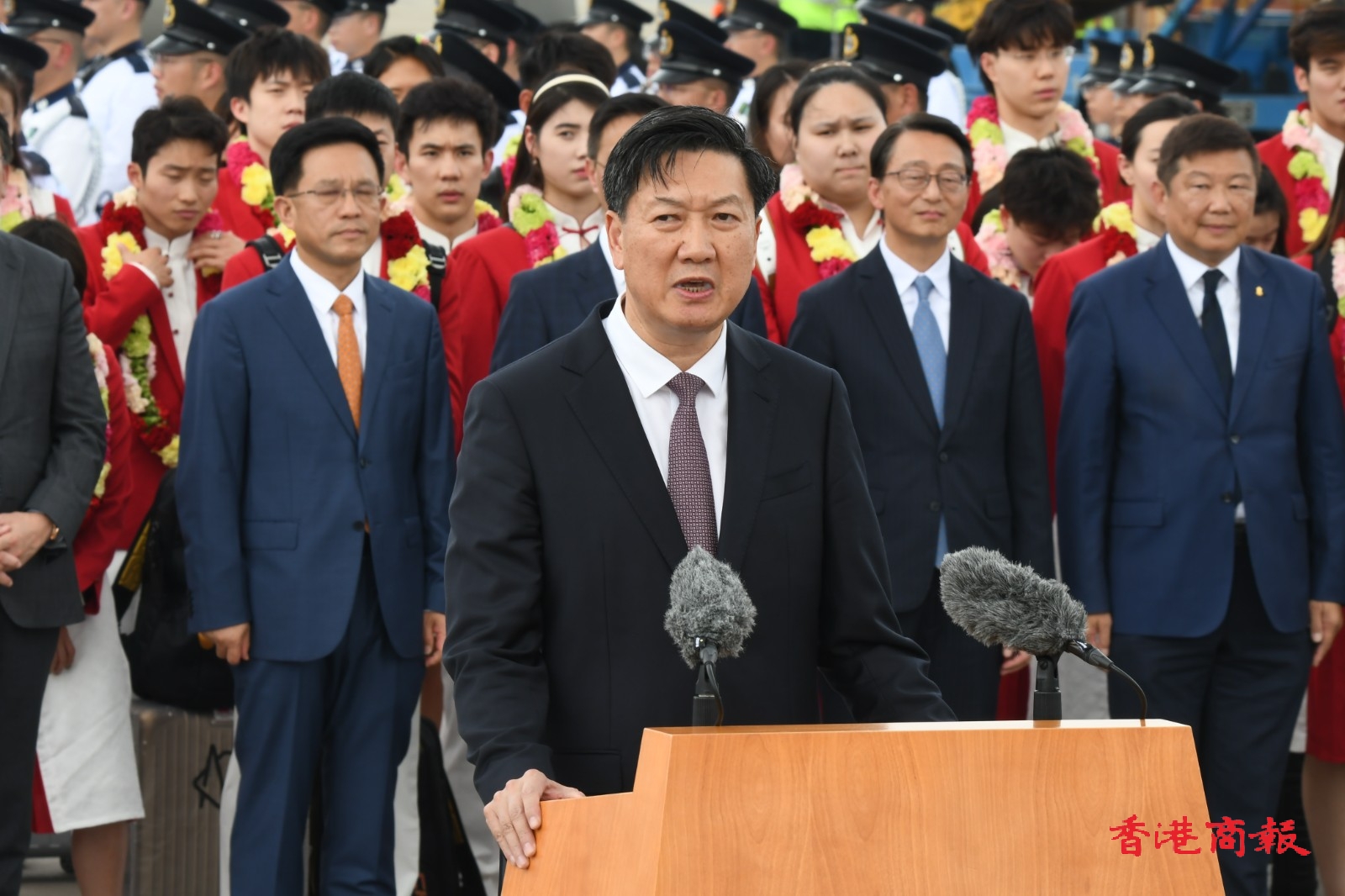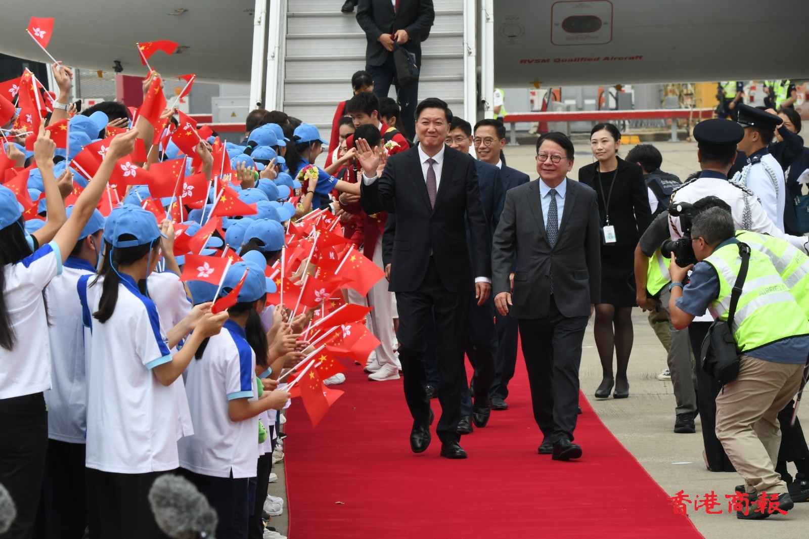 8月29日中午約12時,由馬龍、全紅嬋、潘展樂等65名在巴黎奧運會上取得佳績的運動員和8名教練員組成的內地奧運健兒代表團抵達香港國際機場,香港各界熱烈歡迎。特區政府在停機坪舉行熱烈的歡迎儀式,表達各界對奧運健兒的熱切期待。(記者 馮瀚文 攝)