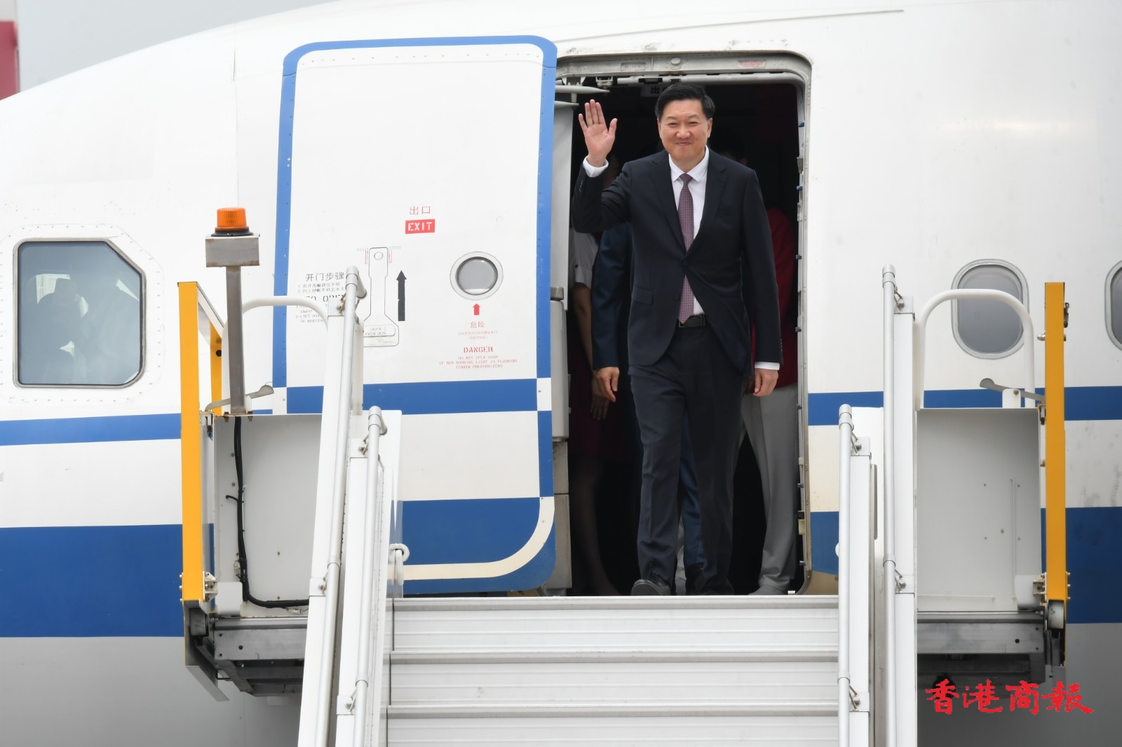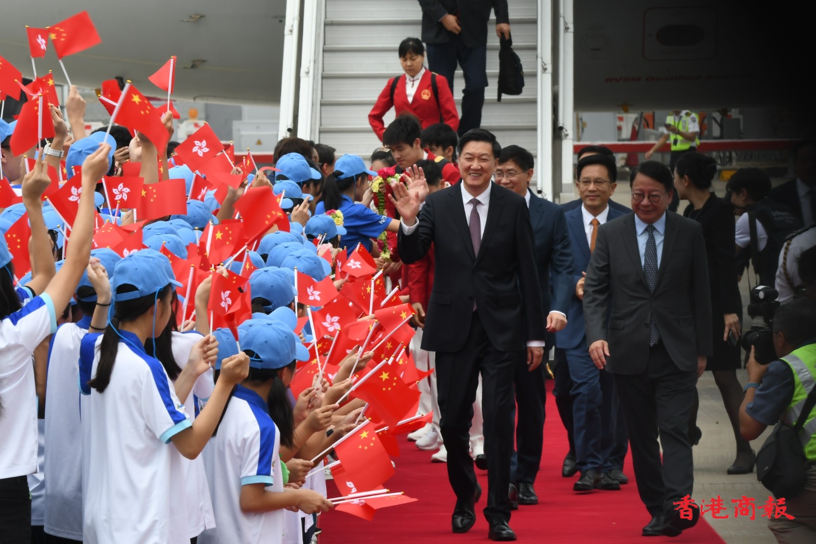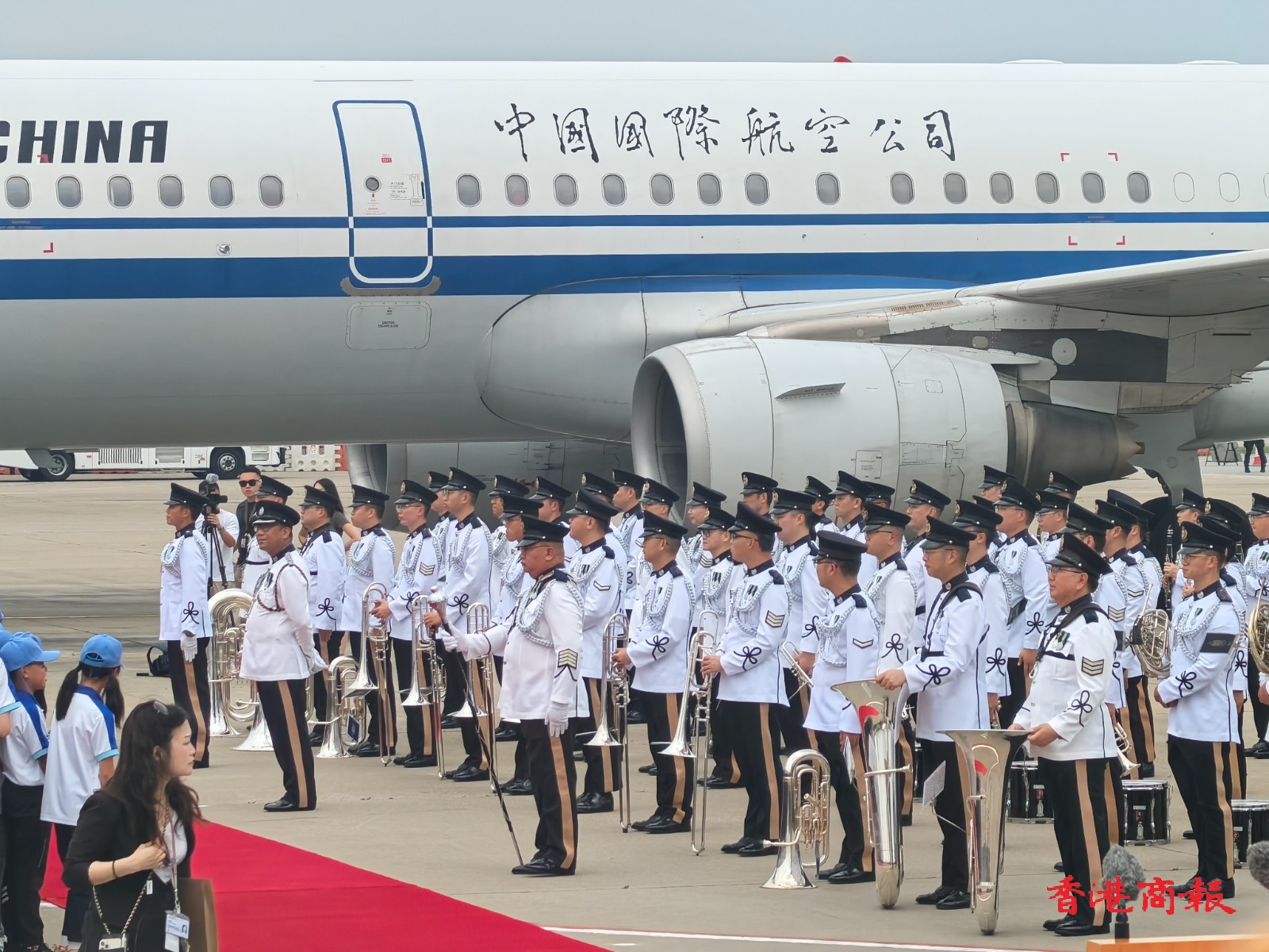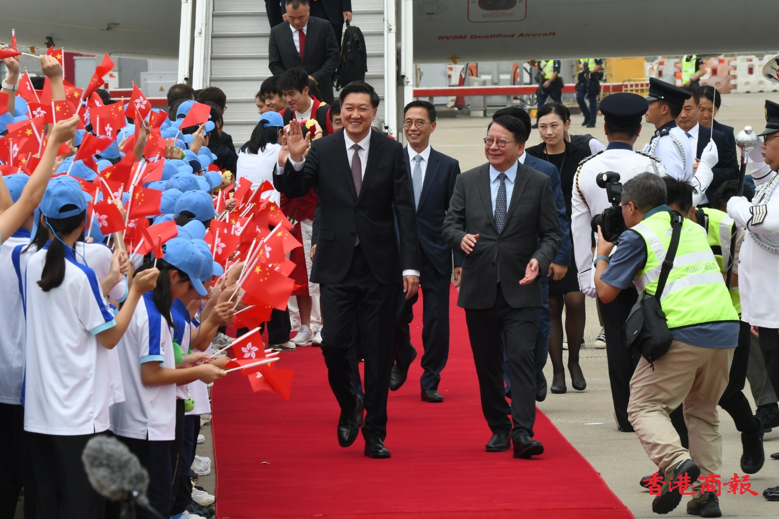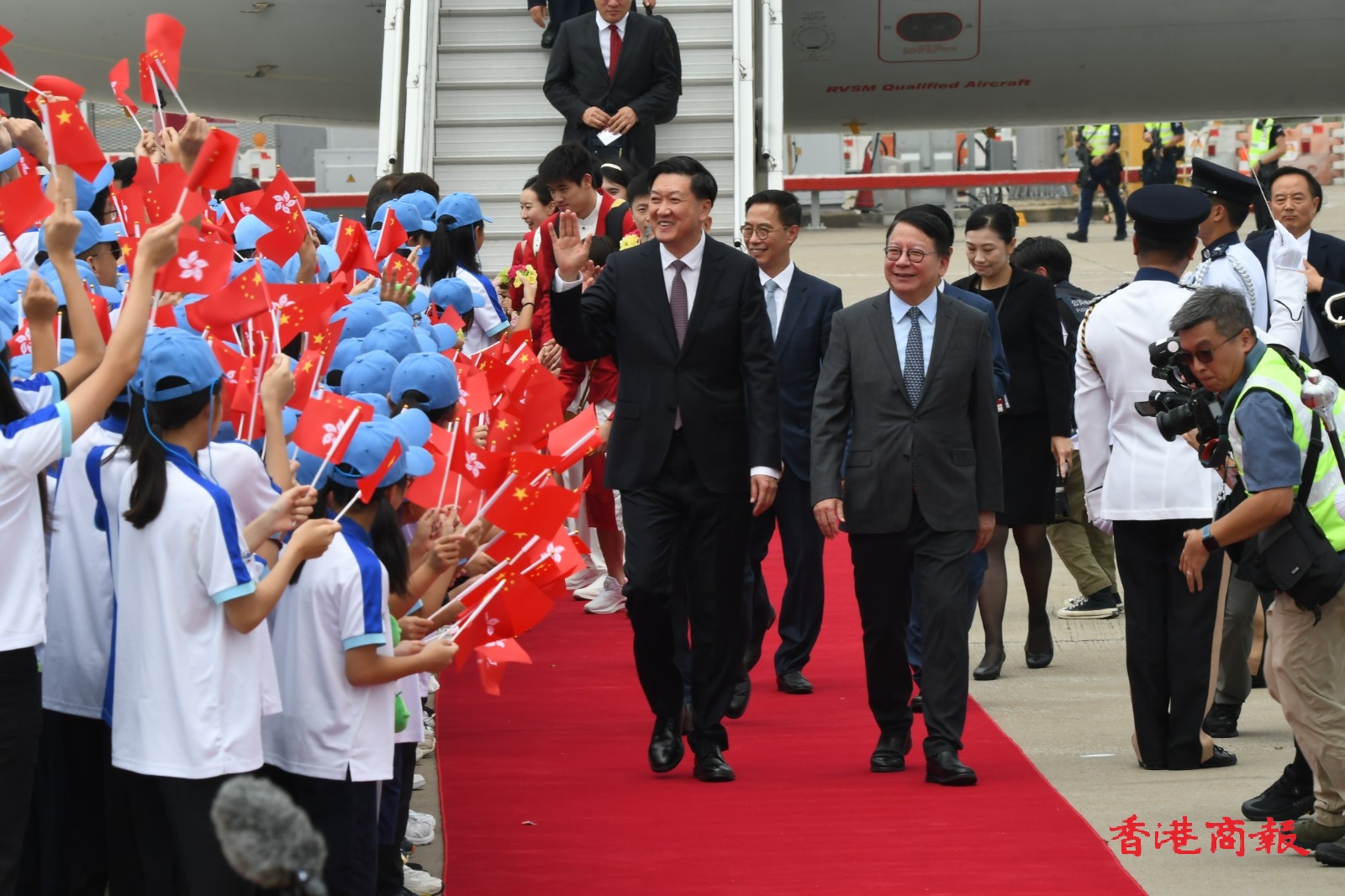 8月29日中午約12時,由馬龍、全紅嬋、潘展樂等65名在巴黎奧運會上取得佳績的運動員和8名教練員組成的內地奧運健兒代表團抵達香港國際機場,香港各界熱烈歡迎。特區政府在停機坪舉行熱烈的歡迎儀式,表達各界對奧運健兒的熱切期待。(記者 馮瀚文 攝)