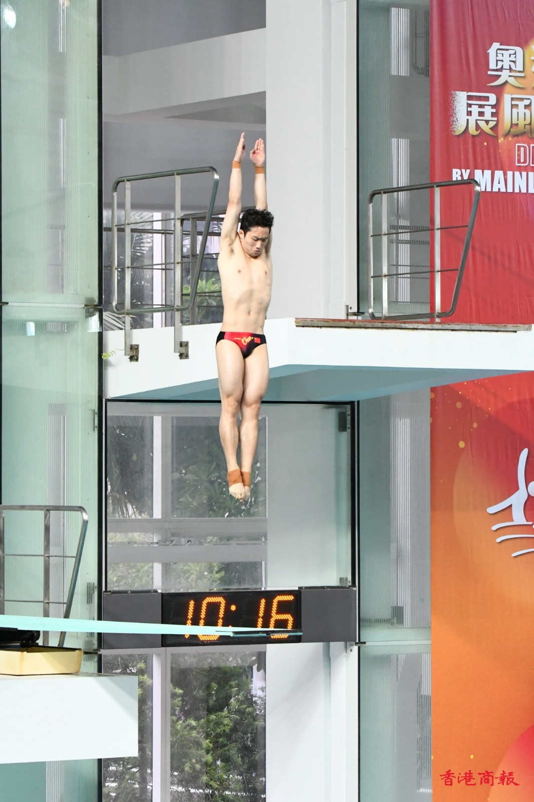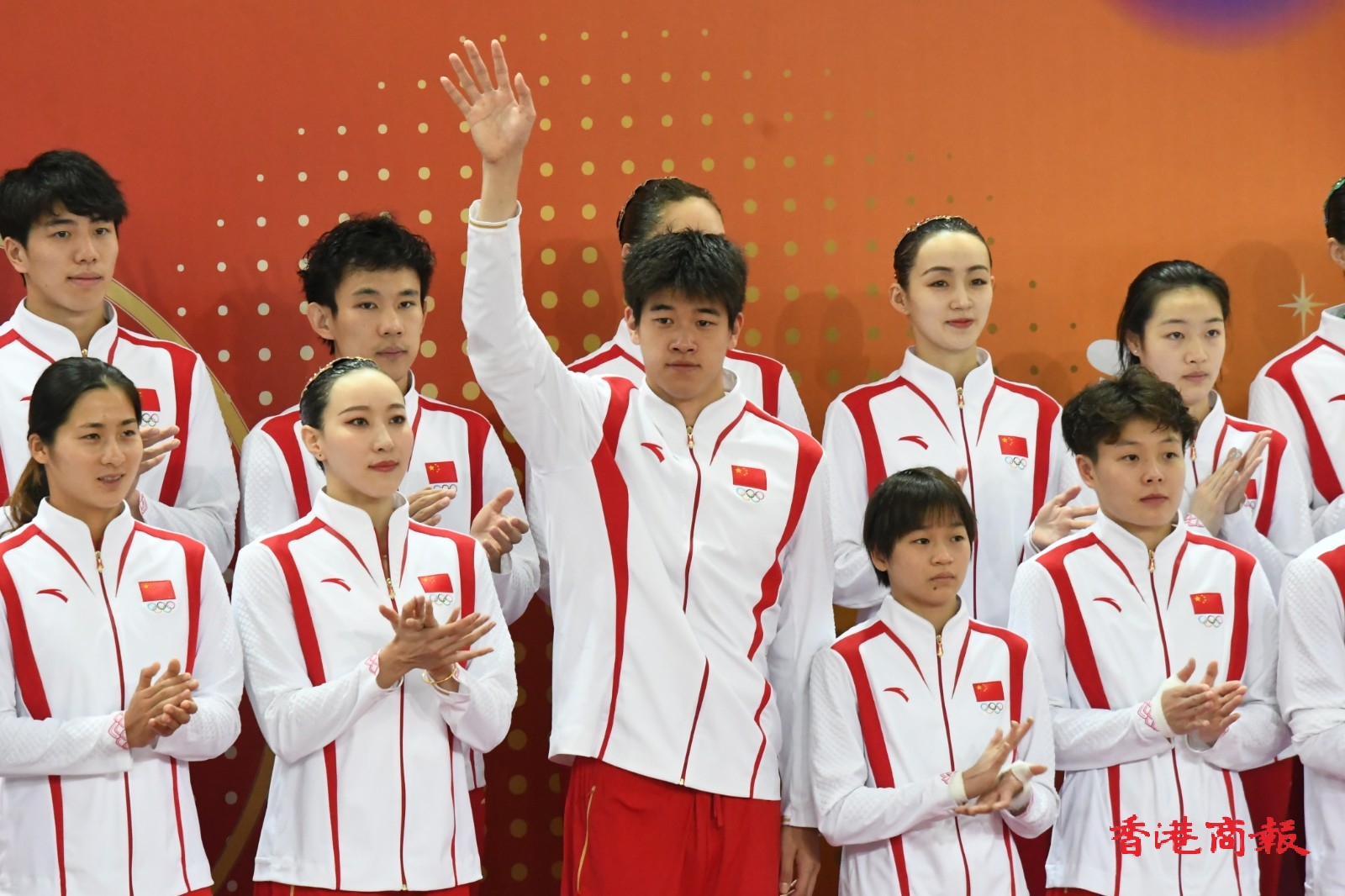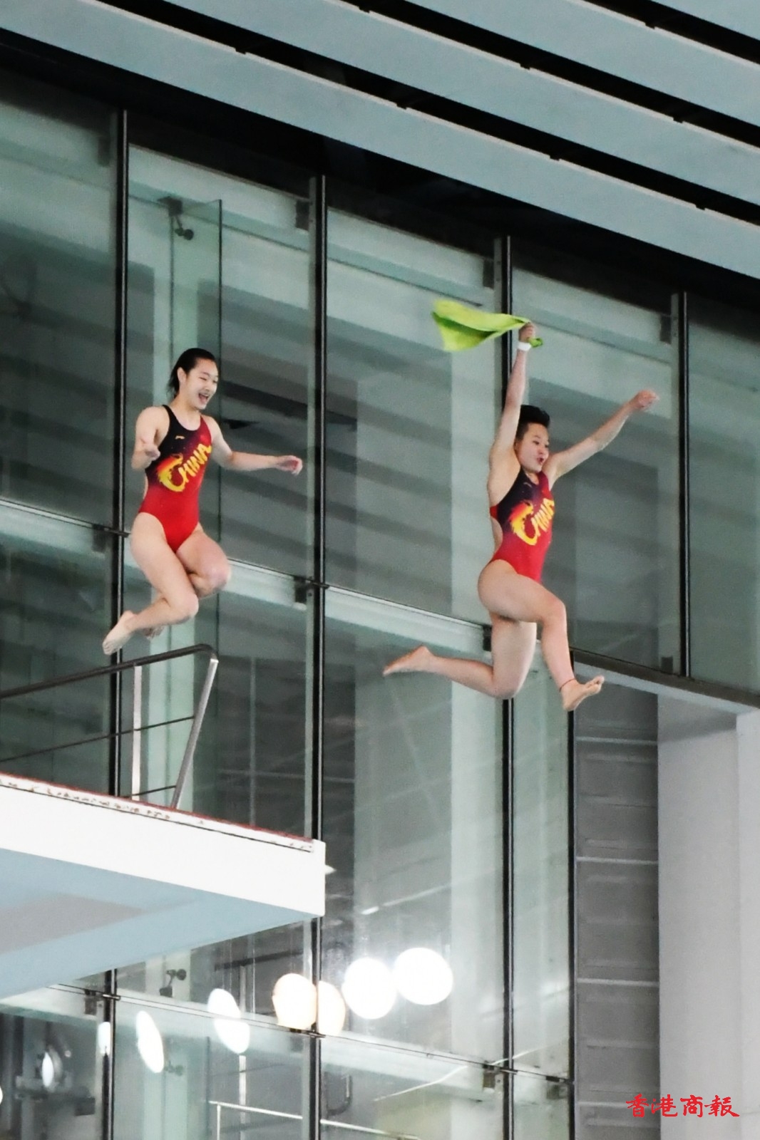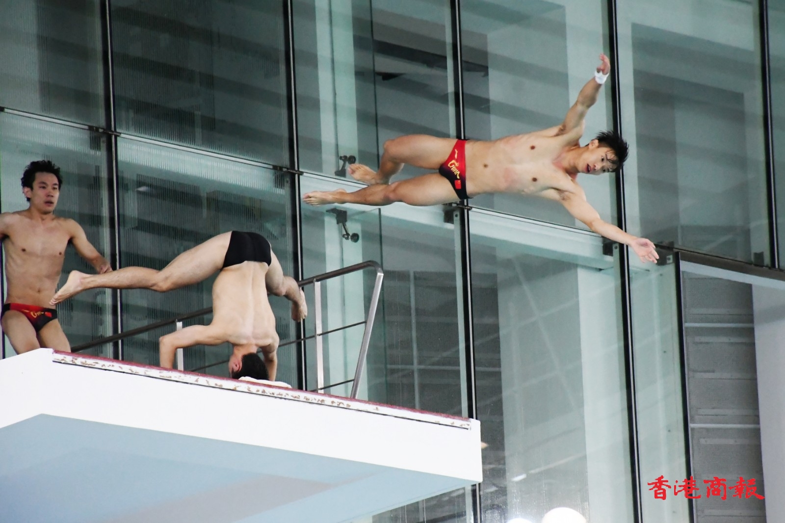 熱身階段,全紅嬋、陳芋汐等人陸續試跳,引起陣陣歡呼;其後登上10米高台練習,全紅嬋持手機與隊友自拍,並與昌雅妮及陳藝文為大家展示10米高台「三人跳水」。