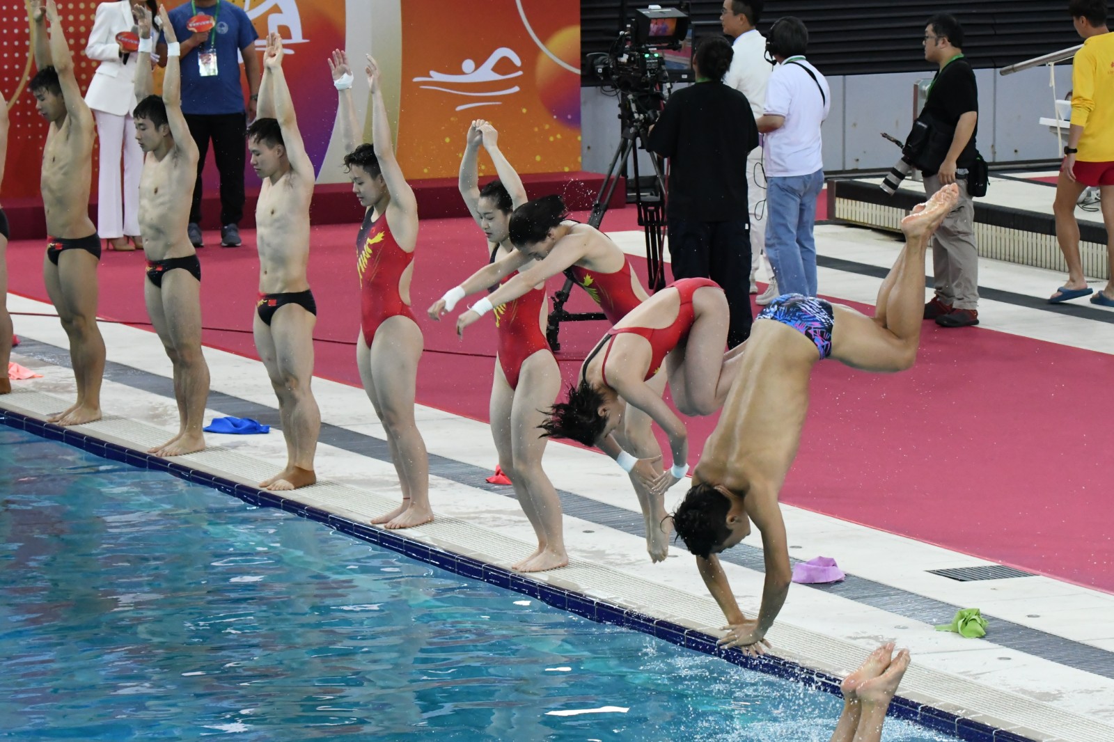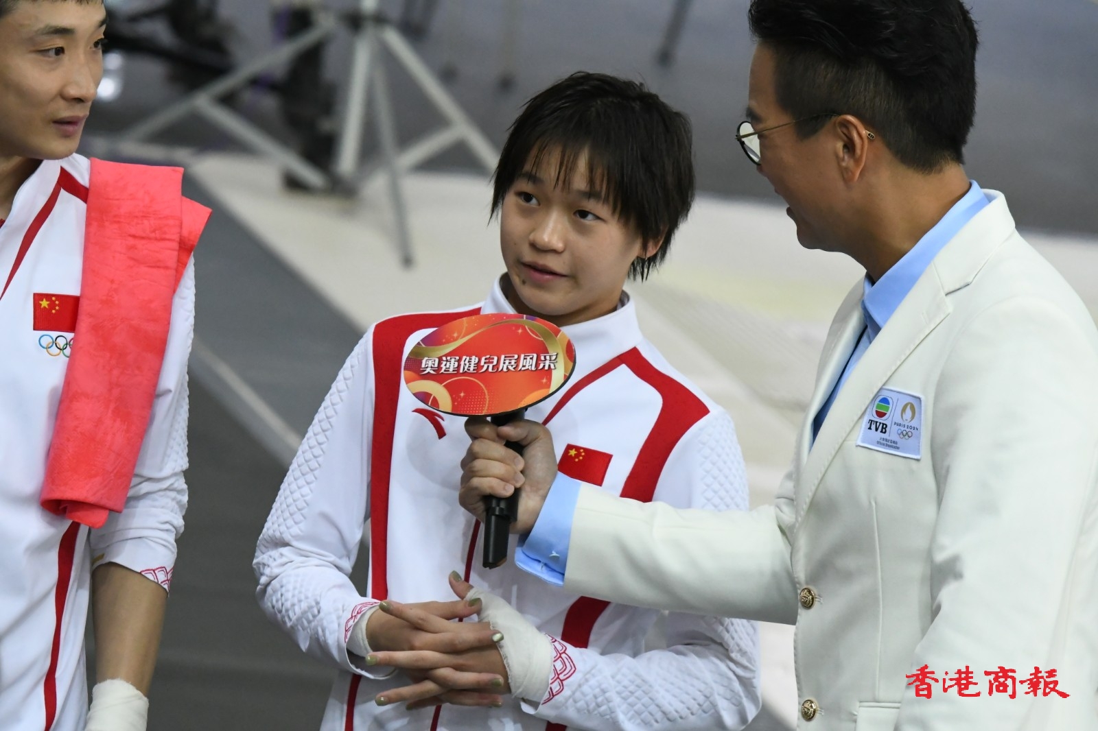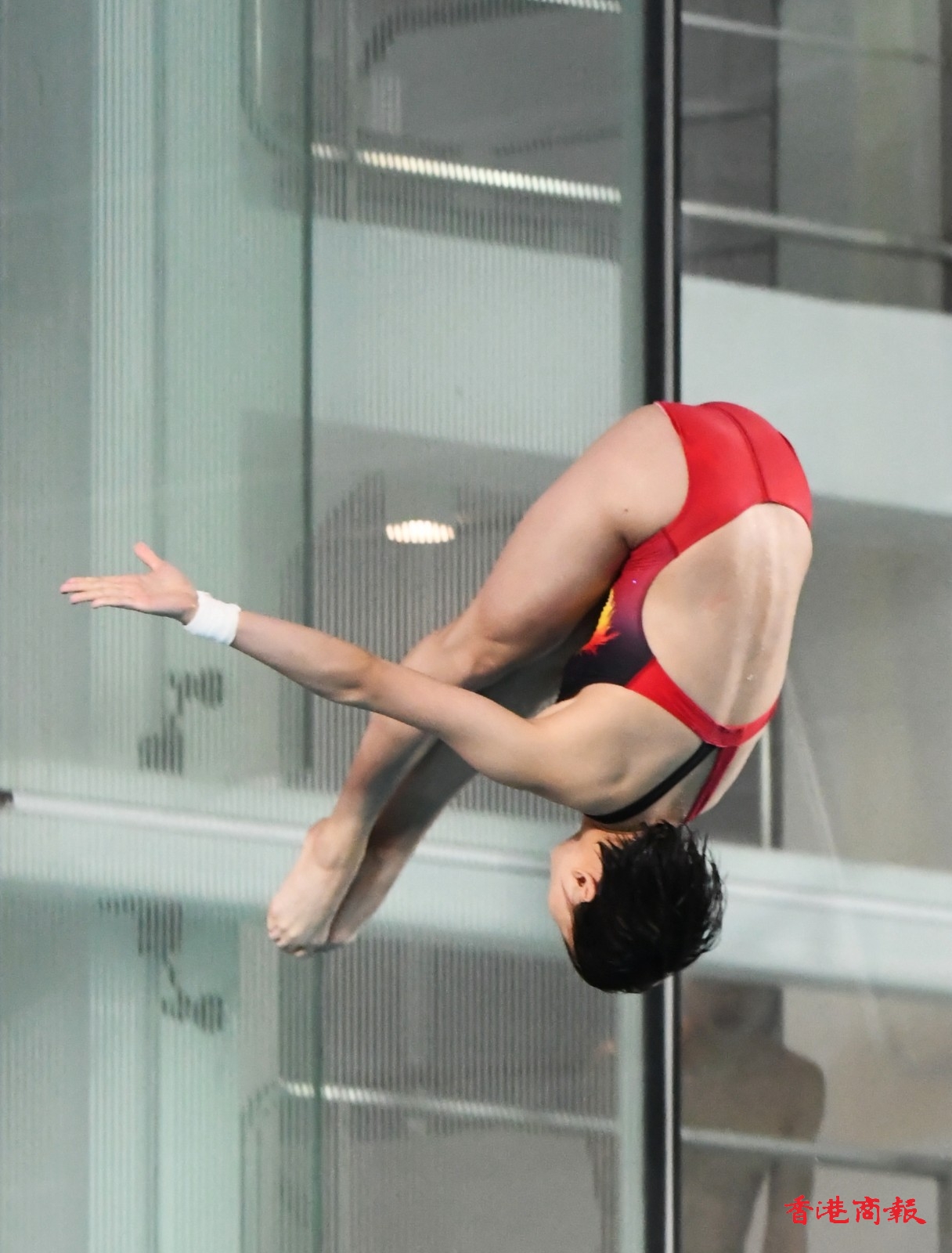 熱身階段,全紅嬋、陳芋汐等人陸續試跳,引起陣陣歡呼;其後登上10米高台練習,全紅嬋持手機與隊友自拍,並與昌雅妮及陳藝文為大家展示10米高台「三人跳水」。