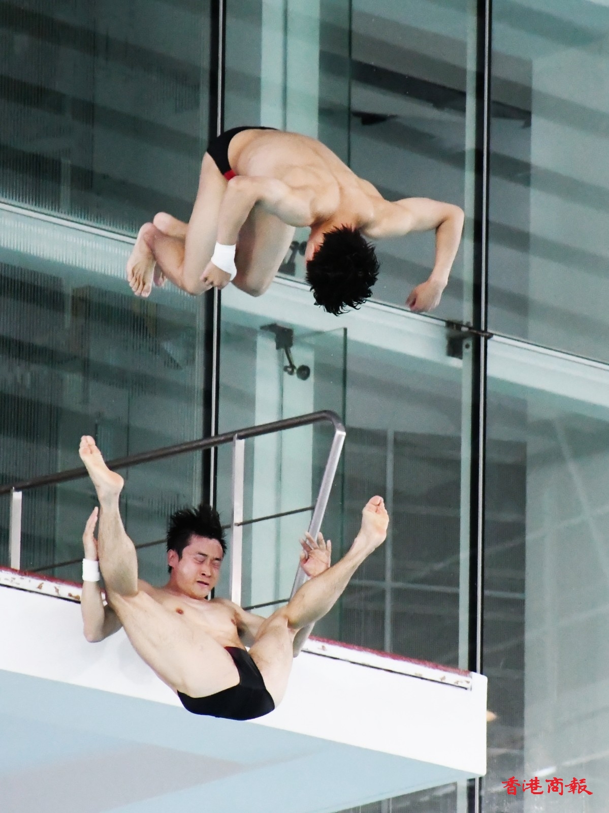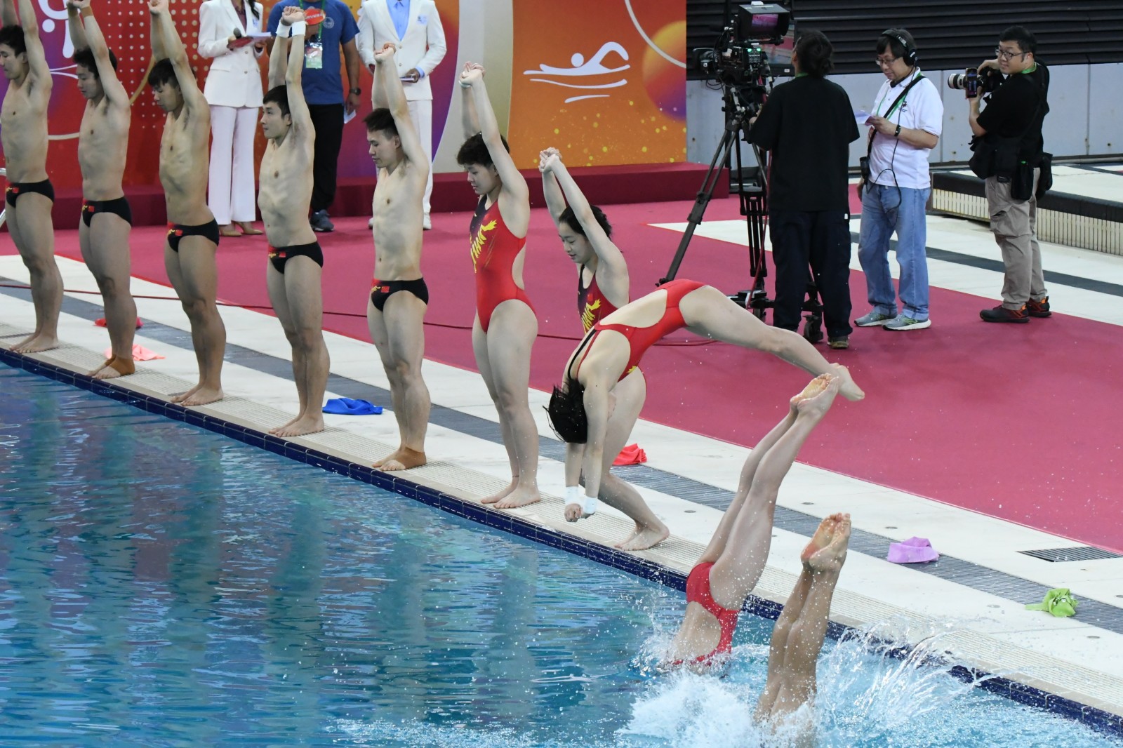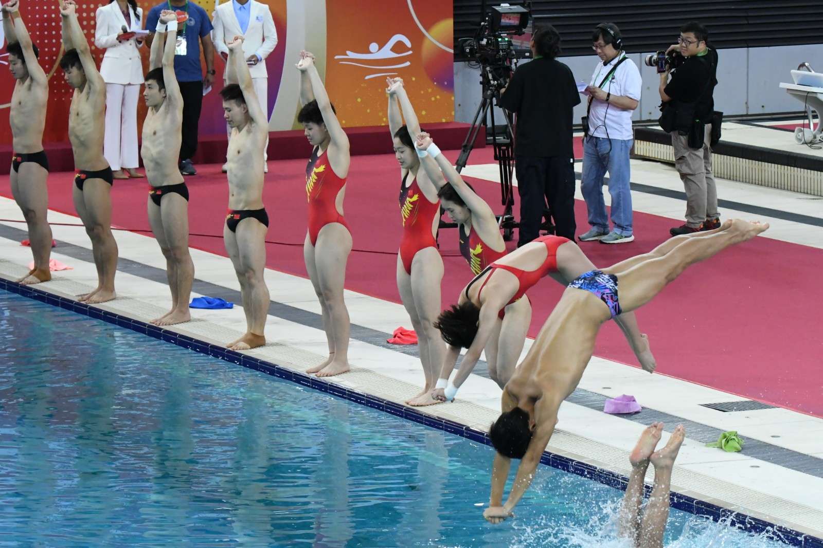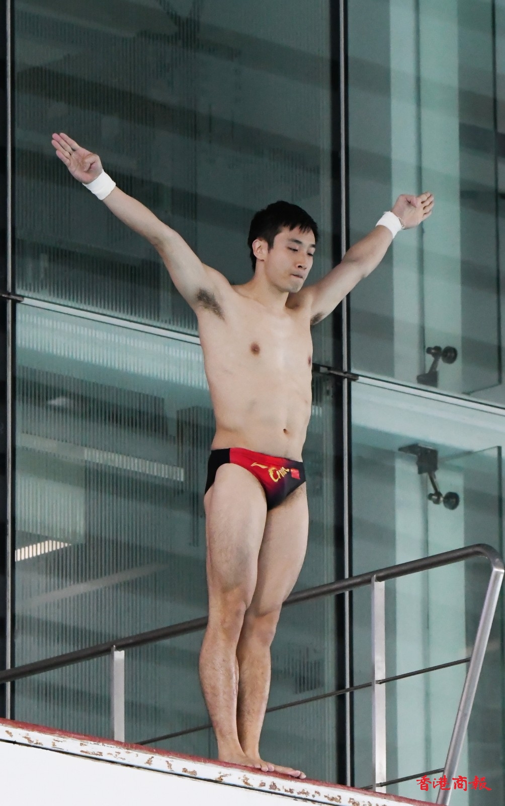 熱身階段,全紅嬋、陳芋汐等人陸續試跳,引起陣陣歡呼;其後登上10米高台練習,全紅嬋持手機與隊友自拍,並與昌雅妮及陳藝文為大家展示10米高台「三人跳水」。