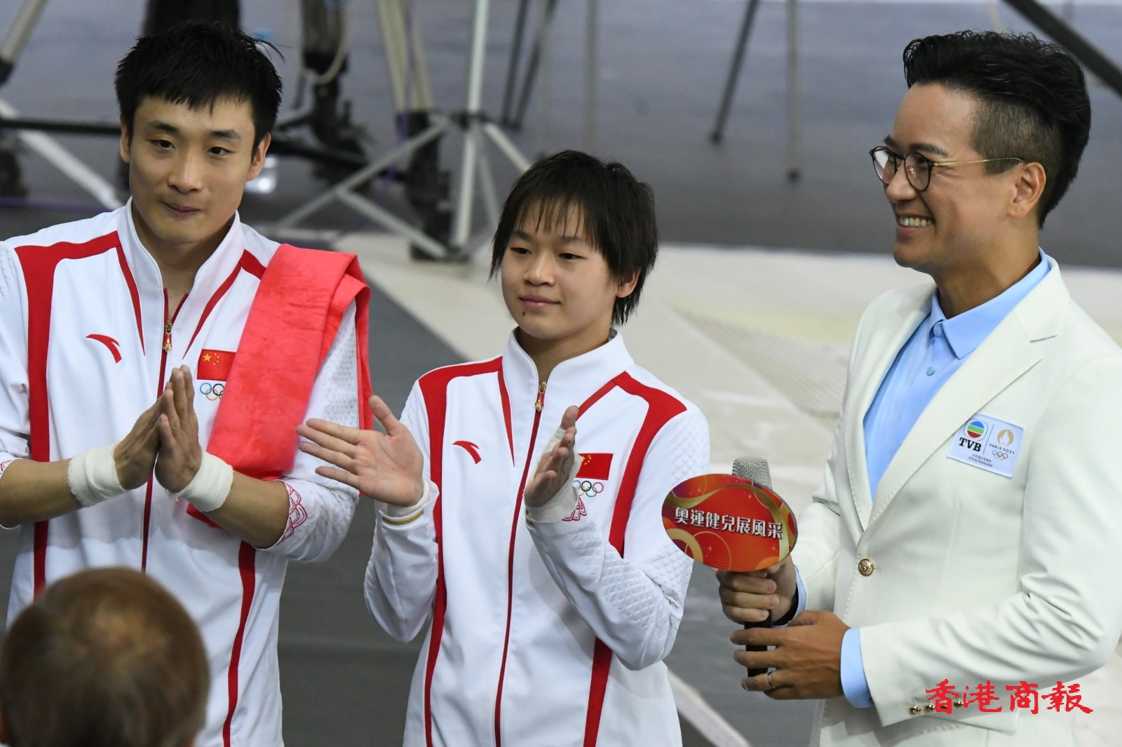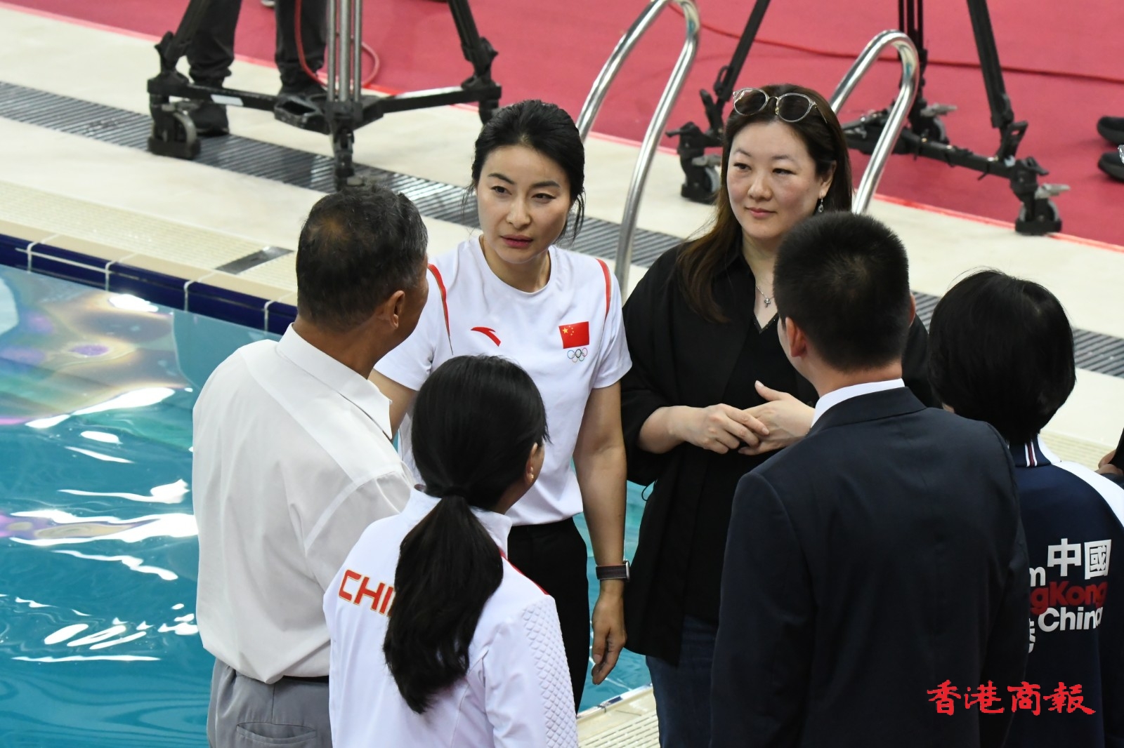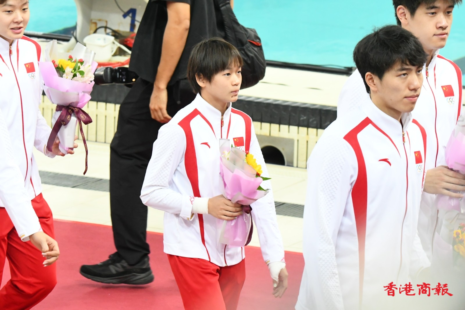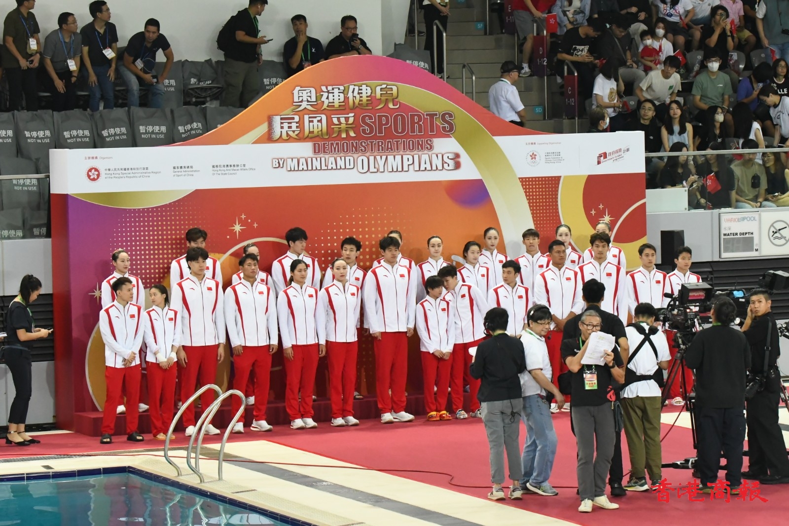 今日(31日)巴黎奧運內地奧運健兒代表團最後一日訪港行程,運動員們於9時30分至11時30分,分別在伊利沙伯體育館及維園游泳,進行羽毛球、體操及乒乓球示範表演,和跳水及游泳示範表演。其中,潘展樂、覃海洋、徐嘉余、全紅嬋、陳芋汐、陳藝文及昌雅妮等26名金牌運動員在維園泳池,分別示範了3米及10米高台跳水、韻律泳、反身翻騰轉體、抱膝翻騰等動作。兩代「跳水女王」郭晶晶和伏明霞驚喜現身。