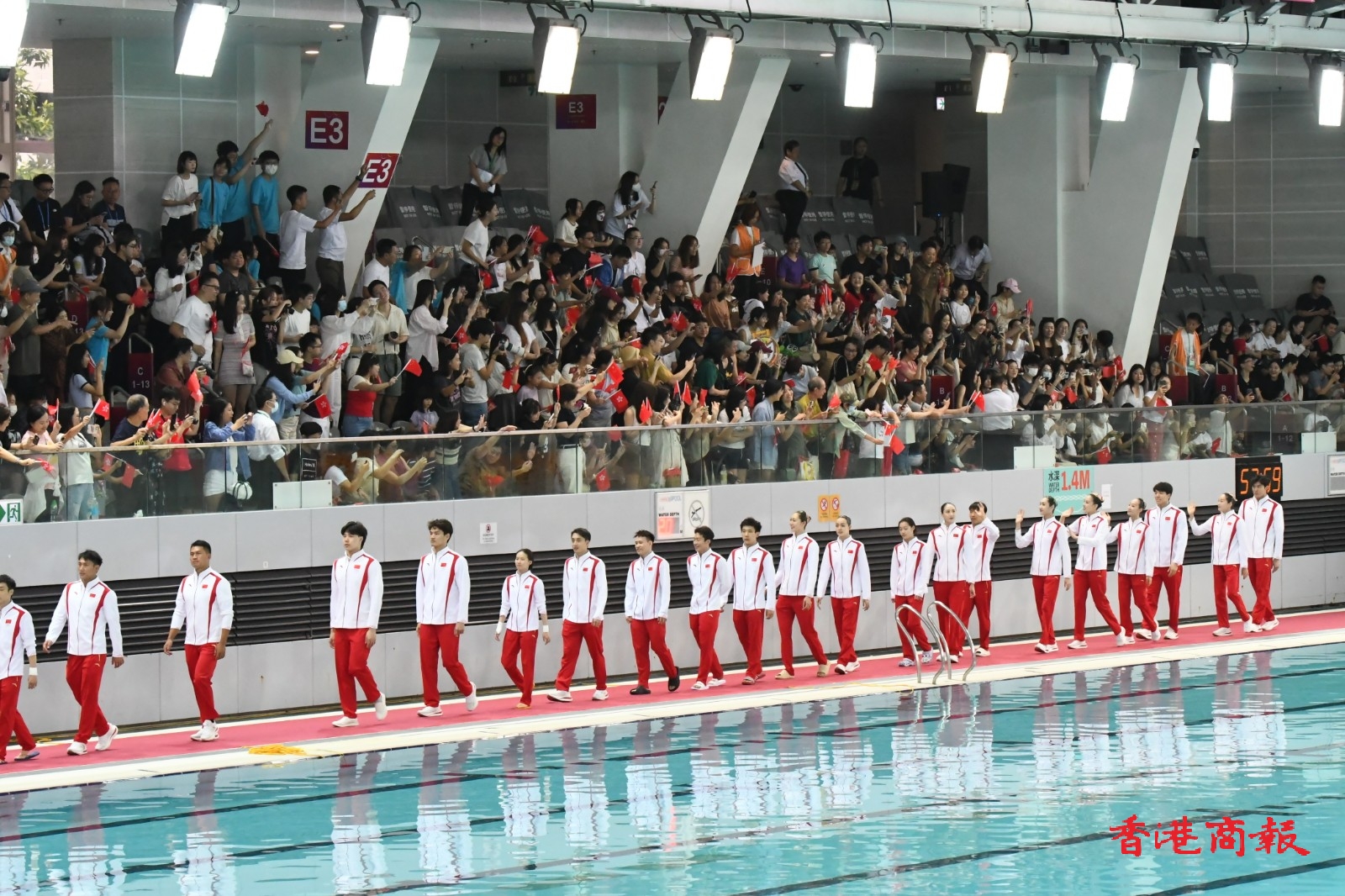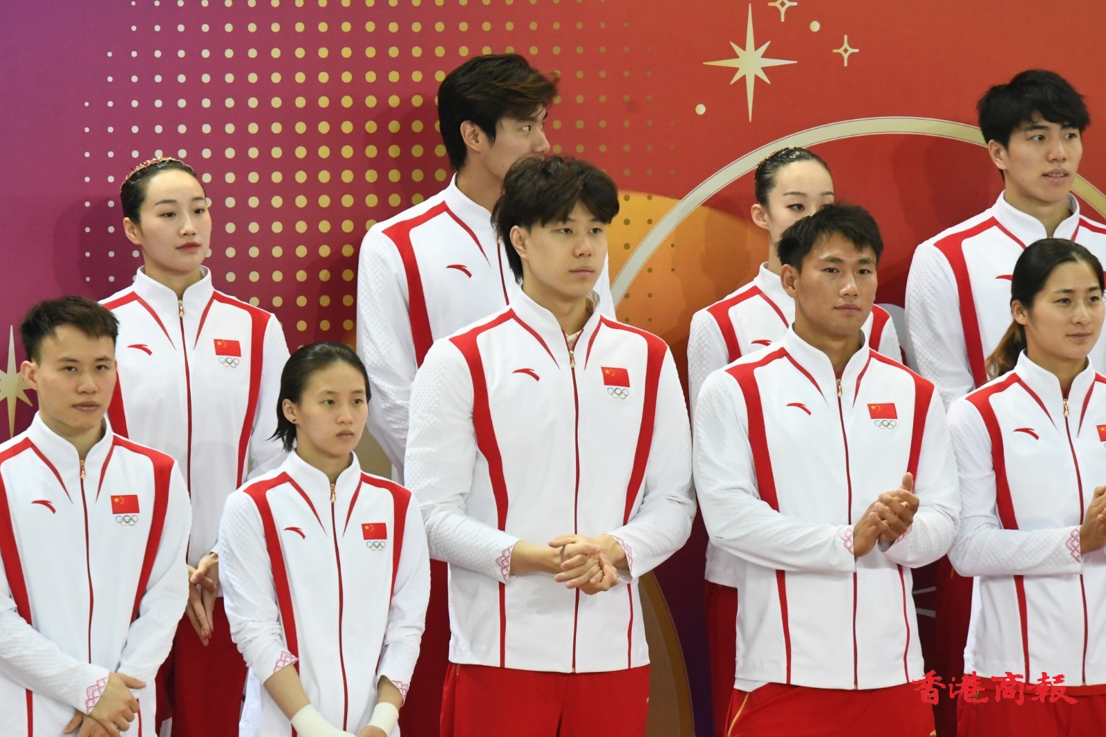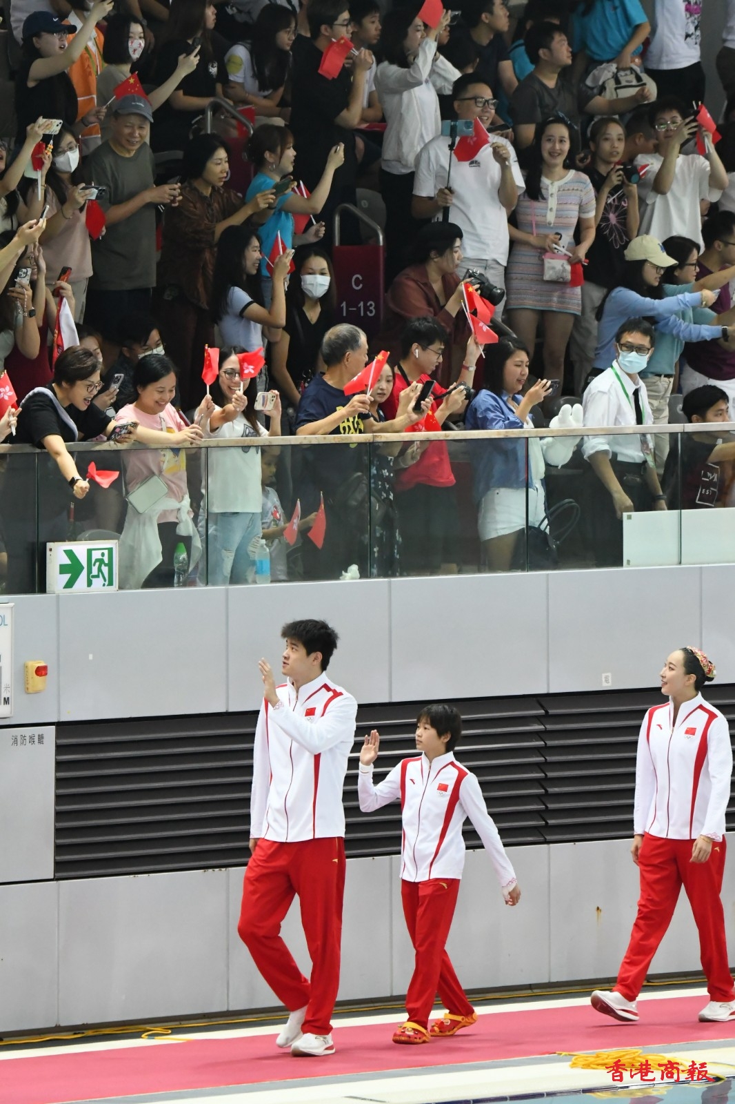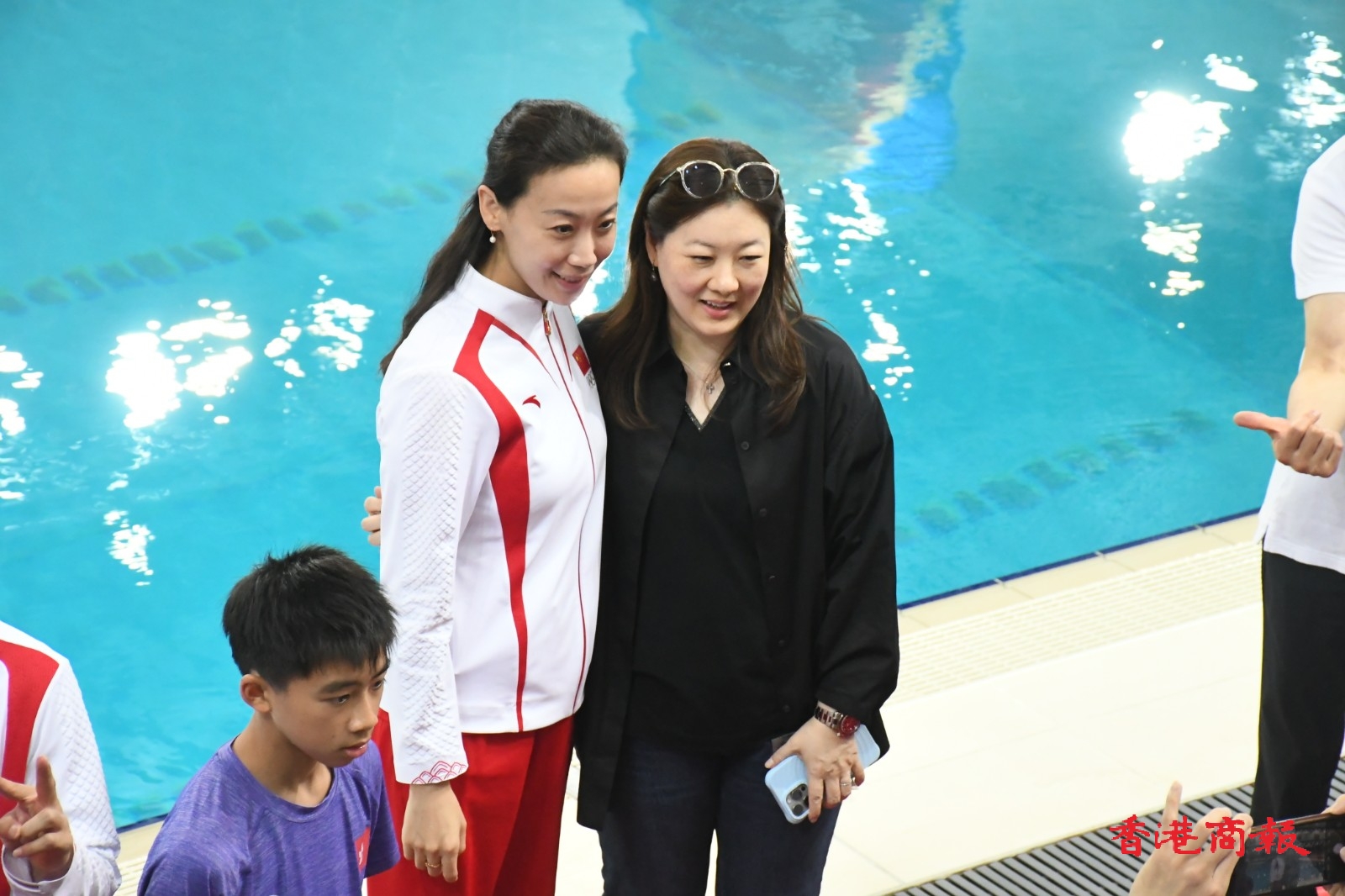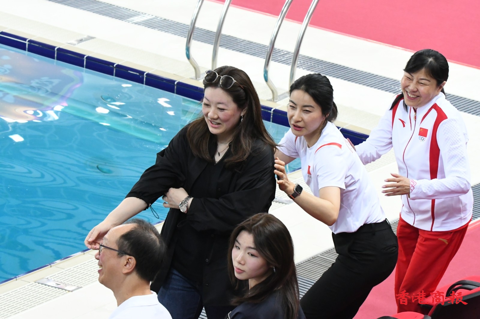 今日(31日)巴黎奧運內地奧運健兒代表團最後一日訪港行程,運動員們於9時30分至11時30分,分別在伊利沙伯體育館及維園游泳,進行羽毛球、體操及乒乓球示範表演,和跳水及游泳示範表演。其中,潘展樂、覃海洋、徐嘉余、全紅嬋、陳芋汐、陳藝文及昌雅妮等26名金牌運動員在維園泳池,分別示範了3米及10米高台跳水、韻律泳、反身翻騰轉體、抱膝翻騰等動作。兩代「跳水女王」郭晶晶和伏明霞驚喜現身。