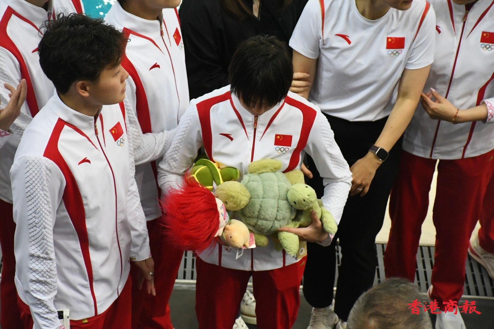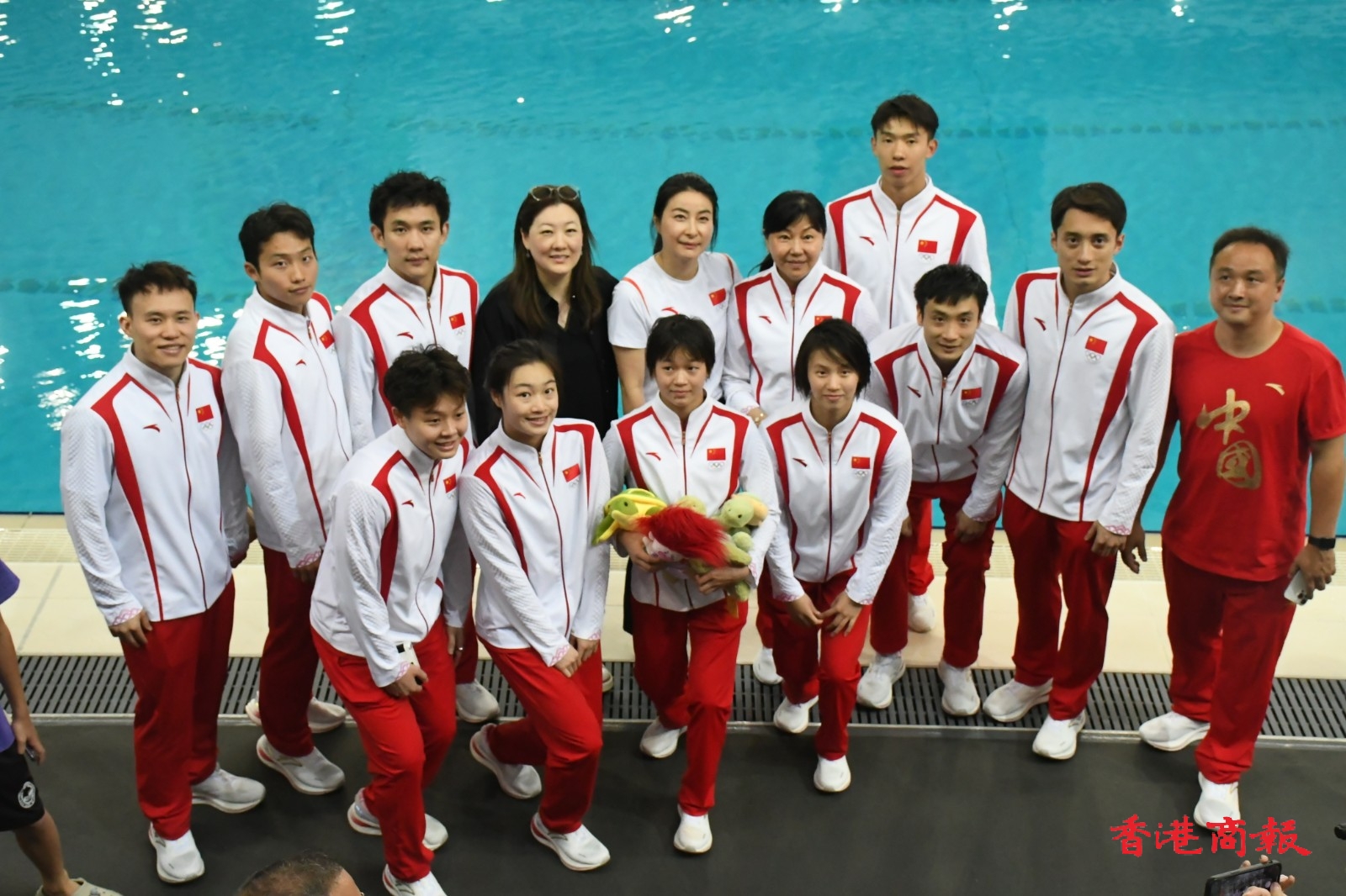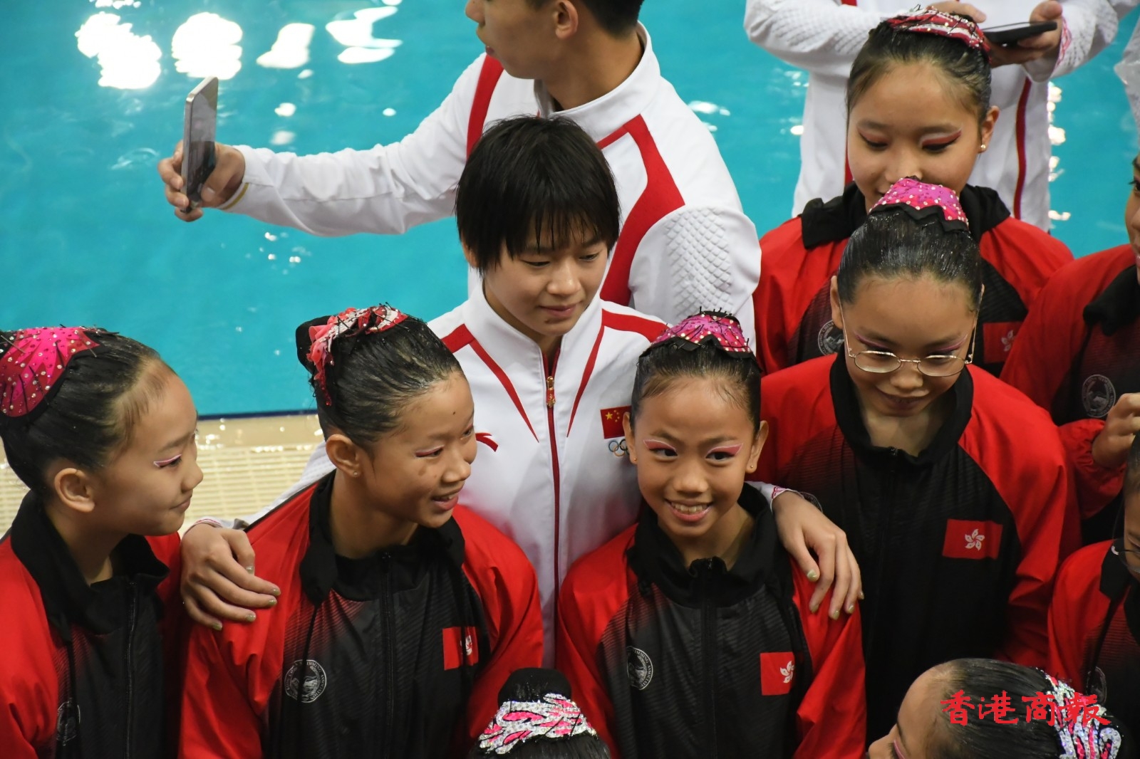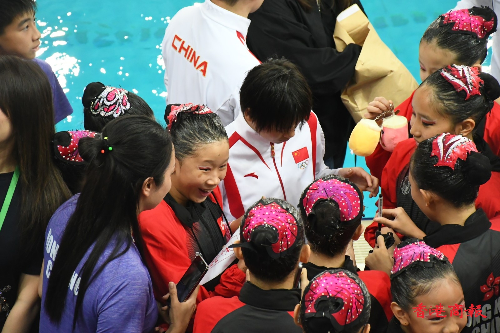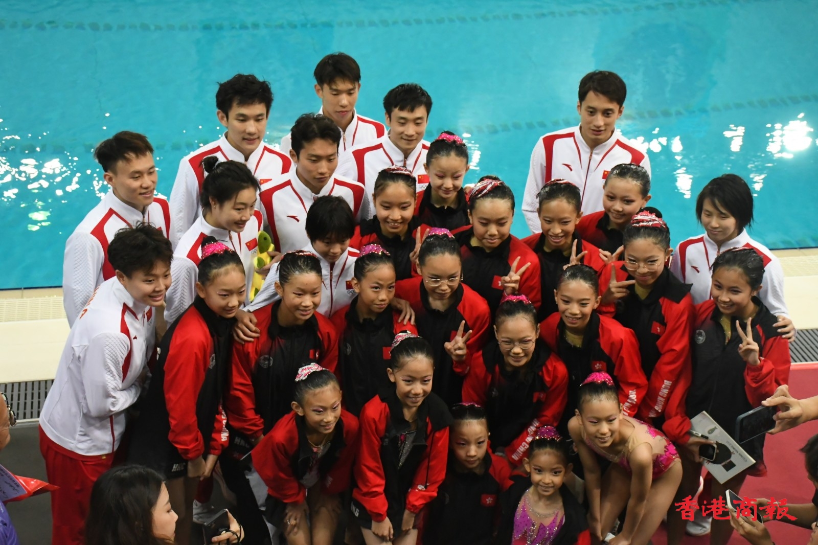表演結束後,跳水運動員們與香港青少年合影,多名青少年圍着全紅嬋要簽名,全紅嬋又收獲了多隻由粉絲贈送的綠色烏龜公仔;另外,郭晶晶和伏明霞與跳水隊交流合影。