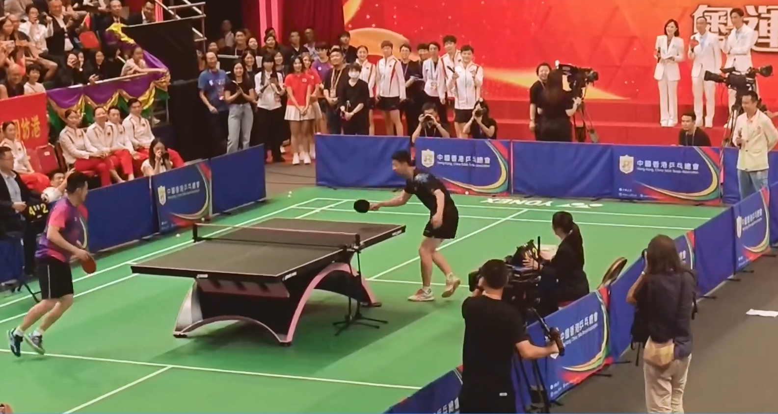 樊振東、王楚欽與黃鎮廷、杜凱琹對打時,由於樊振東、王楚欽技術太好,港隊總教練李靜為他們換了小球拍。最終,港隊以5比2勝出。