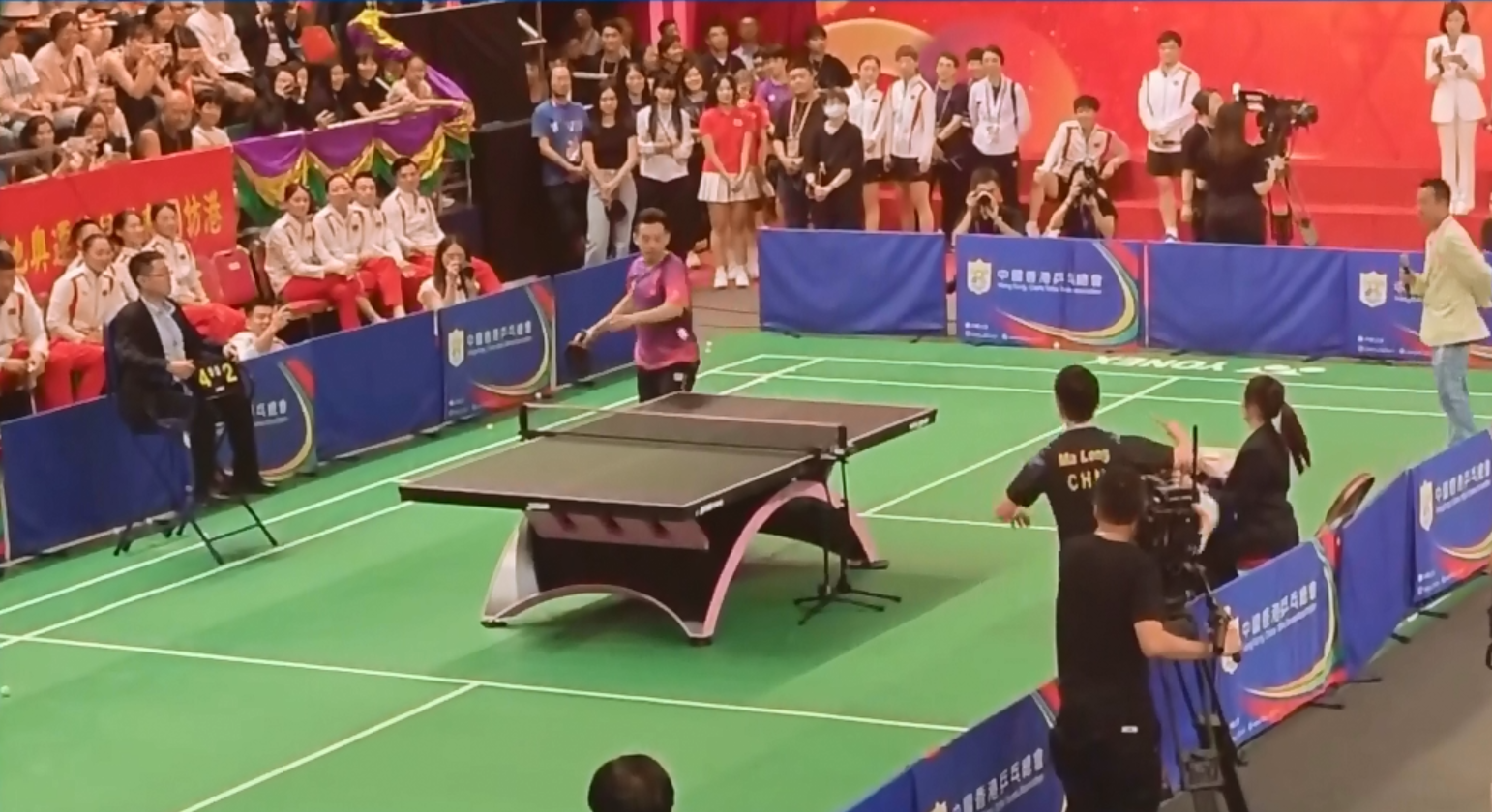 馬龍對戰黃鎮廷大秀球技,展示了背後發球、360度打球等,還俏皮地用手發球,引發全場觀眾歡呼,激動大叫「馬龍太全面」「六邊型戰士」,最終馬龍以5比2勝出。