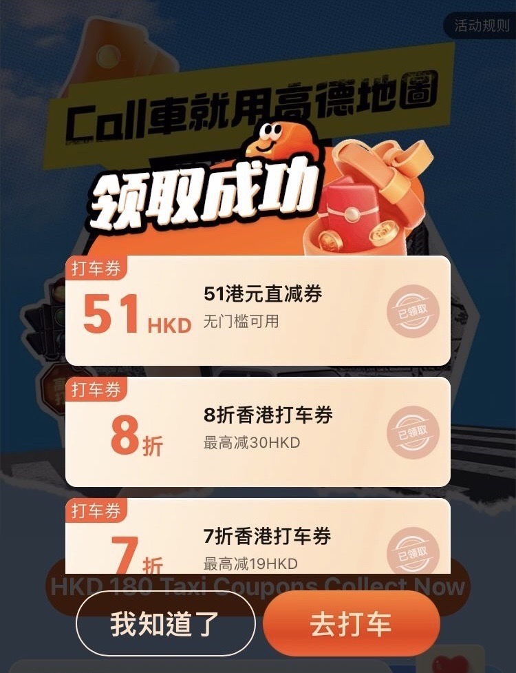 作為頭炮推廣,「高德地圖」會向旅客派發總值超過港幣1000萬元的「Call 車」獎賞。旅客即日(9月18日)起至10月7日(星期一)期間,於「高德地圖」手機應用程式內搜尋「遊香港」,即可免費領取港幣180元的「Call 車紅包」,以及享有車費八折優惠。
