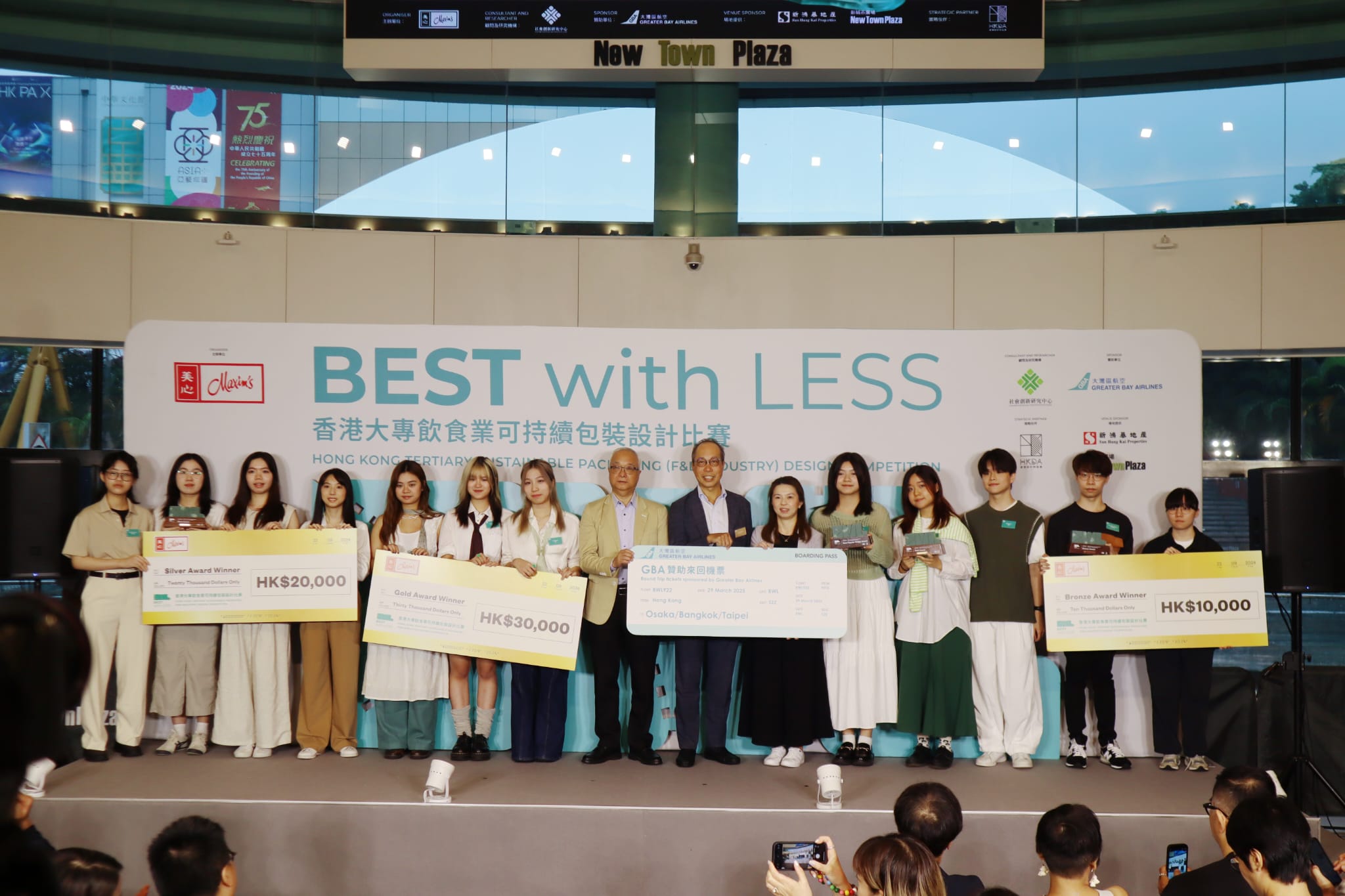 「BEST with LESS 香港大專飲食業可持續包裝設計比賽」的冠、亞、季軍分別為綠饗 GREENMAX、自信門派CONFIDENT SECT、傳意達無限VC TO THE INFINITY,他們會贏得美心獎學金及由大灣區航空贊助由香港出發之免費來回機票,其作品亦將有機會被美心旗下餐廳採用。至於「優異創作獎」分別是RHIKNOWLES 、WINGIT、V523 STUDIO,最受歡迎設計獎同樣由冠軍團隊綠饗GREENMAX奪得,可獲美心飲食禮券及獎學金,總值1萬元。