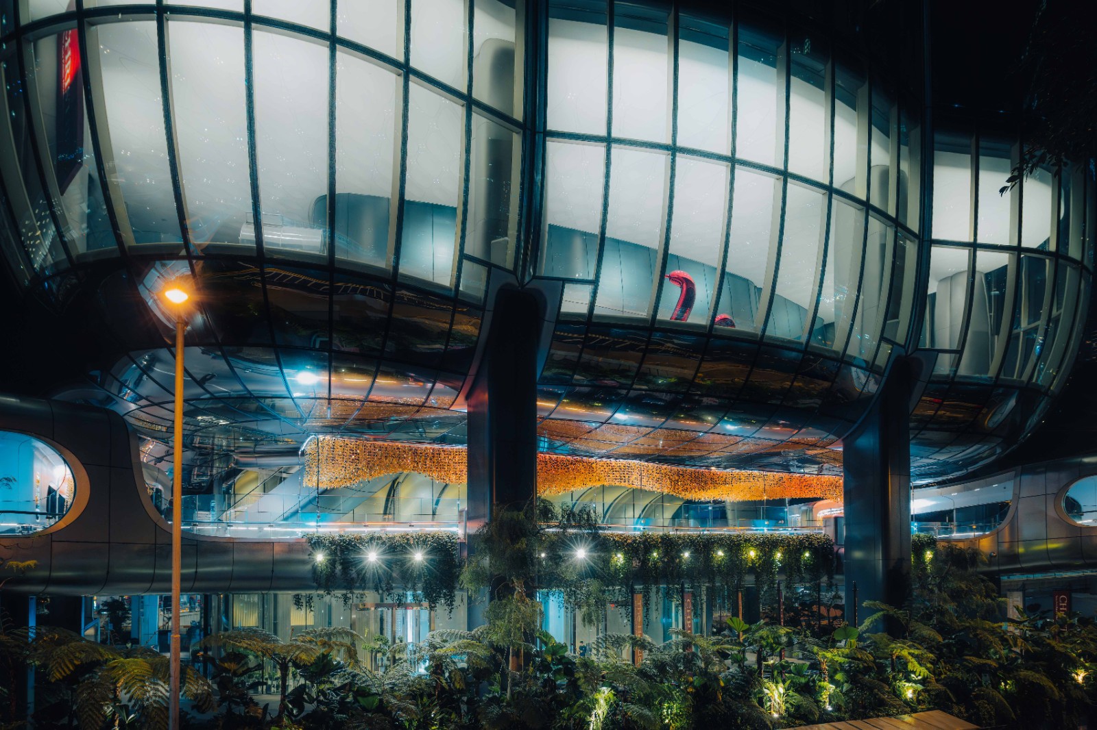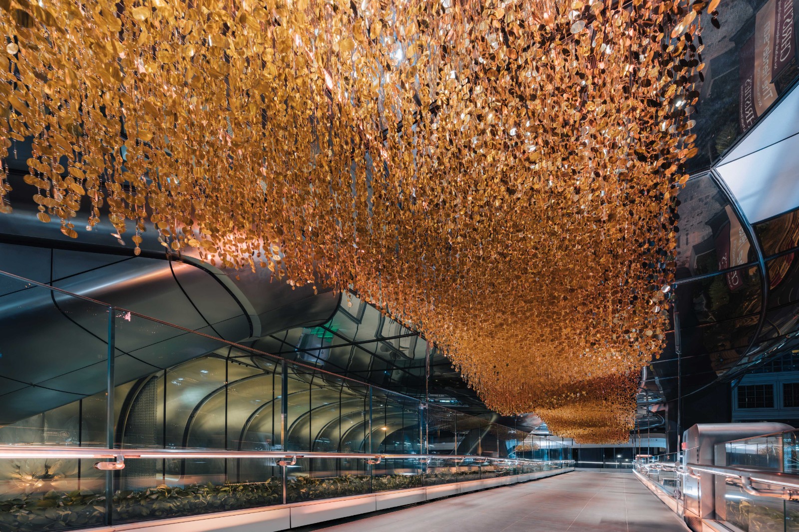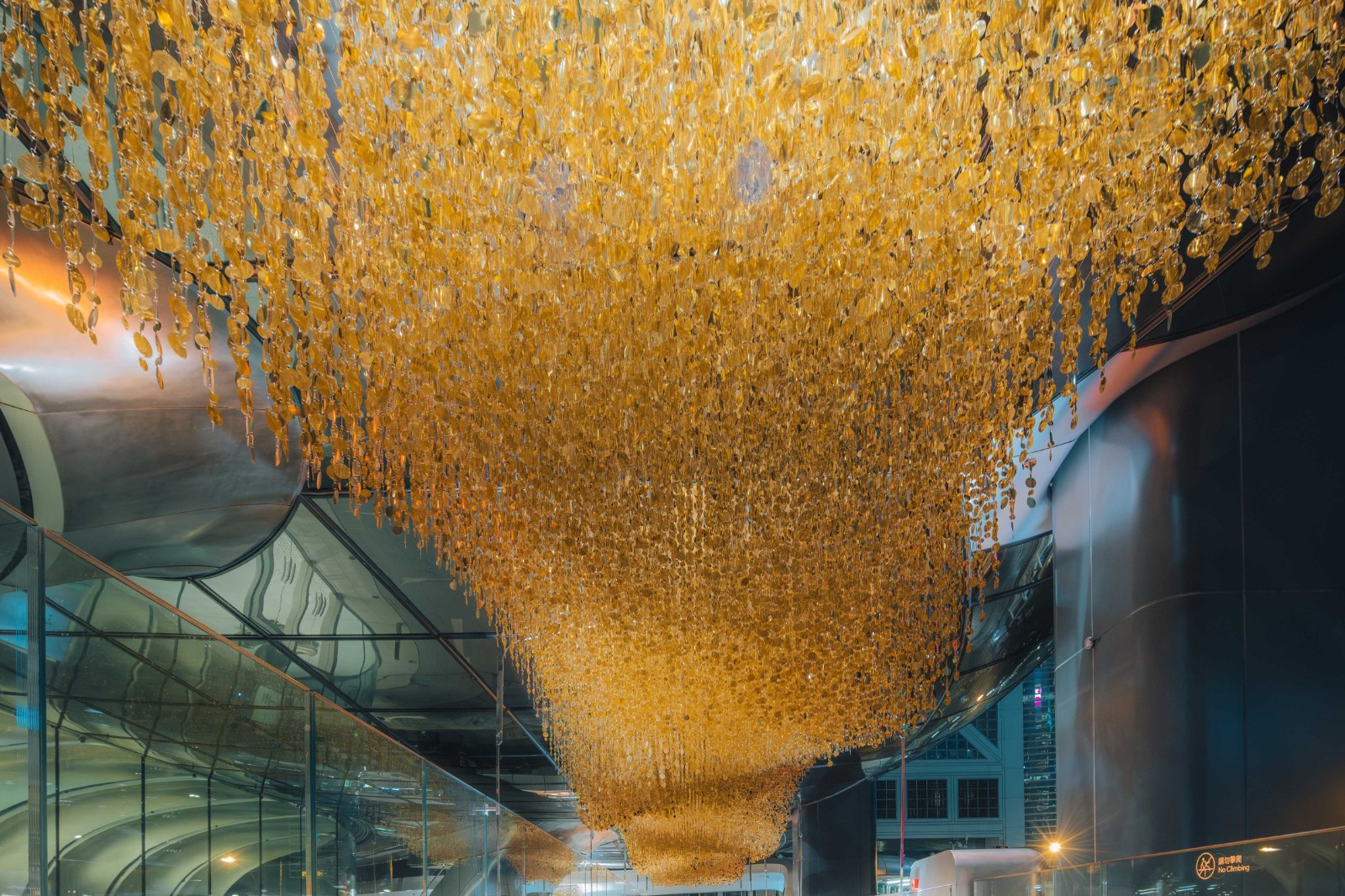 「Glittering Golden Christmas」藝術裝置由25萬塊金色珠片組成,一串串如星河般閃爍的珠片,懸掛於長達80米的行人天橋頂部,形成一條璀璨的聖誕金色長廊。隨風搖曳的珠片,配合燈光效果,折射出美輪美奐的炫目光影,無論白天或夜晚,都讓人宛如穿梭於漫天星海之中。藝術裝置將展出至2025年1月2日。