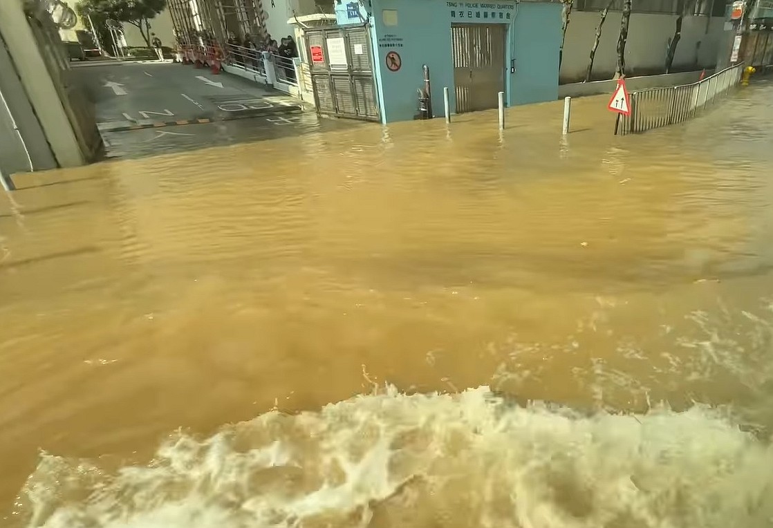 青衣警署今日(5日)上午發生爆水管事故,鹹水湧出路面,淹浸行車線,水深約數吋。警員在警署外指揮交通,行經車輛均慢駛涉水而行,水務署工人接報到場搶修。