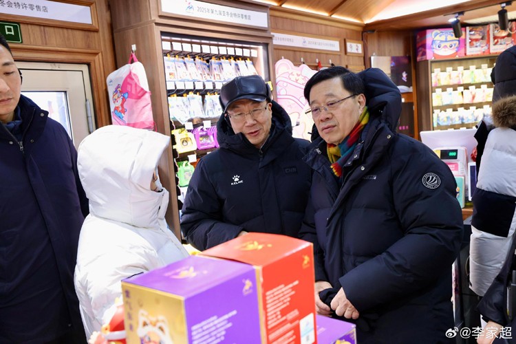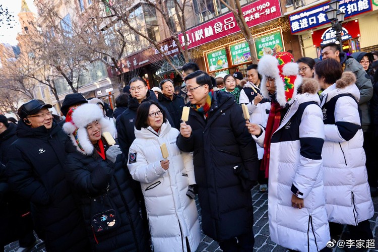 李家超又說,另外,他趁觀賽前的空檔時間到訪了被譽為「亞洲第一街」的哈爾濱中央大街。這條步行街擁有125年歷史,特設亞冬會主題旗艦店,熱銷限量版吉祥物「濱濱」與「妮妮」周邊產品,結合賽事IP與在地文化,提升訪客的沉浸式體驗。他和太太還在嚴寒下品嘗了哈爾濱特色馬迭爾冰棍和煙囪麵包,感受冰城的魅力。(圖源:李家超社交媒體)