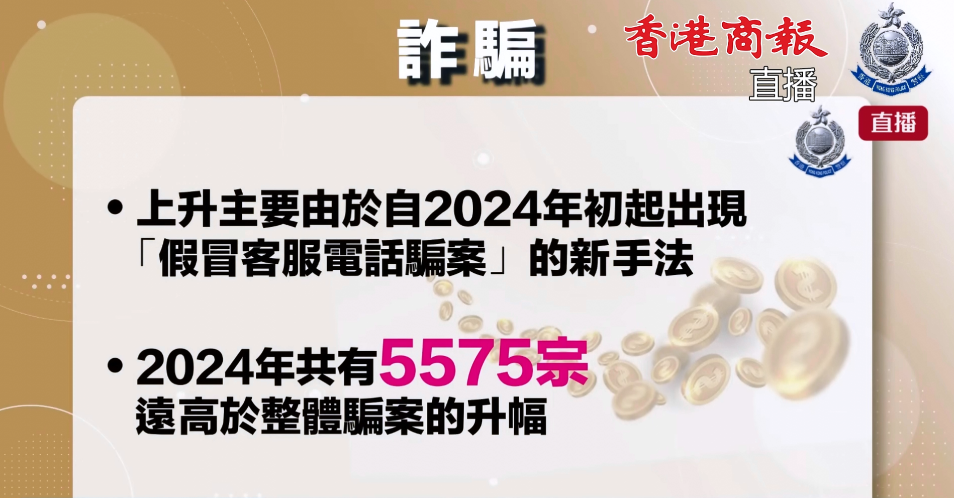 詐騙案上升主要由於自去年初開始出現「假冒客服」電話騙案的新手法,2024年共有5575宗,遠高於整體騙案4656宗的升幅。警方連月來加強執法及針對性的宣傳教育,此類騙案數字已由去年7月單月錄得超過1100宗的高峰,回落一半至第四季每月平均500多宗,但仍然相當高,警方會繼續進行相關工作。