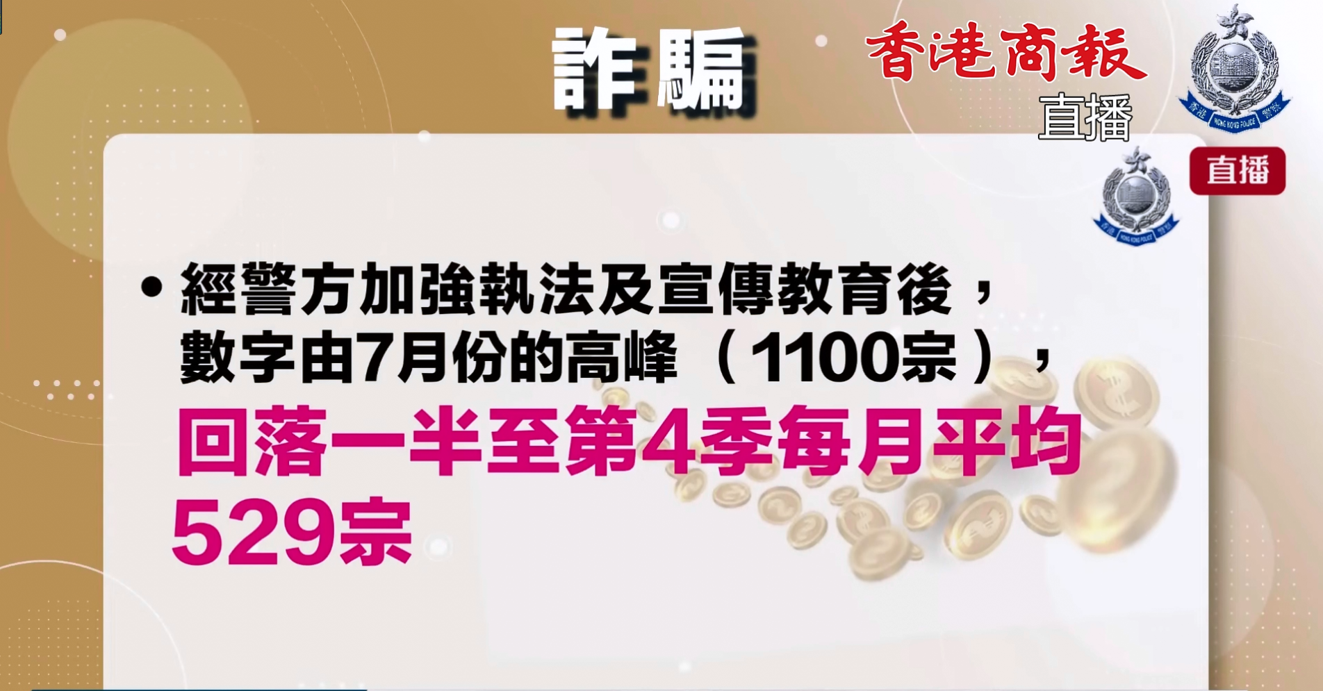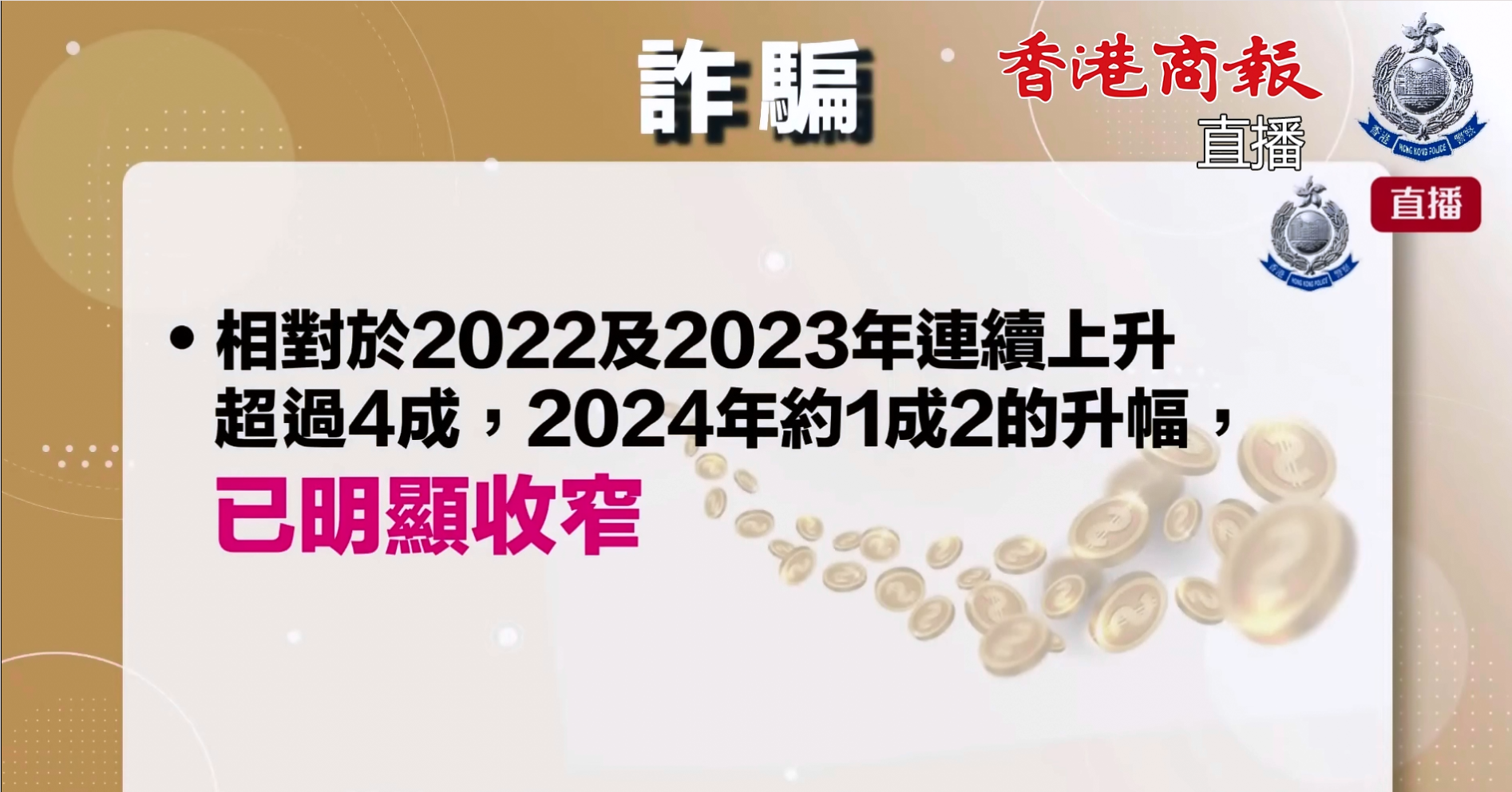 就過去幾年騙案的趨勢而言,相對於2022及2023年連續上升超過四成,2024年約一成二的升幅,已明顯收窄,而涉及金額(91.5億元)亦跌3000萬元,可見警方的各類防騙工作,以及與持份者於過去三年推出的多項防騙措施初見成效。