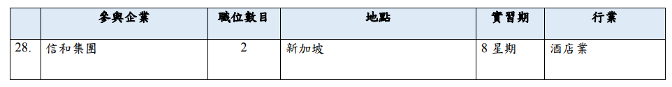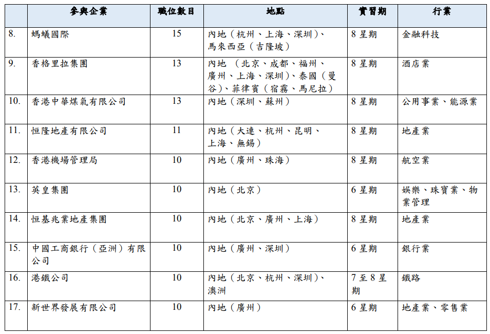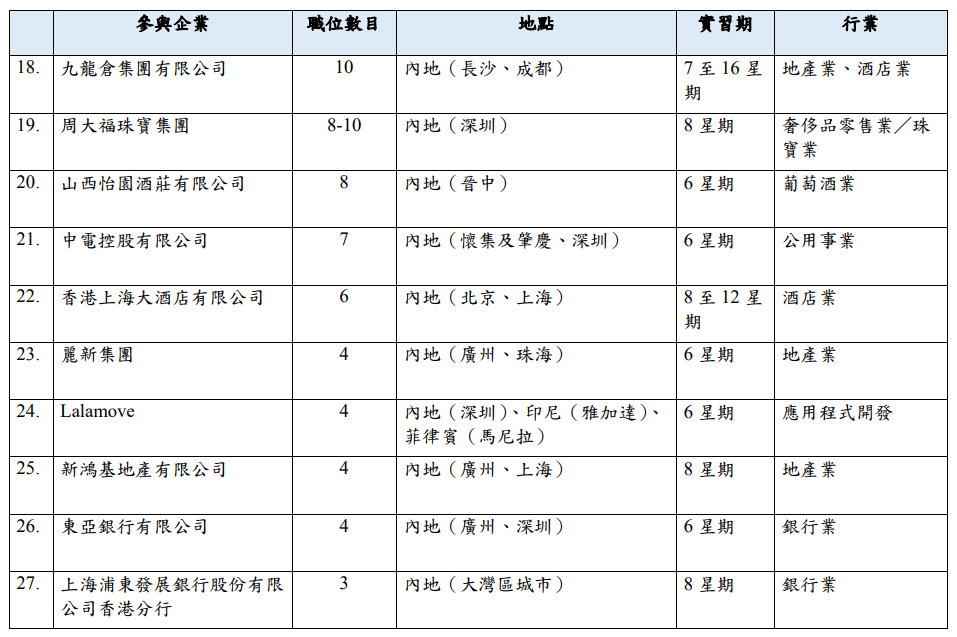 新一輪計劃的參與企業增加至28間,實習崗位遍布內地多個省市,包括多個粵港澳大灣區內地城市、北京、上海、成都、杭州等;海外國家則包括印尼、馬來西亞、新加坡、泰國及澳洲等。實習崗位覆蓋不同行業,包括金融服務、創科、物流、地產、建築、零售、酒店、娛樂和公用事業等(實習職位的詳情見附件)。申請人須為(i)持有香港永久性居民身份證的全日制專上學生(包括副學位、學士學位或研究院課程);或(ii)持有香港居民身份證的本地全日制專上學生(包括副學位、學士學位或研究院課程)。實習期由今年6至9月。參與企業將承擔實習生的交通、住宿費用等主要開支,並委派專責人員提供培訓和支援。