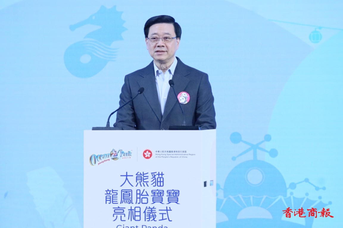 行政長官李家超在大熊貓龍鳳胎寶寶亮相儀式致辭。