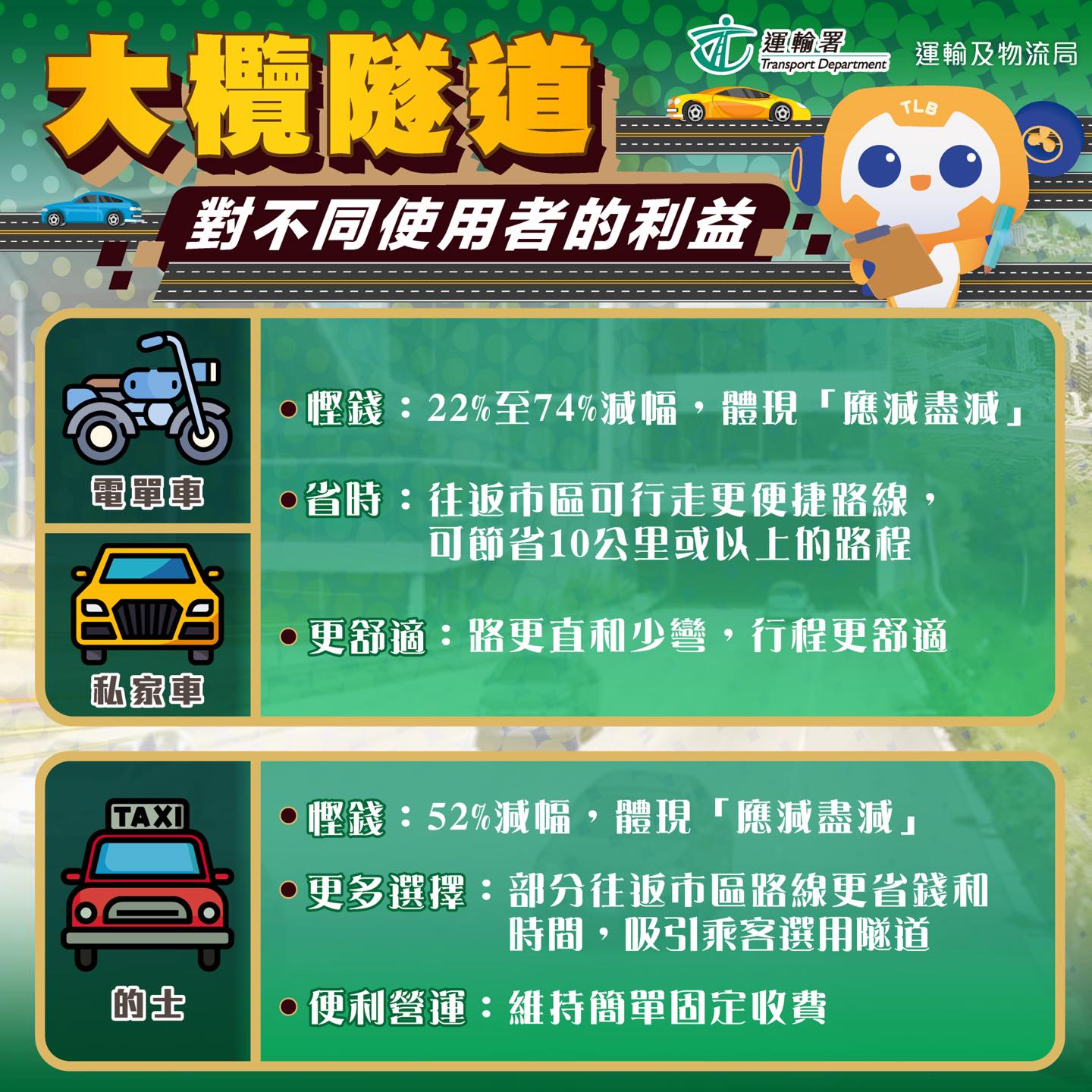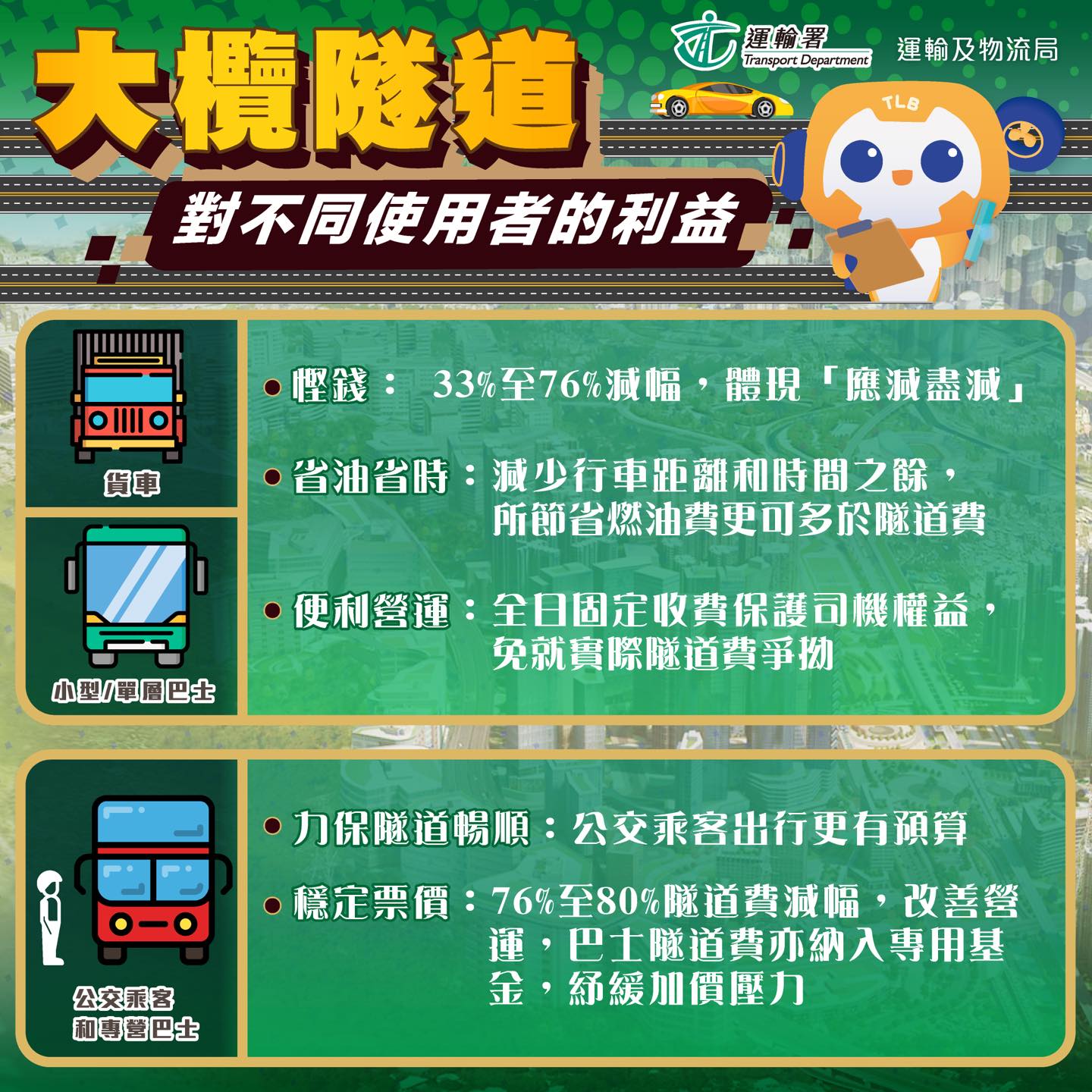 陳美寶指,隧道收費大幅下調可以令多方受惠。市民可善用大欖隧道剩餘容量 ,有助改善屯門公路的交通,出行可按需要更靈活選擇;在公交乘客方面,隧道仍能保持暢通,出行更有預算;的士則可吸引乘客選用隧道及全日劃一收費,有利業界營運;貨車及巴士可減少行車距離和時間,節省燃油費,全日劃一收費亦免爭拗;至於私家車亦可走更便捷和更舒適路線。