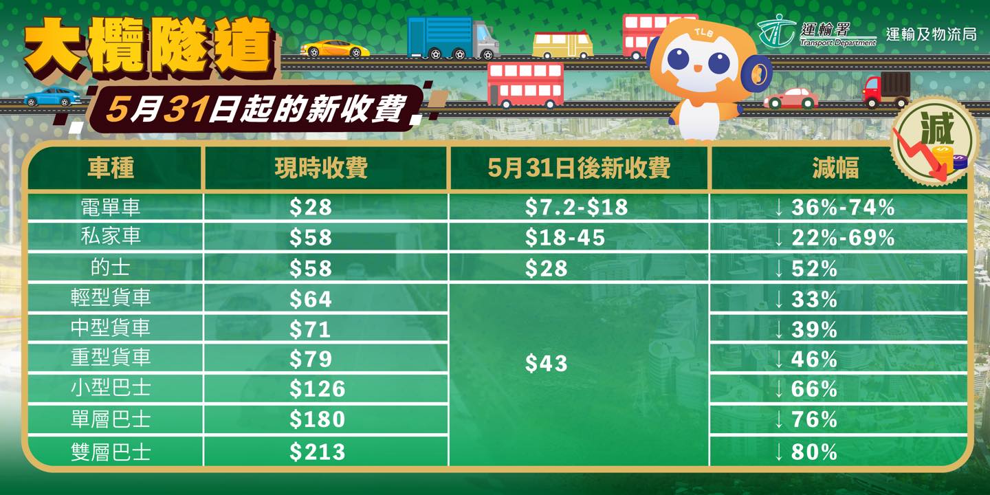 陳美寶表示,5月31日起,所有車種的隧道收費比現時將大幅下調,做到「可減盡減」。當中,私家車由58元減至繁忙時段45元、一般時段30元、非繁忙時段18元,減幅達22%至69%;輕型貨車、中型貨車及重型貨車分別由64元、71元及79元減至全日劃一收費43元,減幅達33%至46%;而公共和私家小型巴士、單層巴士及雙層巴士分別由126元、180元及213元減至全日劃一收費43元,減幅達66%至80%;至於的士由58元減至28元,減幅達52%。