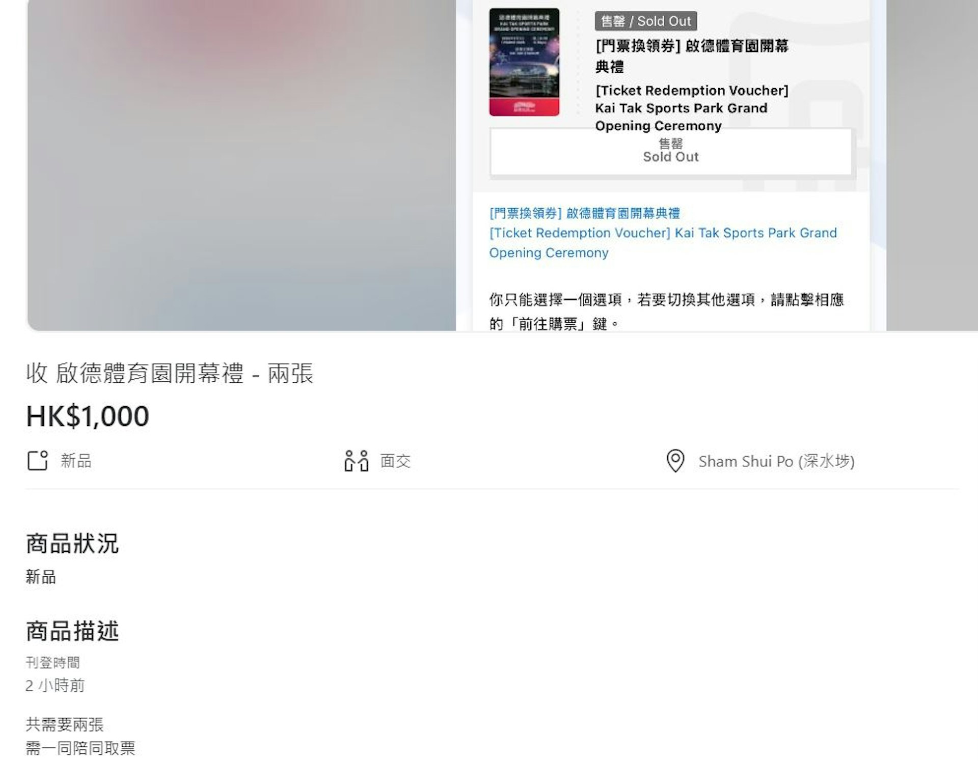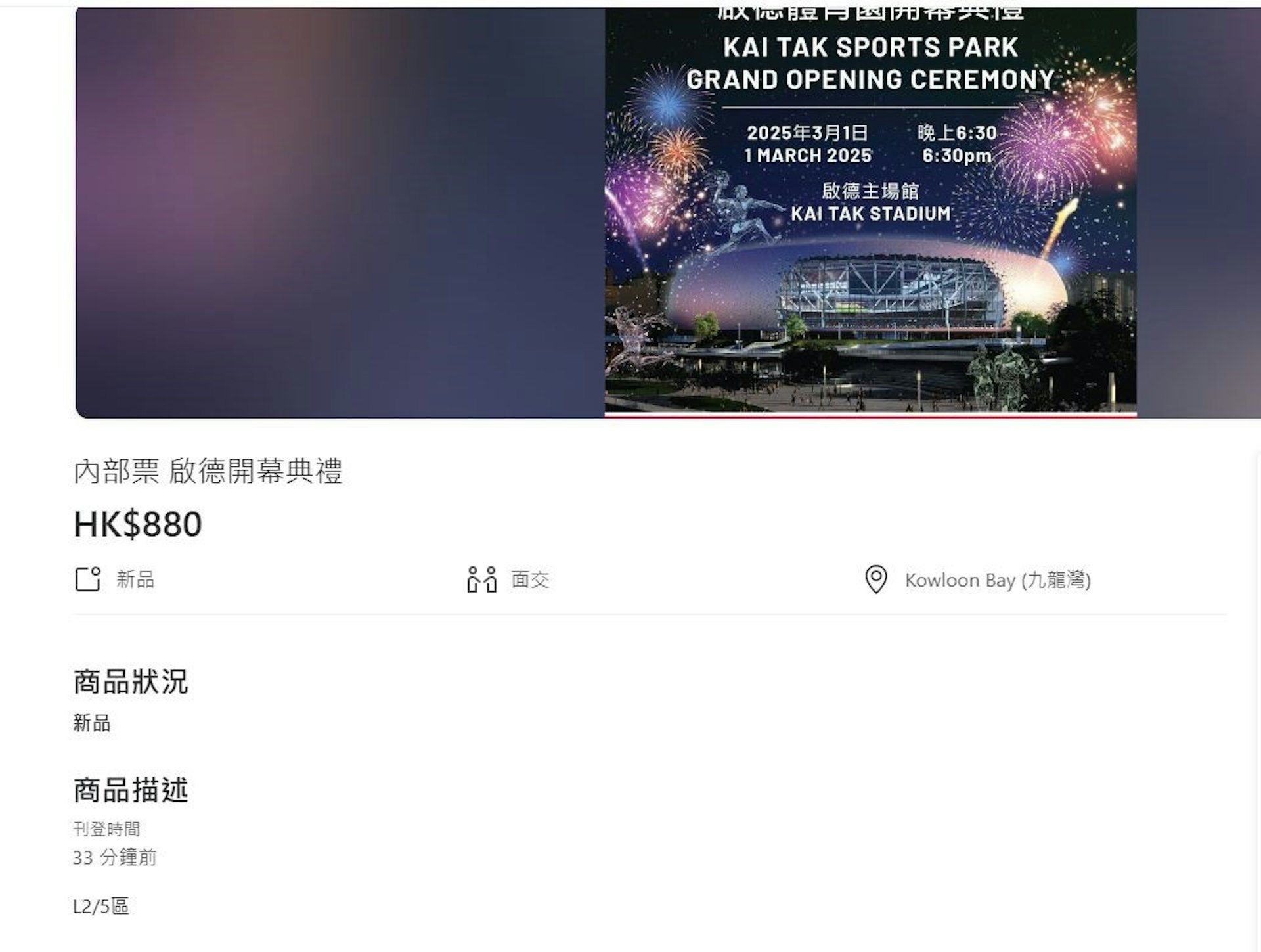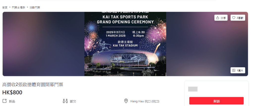 啟德體育園3月1日開幕禮的8500張公眾門票今早(21日)10時開售,約半小時就已全部售罄。惟網上交易平台即刻出現炒賣「黃牛飛」情況,標價最高達1800元。