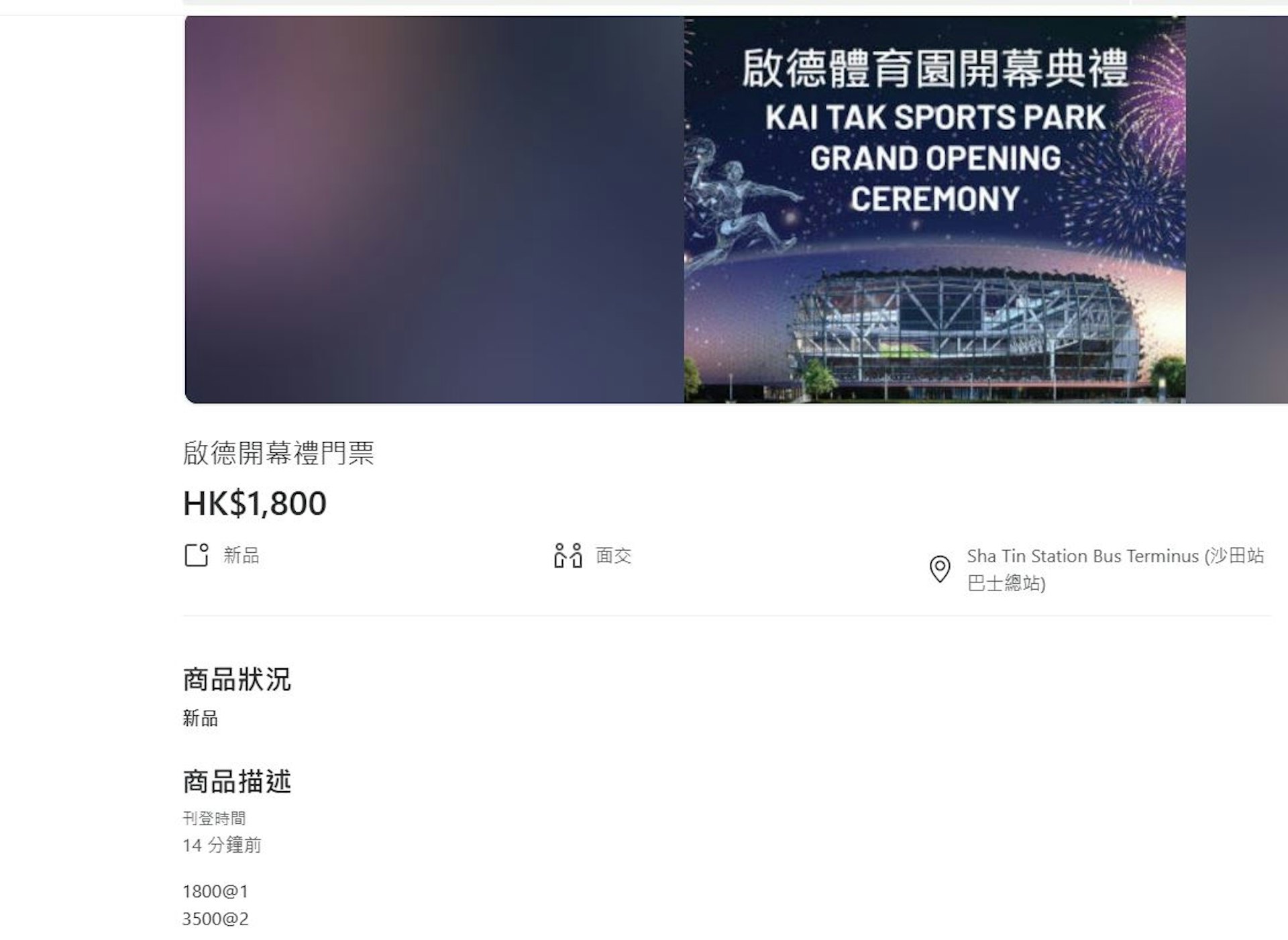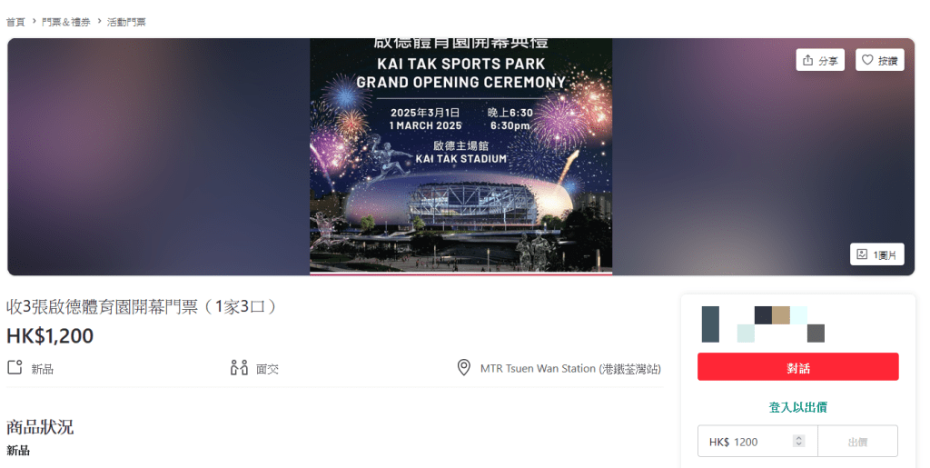 根據網上交易平台顯示,有多張啟德體育園開幕禮的門票發售,售價由300至1800元一張不等,2張售3500元,較原價10元貴180倍;亦有未能買到票的人在平台收門票,收價約為400元一張。