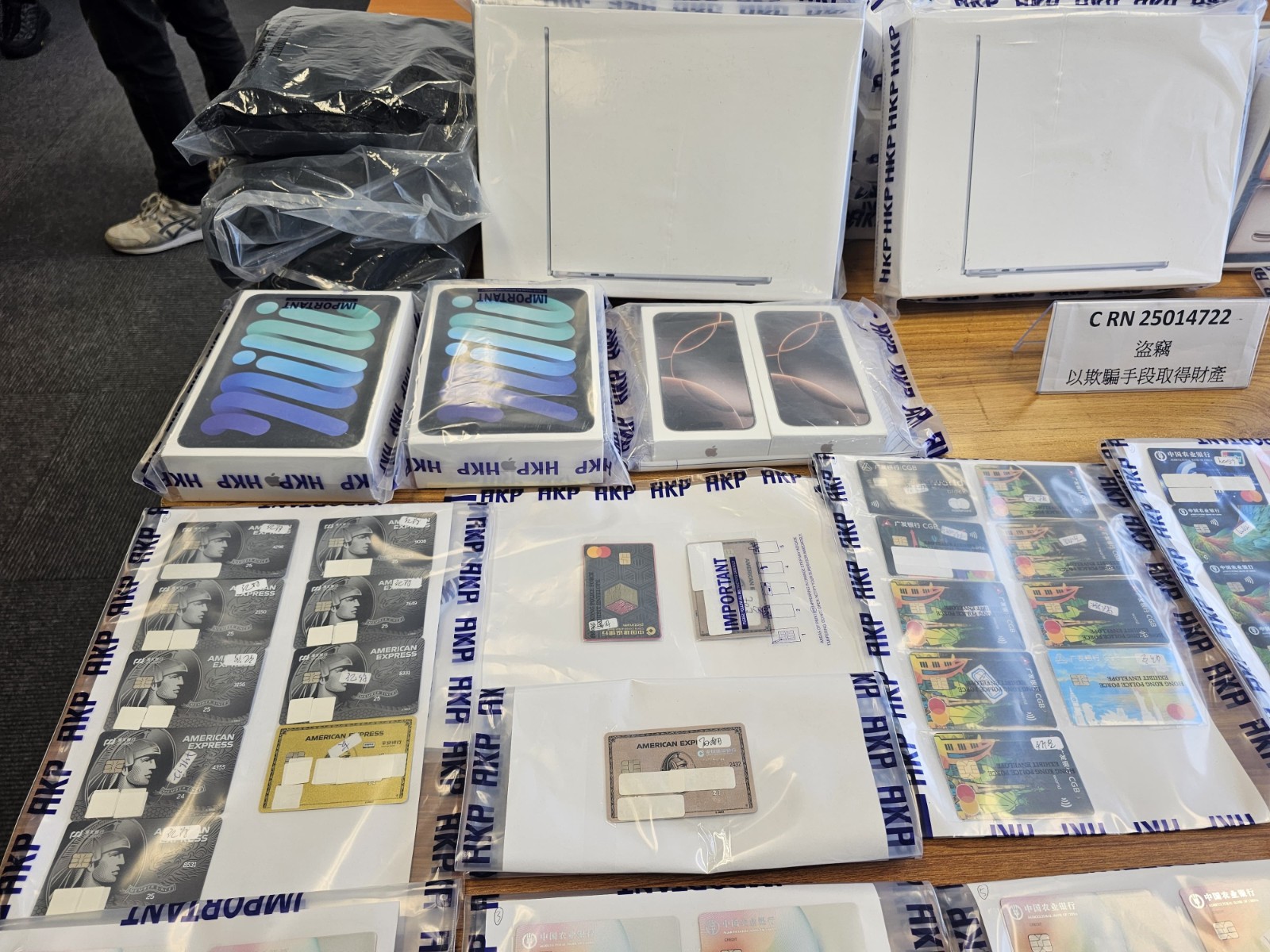 中區警區科技及財富調查組高級督察袁穎喬今日(3日)表示,中區警區特遣隊人員前日在中環國際金融中心商場進行反罪惡巡邏,期間發現兩名男子進入商場內一間電子產品商店內購物,形跡可疑,兩人其後購買產品後離開,人員上前截停調查,搜出6張屬於他人的信用卡及65張購賬卡,兩人持有共2部手提電腦和3部平板電腦,價值約3.4萬元,遂將兩人拘捕。