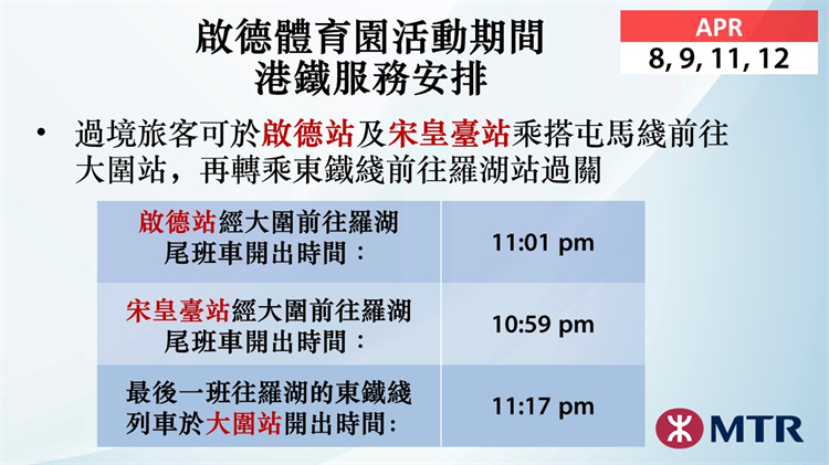 預計演唱會於晚上10 時後結束,過境旅客可於啟德或宋皇臺站乘搭屯馬線前往大圍站,再轉乘東鐵線前往羅湖站過關。公司特別提醒過境旅客留意屯馬線轉乘東鐵線往羅湖站的尾班車時間,呼籲過境旅客提早計劃行程,選擇適合自己行程的交通工具。